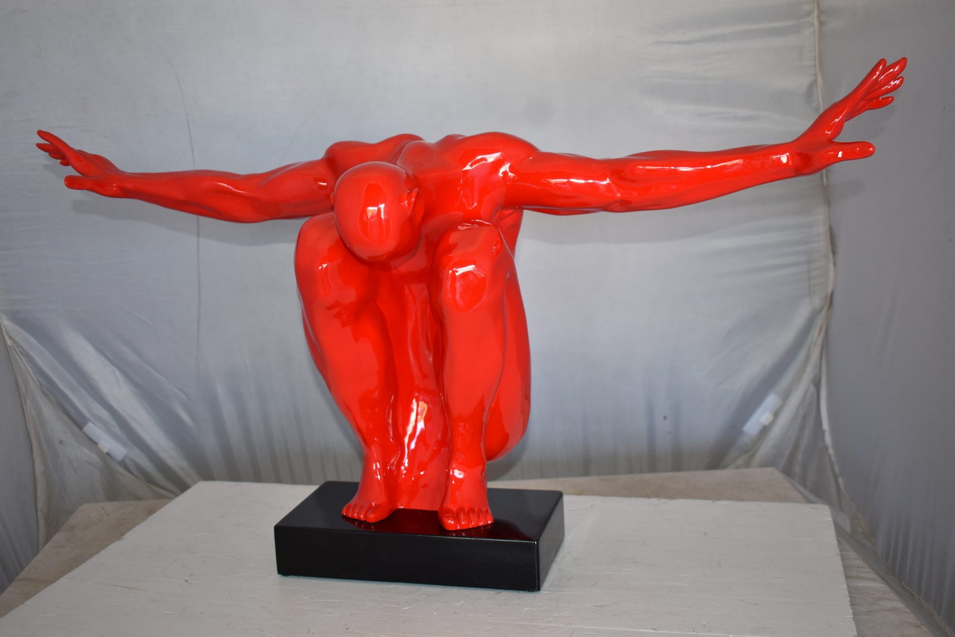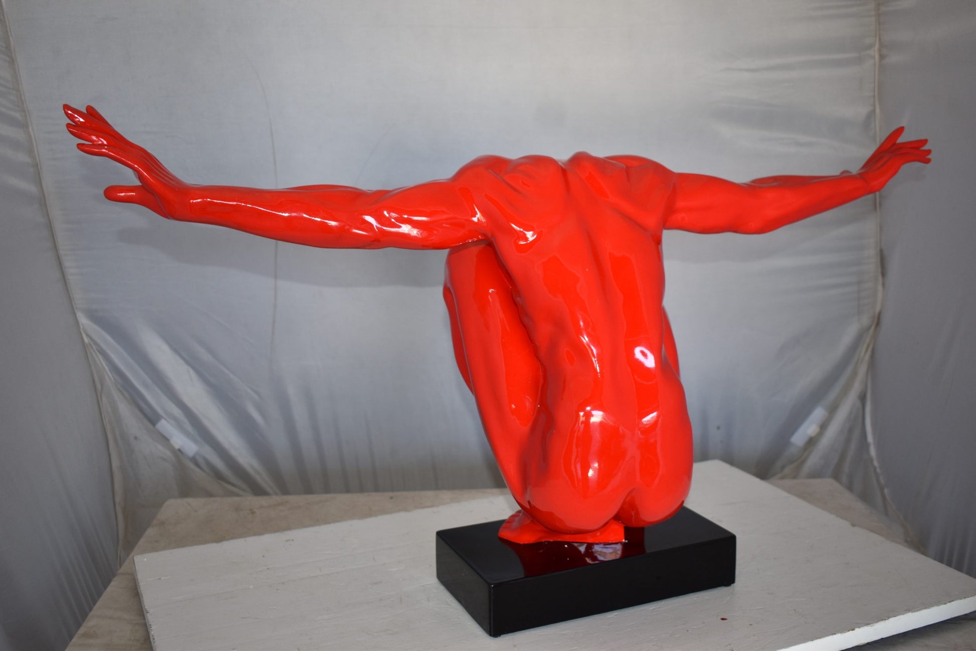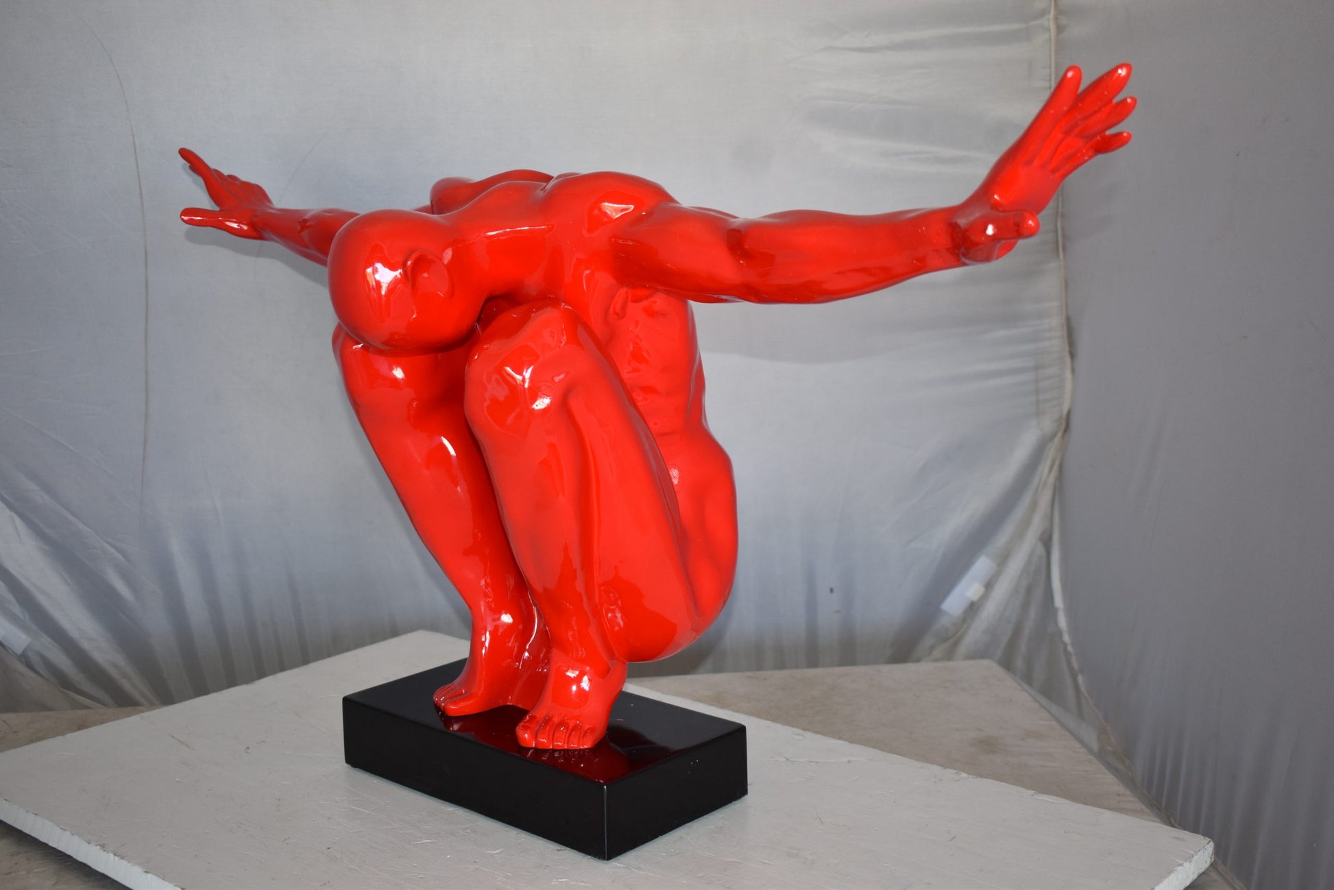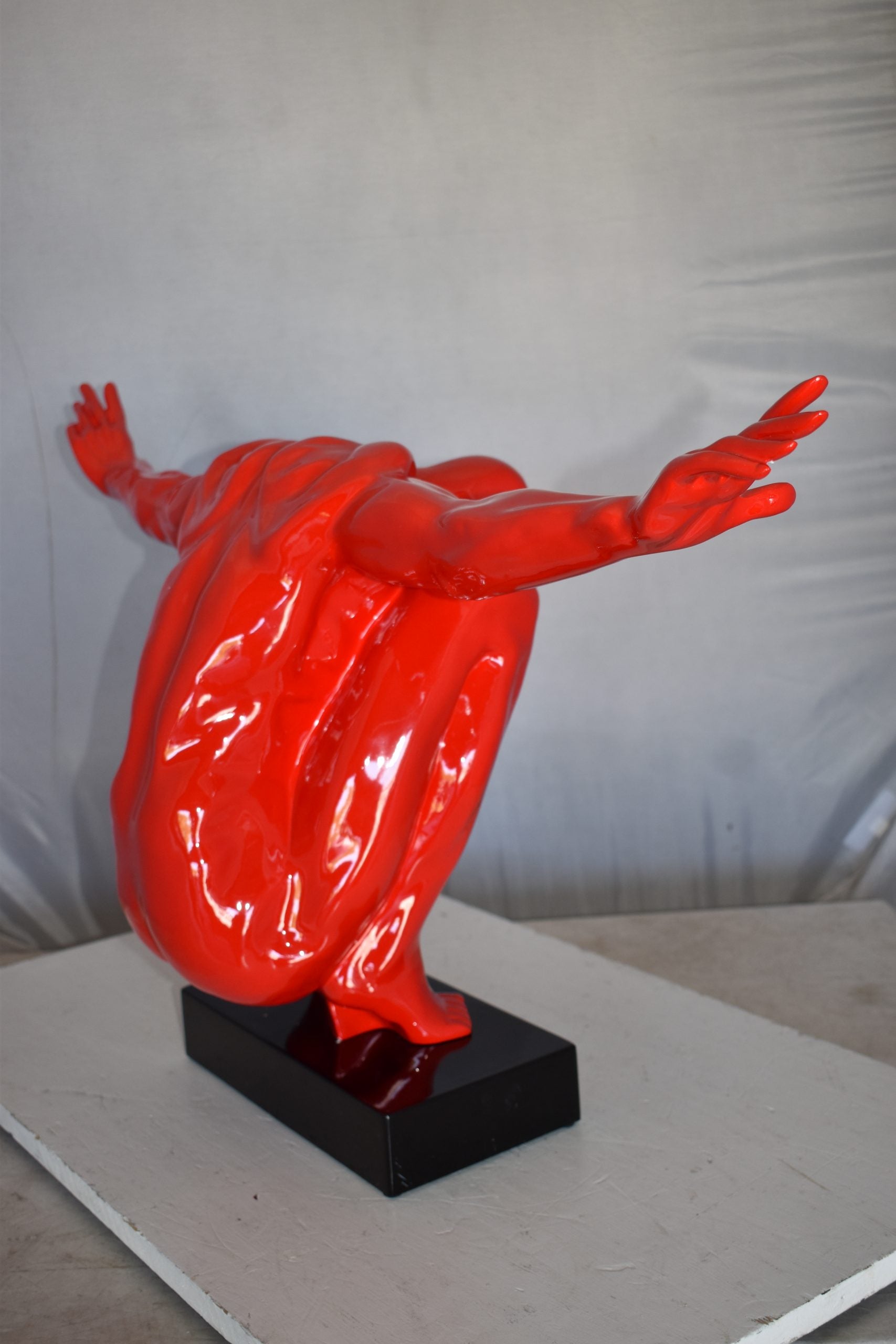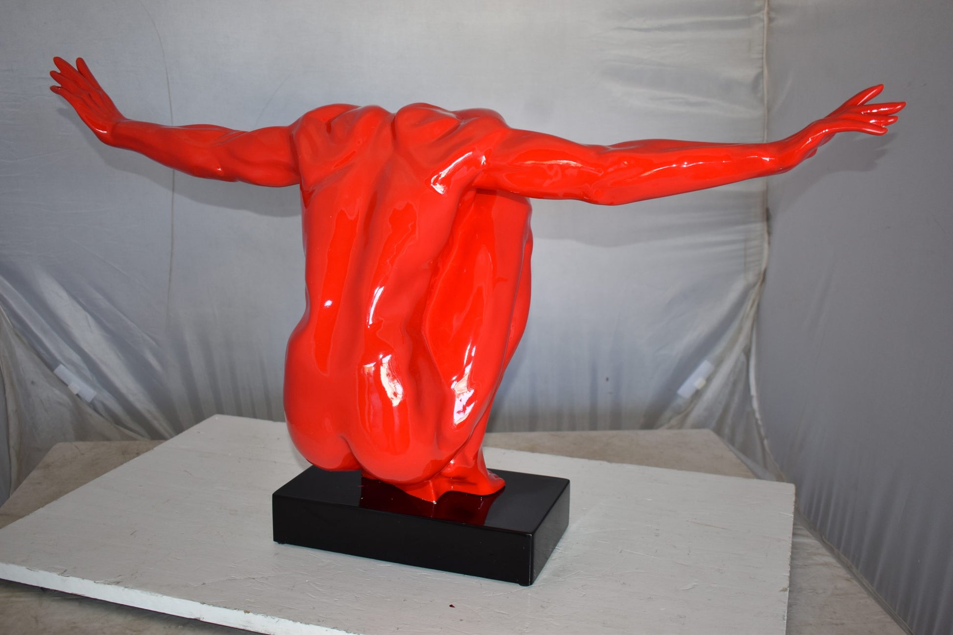 Enjoy this happy looking modern art of a red saluting body builder made of resin statue mounted on a base. This modern abstract would be a great addition to your home. Resin casting is a method of plastic casting where a mold is filled with a liquid synthetic resin, which then hardens. Get one for yourself or surprise a friend with an unforgettable gift! Size: 37"L x 14"W x 19"H. Weight is: 17Lb