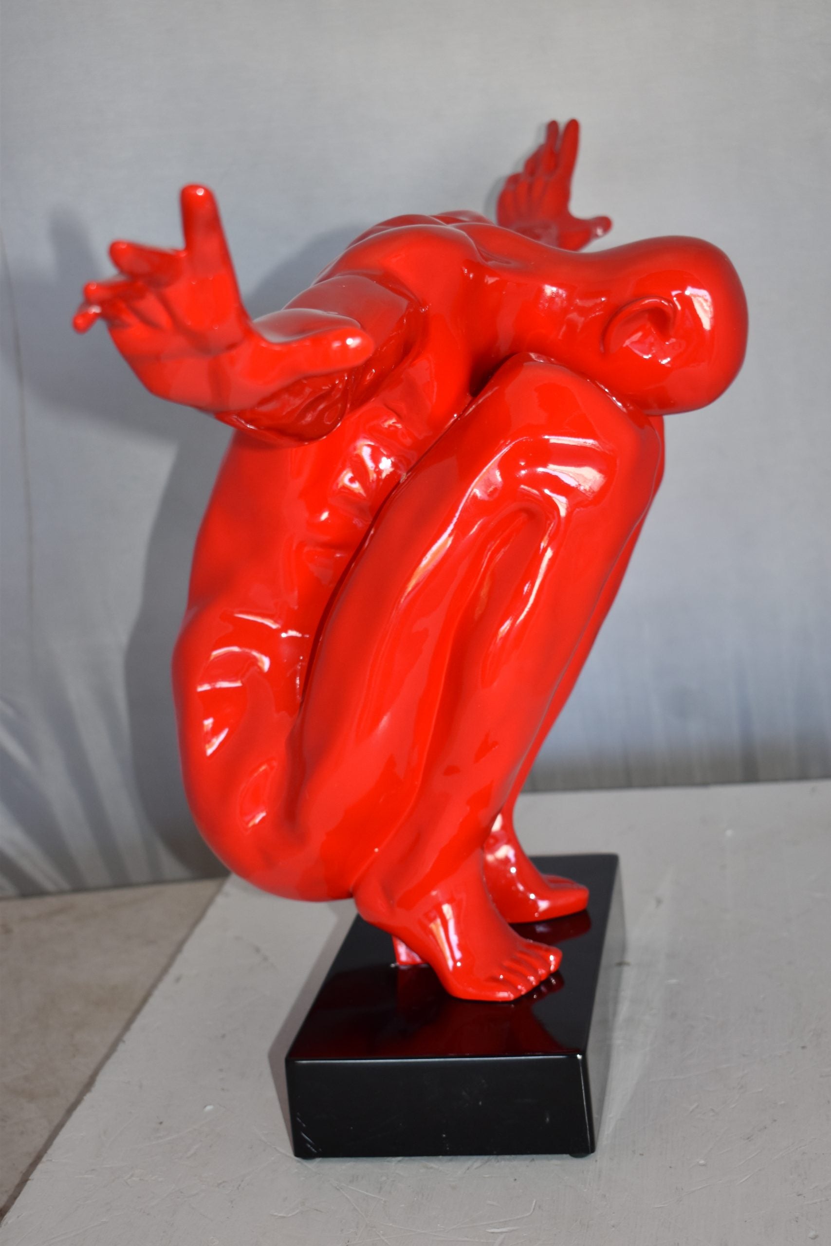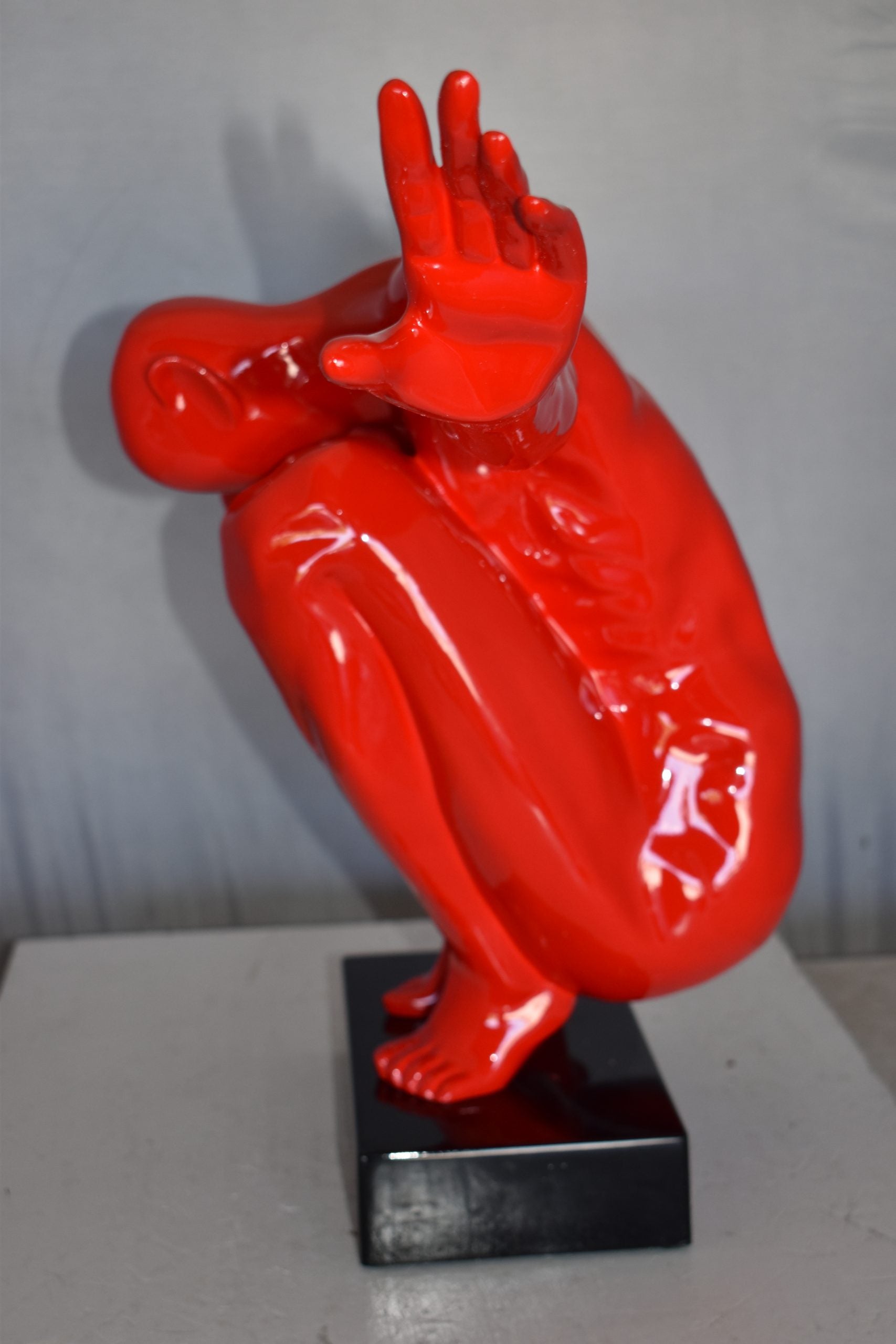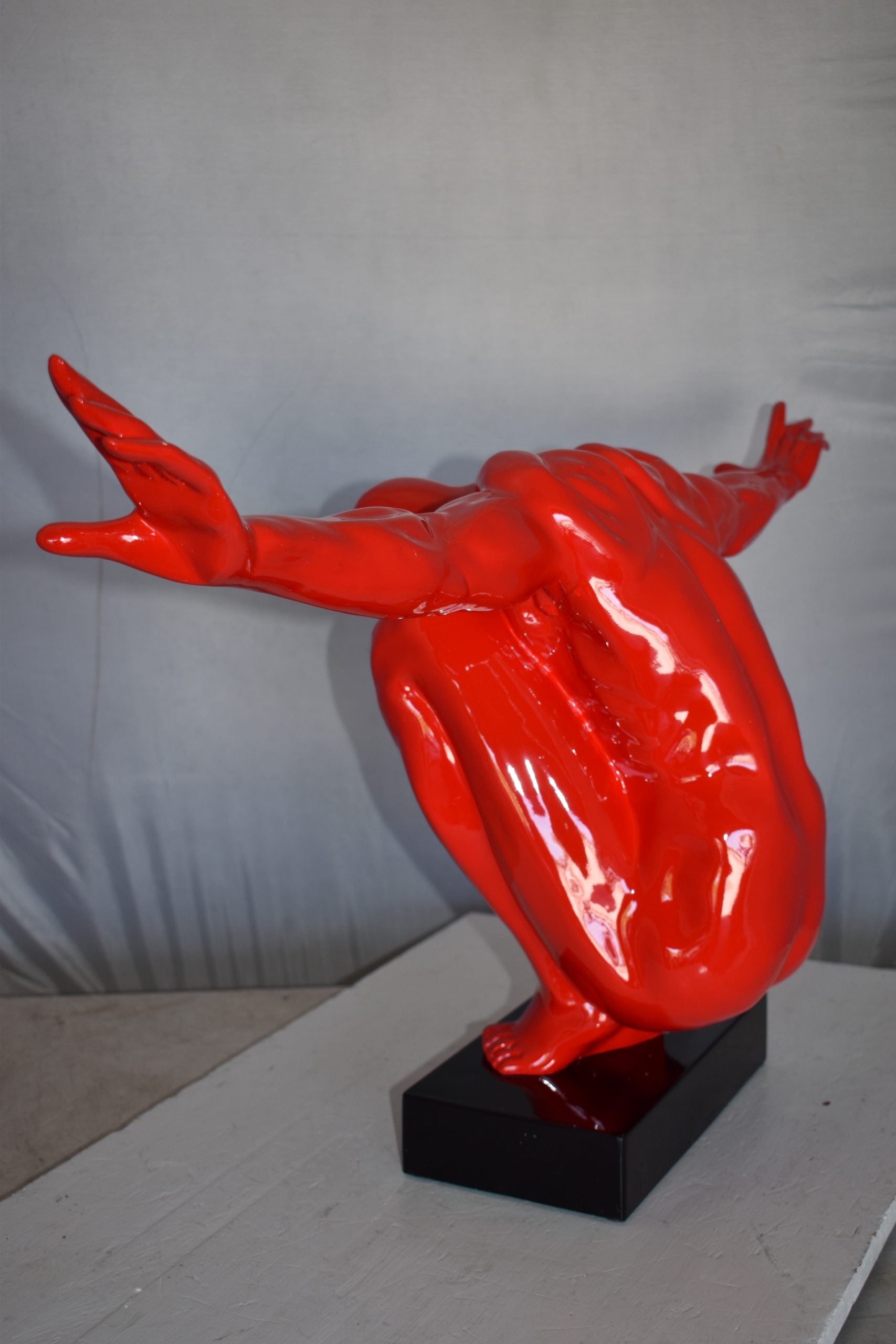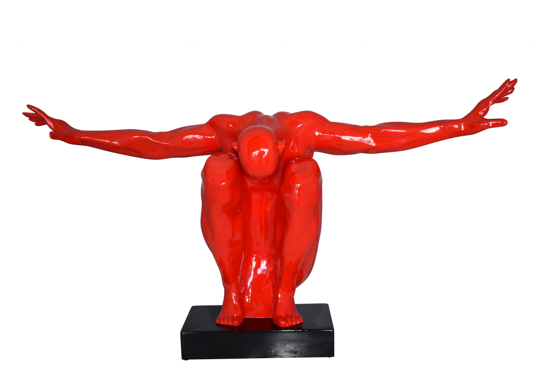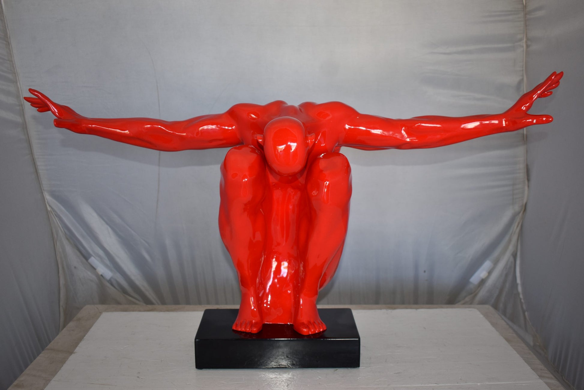 Enjoy this happy looking modern art of a red saluting body builder made of resin statue mounted on a base. This modern abstract would be a great addition to your home. Resin casting is a method of plastic casting where a mold is filled with a liquid synthetic resin, which then hardens. Get one for yourself or surprise a friend with an unforgettable gift! Size: 37"L x 14"W x 19"H. Weight is: 17Lb