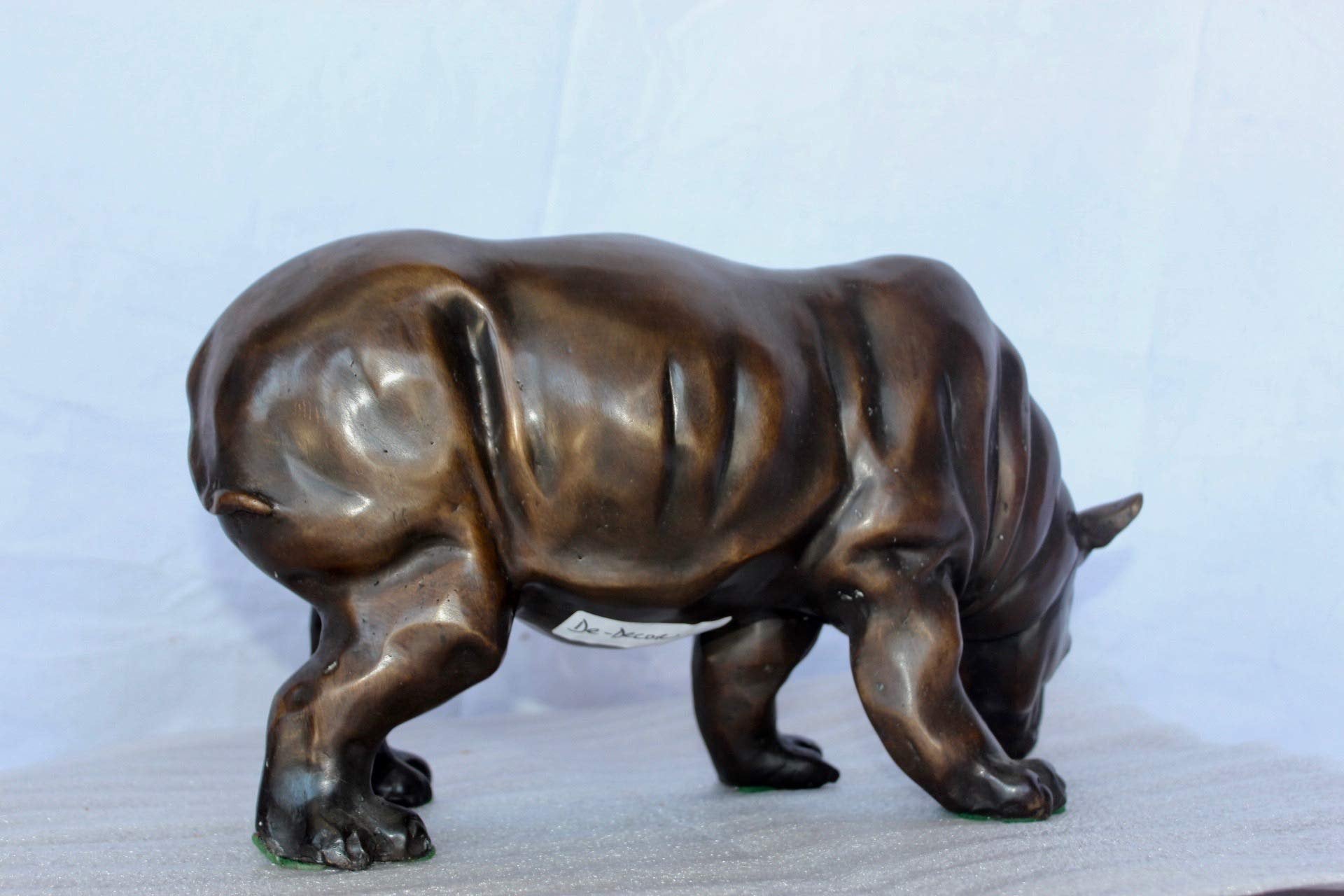 This statue of a relaxed rhino with his head learning down illustrates a rhino in a calm state on shore. Each line and detail in this smal bronze statue highlights the true shape and build of a real life rhinosarus. This piece would be perfect for any animal lover and would fit well in an home room or office. Size: 16"L x 9"W x 8"H. Weight is: 12Lb