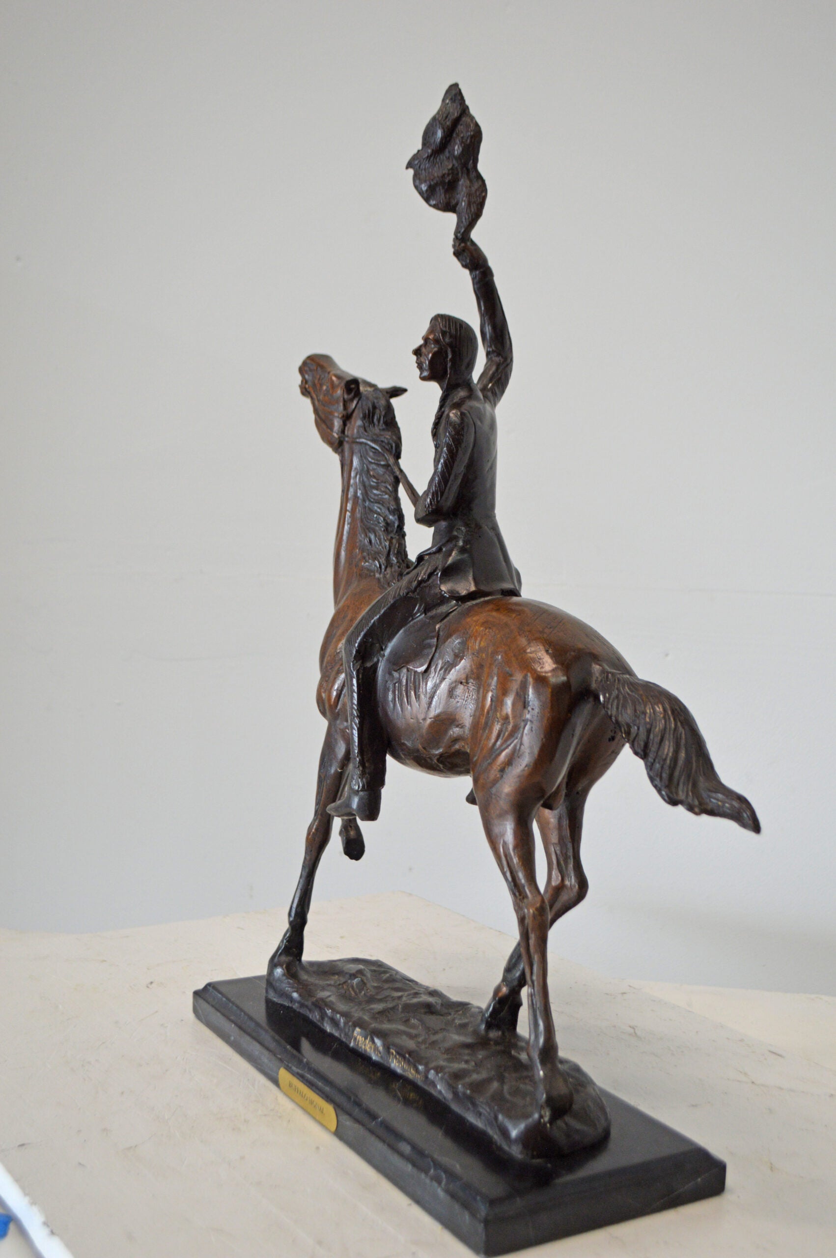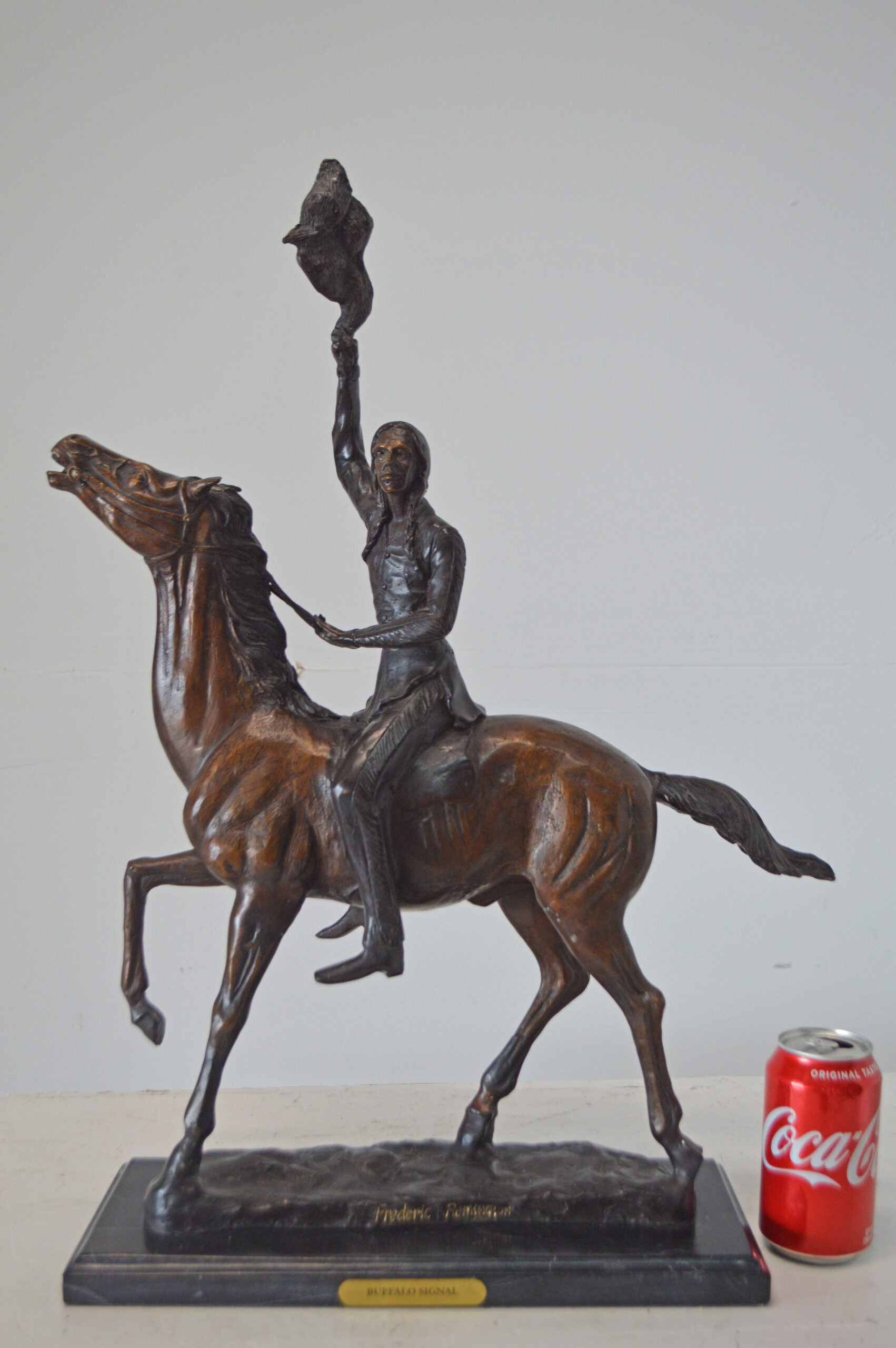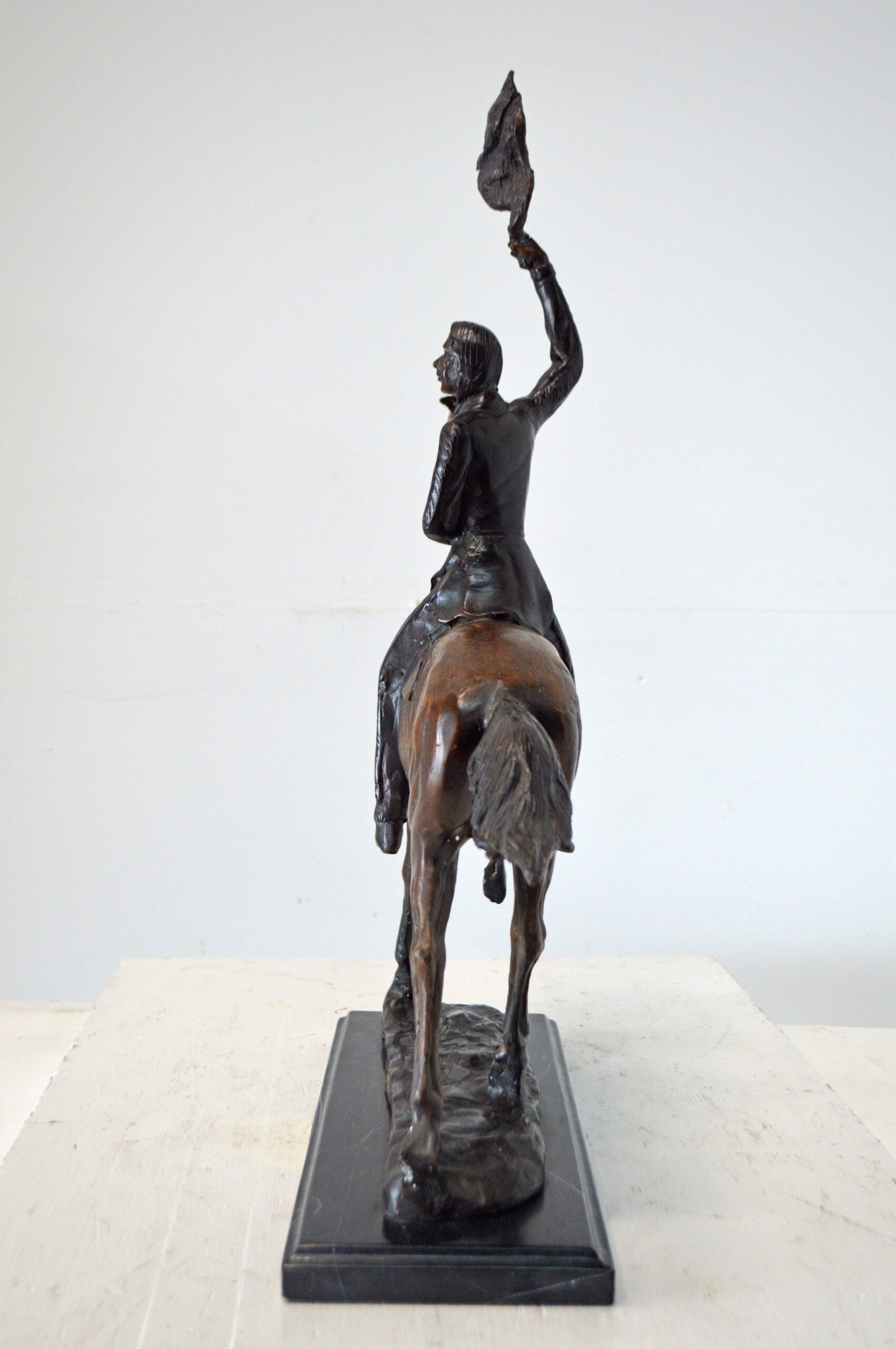 The Remington - inspired Bronze Statue, Scalp, represents a Proud, Resilient, Strong and a Fierce Warrior, This Native American Watches Over His Land and Tribe. Great Attention to Detail Was Paid to his Clothing. Most Indian Men Did Not Use Shirts, But He Wears A Breech Cloth- A Long Rectangular Piece of Hide or Cloth Tucked Over His Belt, Which Hangs in The Front and Back. He Also Wears Moccasins. Mounted on His Horse, He Turns His Head Toward the Sky and Holds Up A Feather. His Gaze Is Almost Pleading. This pure Bronze is Handmade, Carefully Detailed sculpture, was Cast Using the lost Wax Method and Mounted on a Marble Base. Size: 15"L x 7"W x 19"H. Weight is: 19Lb