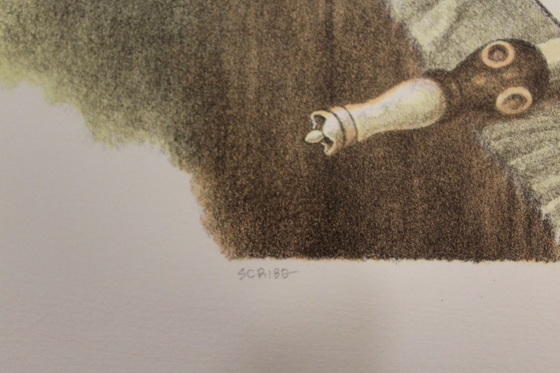 Emanuel Schary's "Scribe" Lithograph, adorned with subtle hues, captures the profound act of an elderly scribe meticulously transcribing the Torah. Soft colors accentuate the reverence in each stroke, highlighting the timeless devotion and spiritual significance infused into the sacred script, inviting viewers into a world where tradition is gently illuminated with quiet, enduring beauty. Size: 15"L x 10"W x "H. Weight is: 2Lb