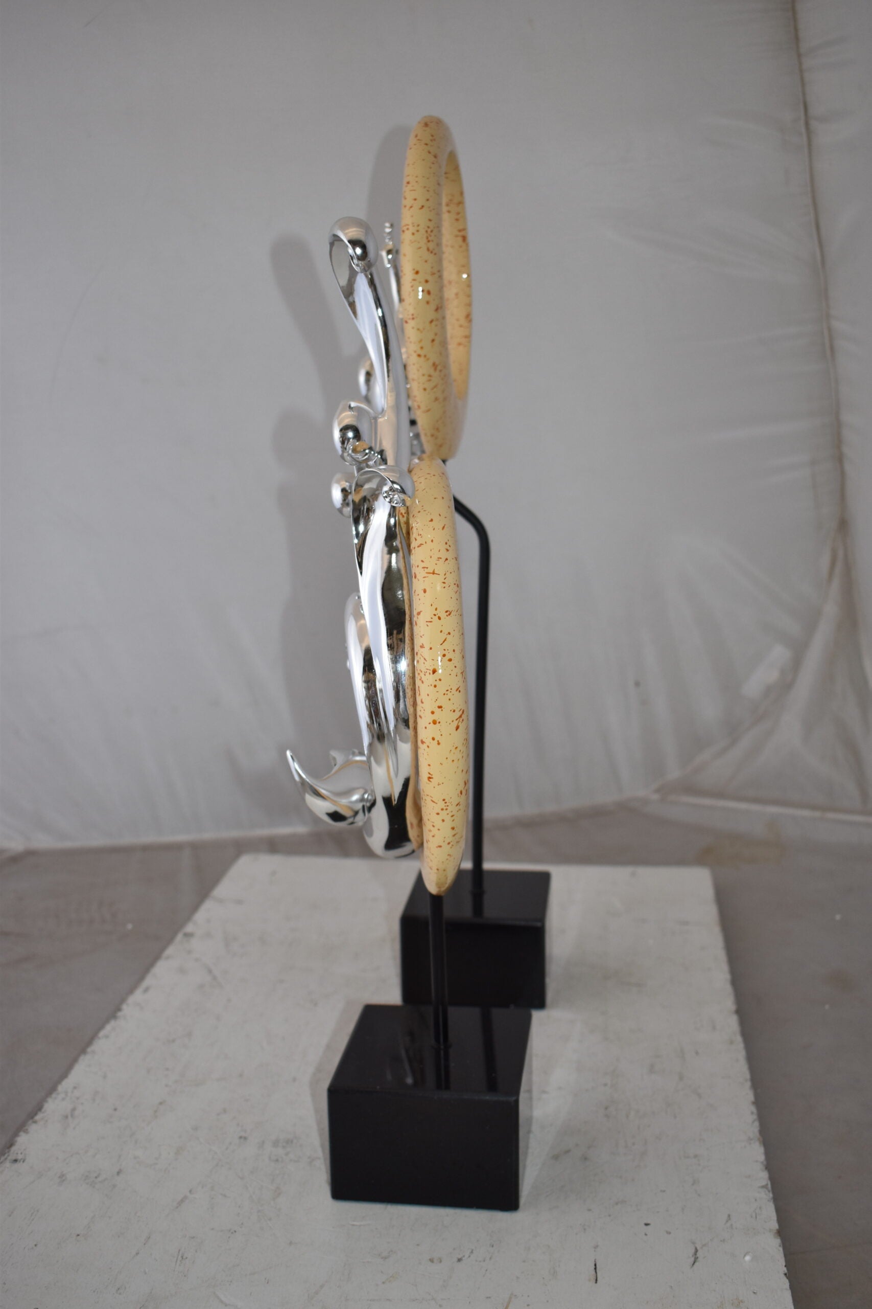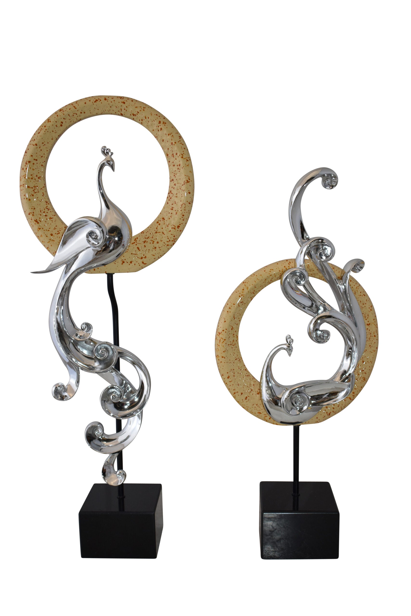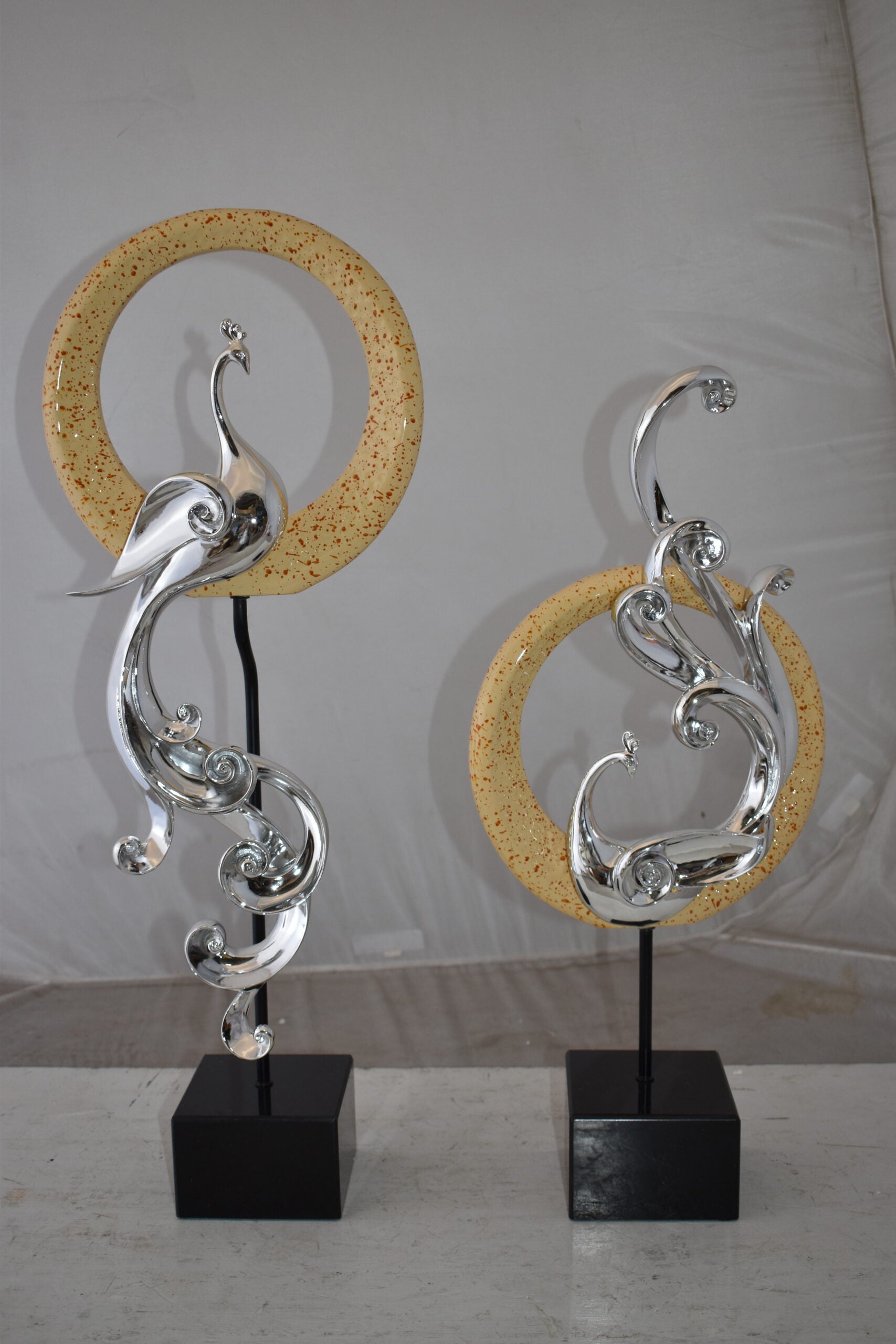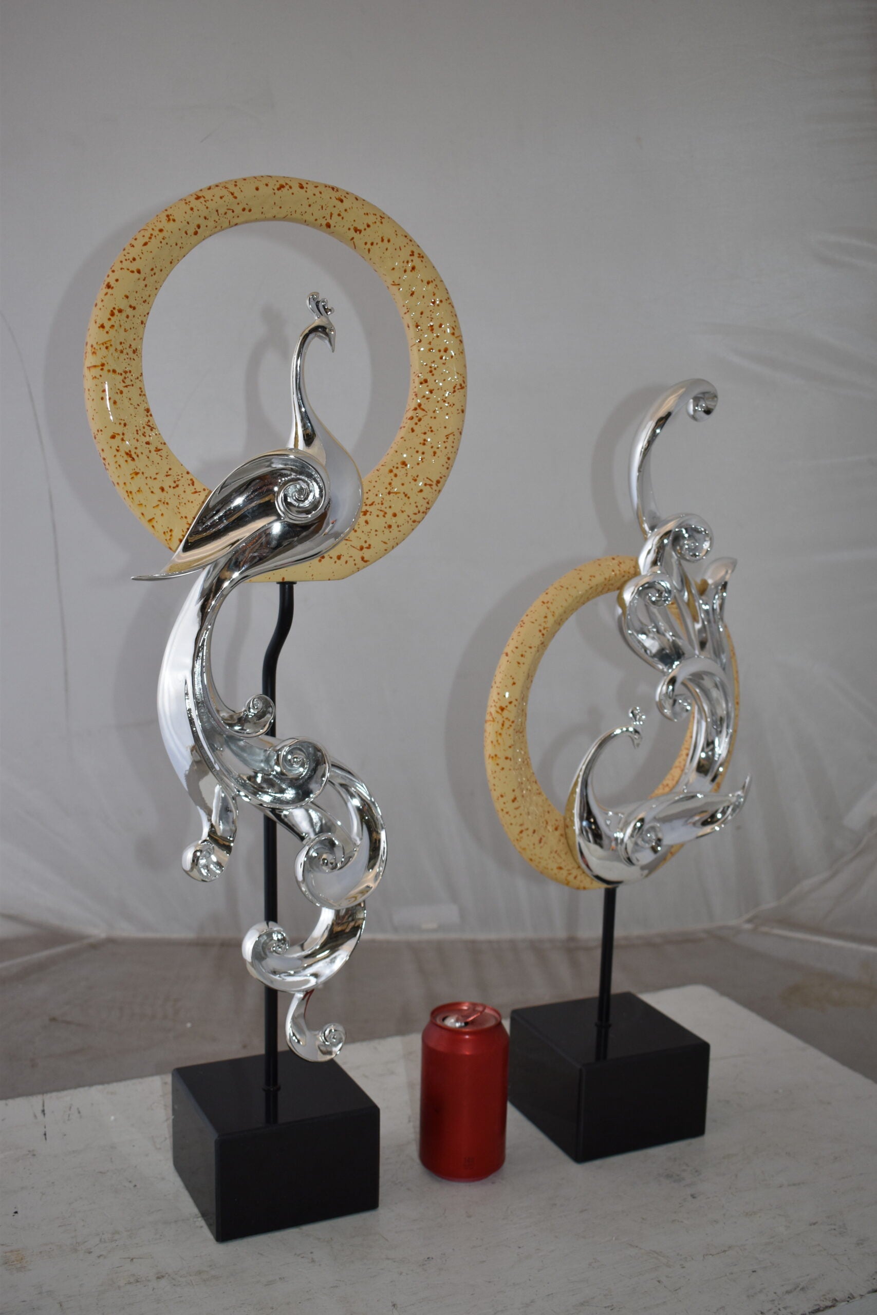 Enhance any space with this elegant set of graceful peacocks sitting in front of modern yellow patterned rings. This unique and exquisite silver and yellow piece will pair beautifully with modern furniture in any home and will bring beauty and style. Size: 11"L x 6"W x 28"H. Weight is: 13Lb