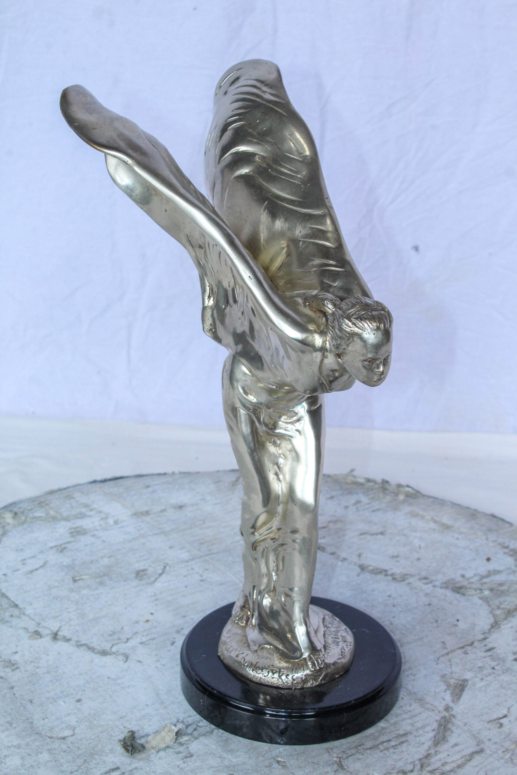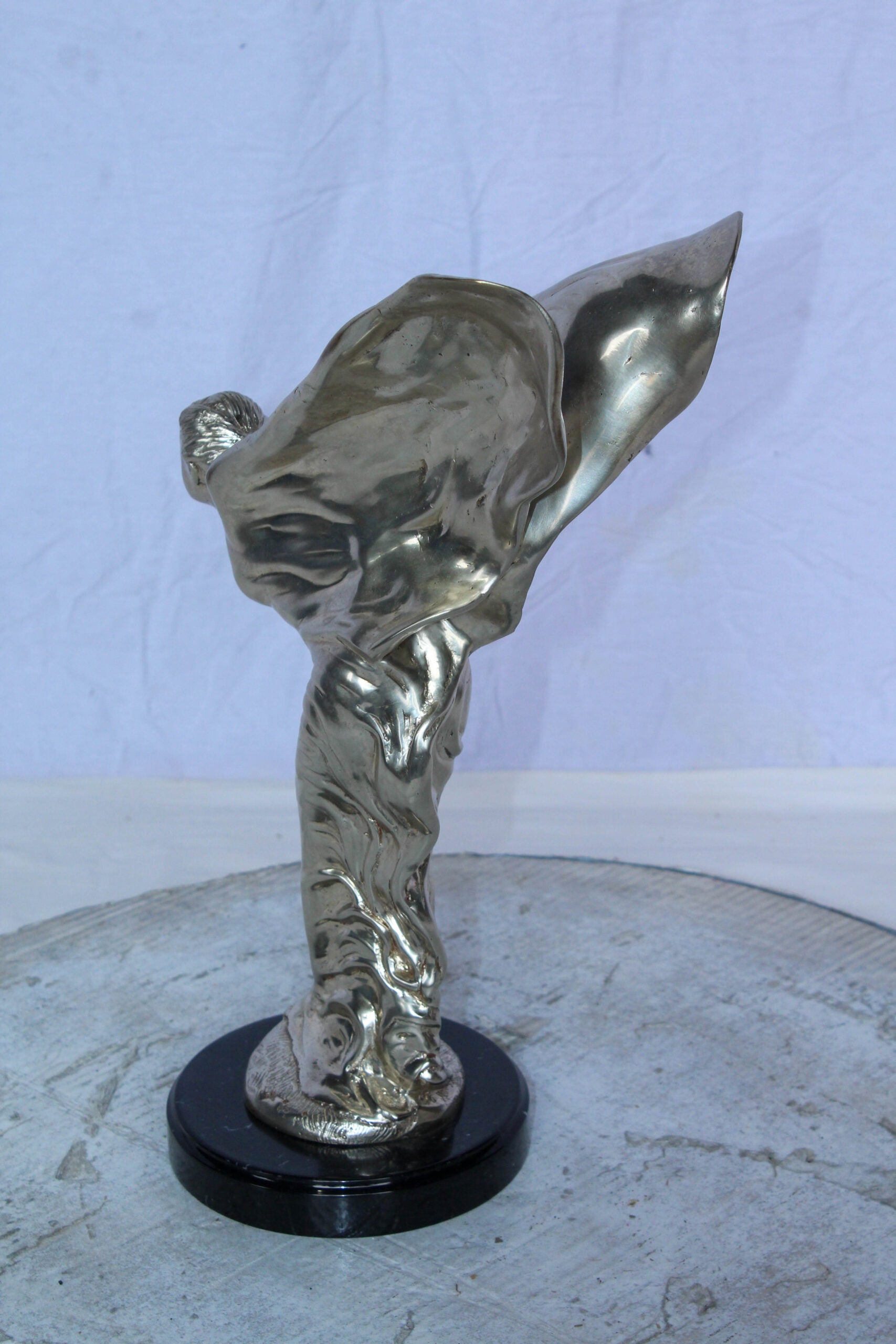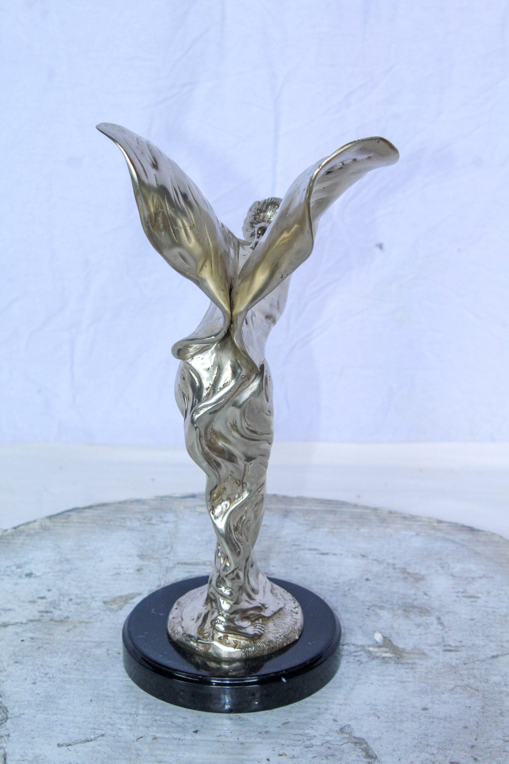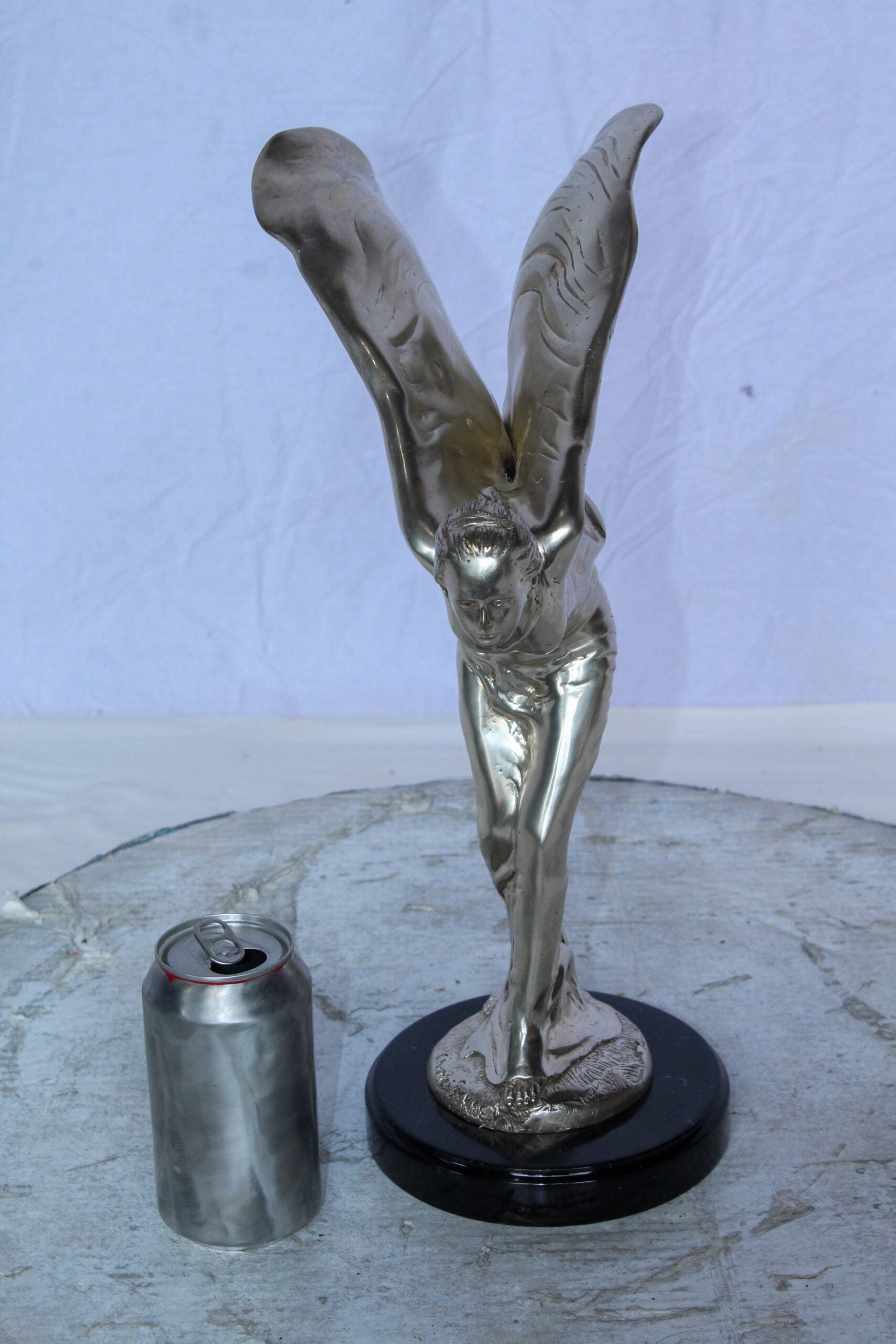 This elegant bronze statue is a replica of the iconic Spirit of Ecstasy, famously featured on Rolls Royce automobiles. It captures the grace and motion of the original design, with outstretched arms and flowing drapery that symbolizes speed and elegance. Crafted using the lost wax process, this piece showcases fine detail and a sleek silver finish, making it a refined display for car lovers and collectors alike. Size: 7"L x 11"W x 16"H. Weight: 9Lb
