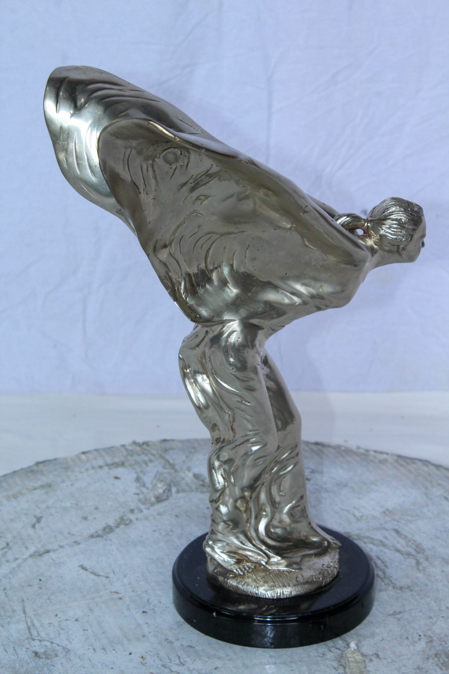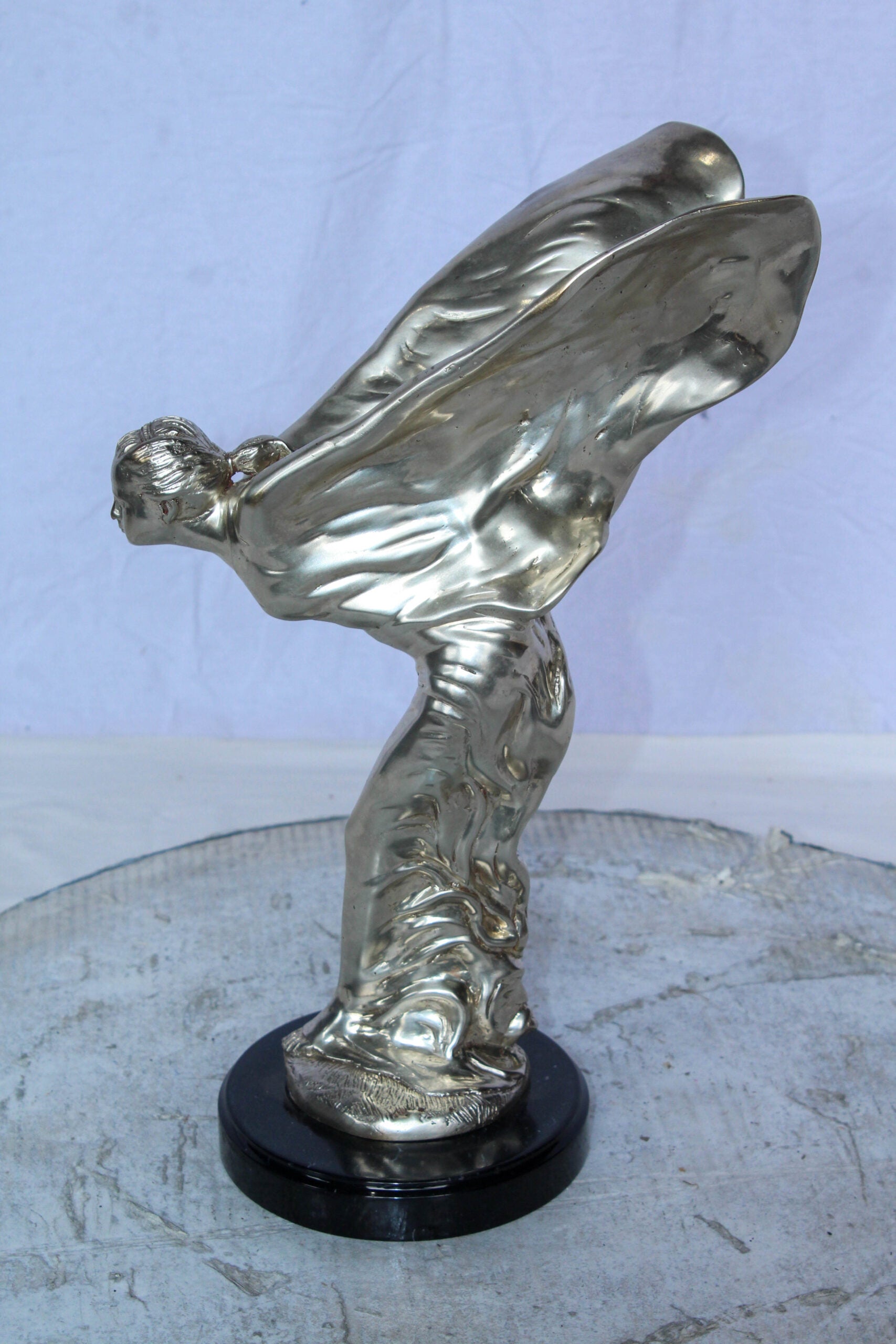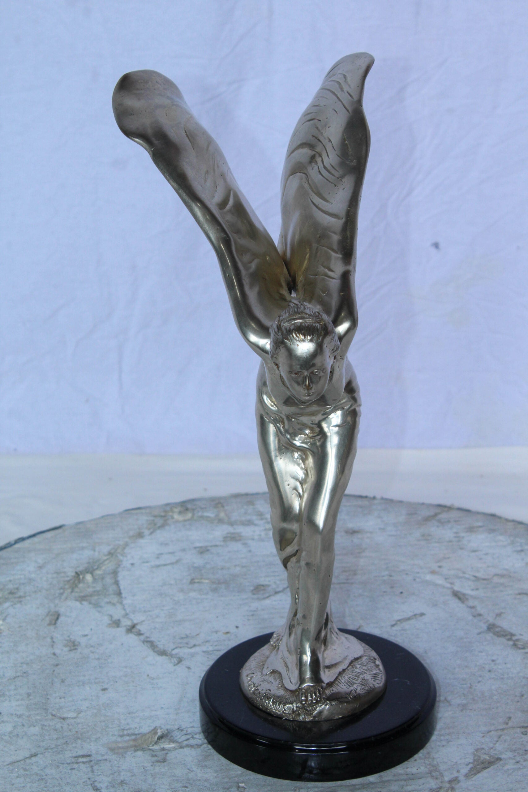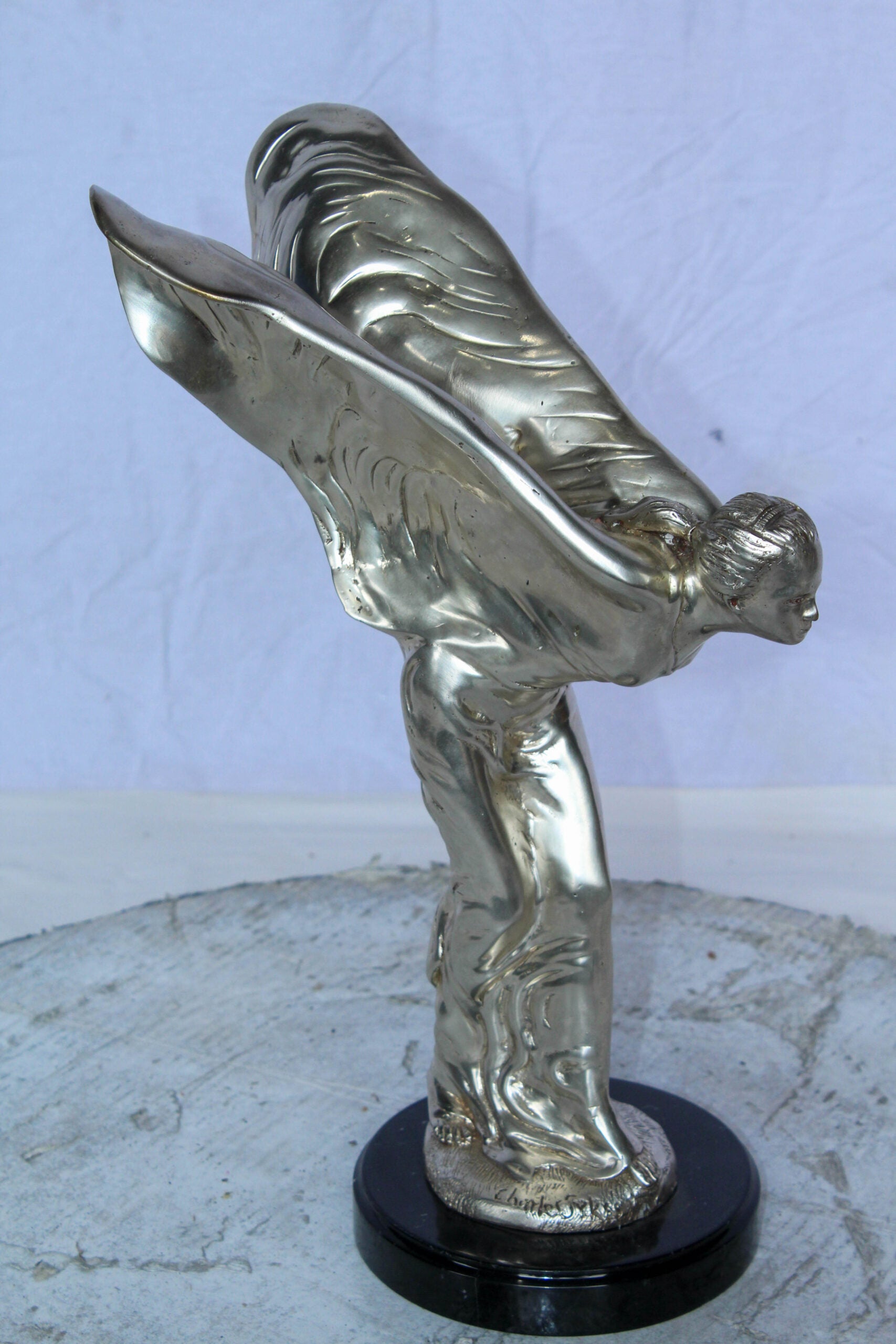 This elegant bronze statue is a replica of the iconic Spirit of Ecstasy, famously featured on Rolls Royce automobiles. It captures the grace and motion of the original design, with outstretched arms and flowing drapery that symbolizes speed and elegance. Crafted using the lost wax process, this piece showcases fine detail and a sleek silver finish, making it a refined display for car lovers and collectors alike. Size: 7"L x 11"W x 16"H. Weight: 9Lb