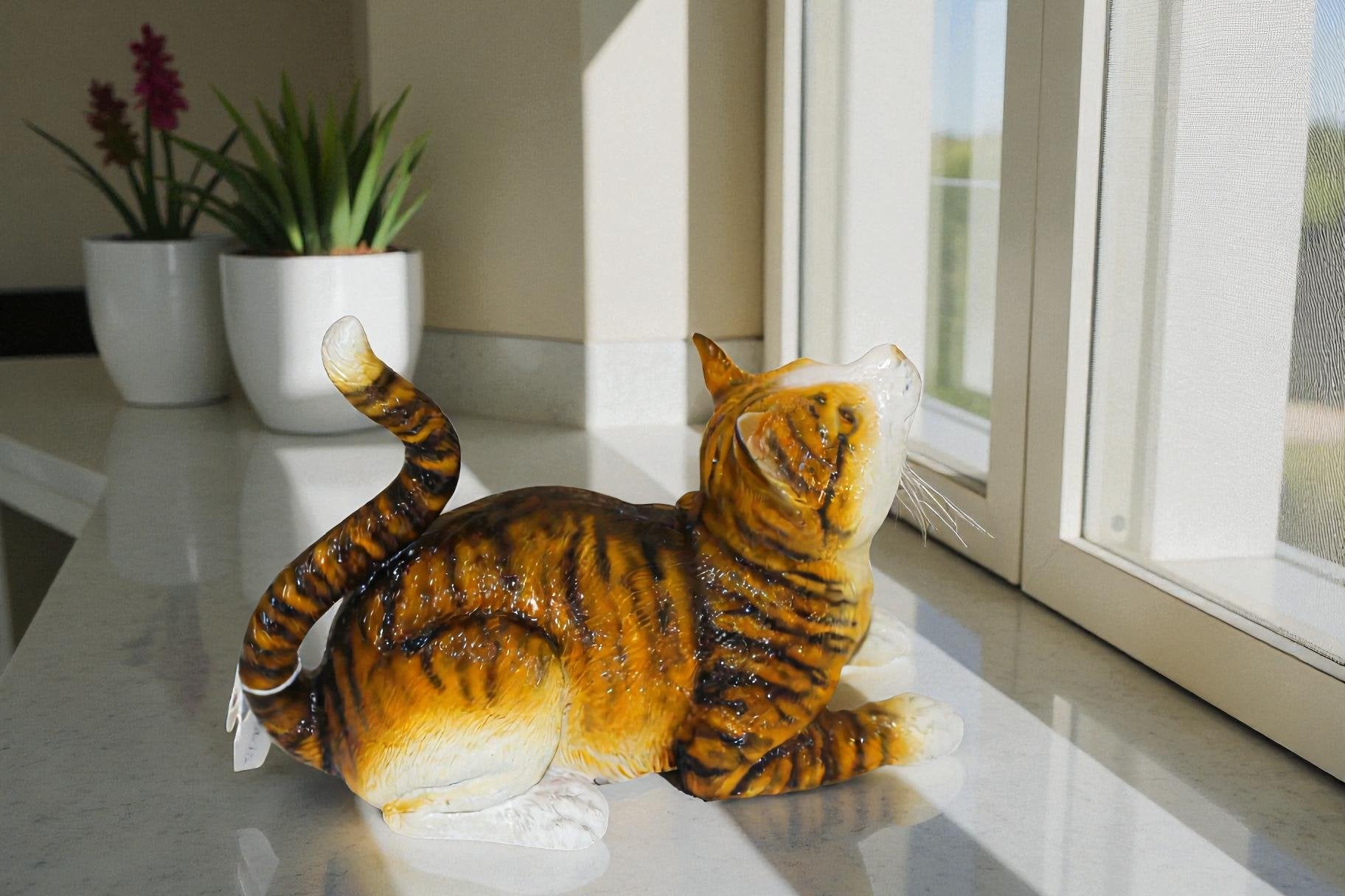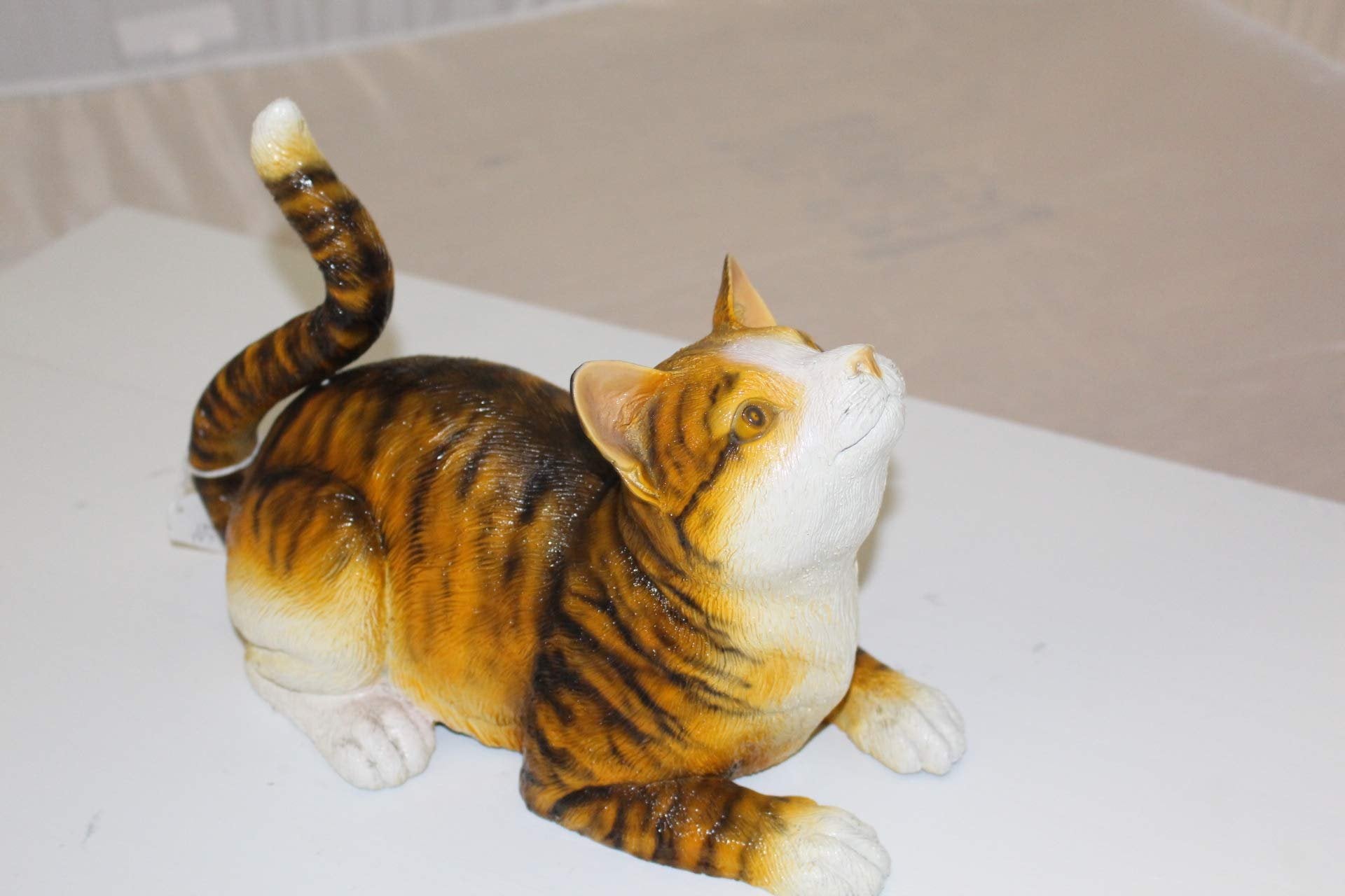 This squatting cat sculpture would fit perfectly in the home of any cat and/or animal lover! The cat is ready to pounce towards the sky, as if there's a ball or a loving owner waiting for him. This piece can fit great in the home, lawn, patio, or anywhere else. Size: 12"L x 6"W x 9"H. Weight is: 6Lb