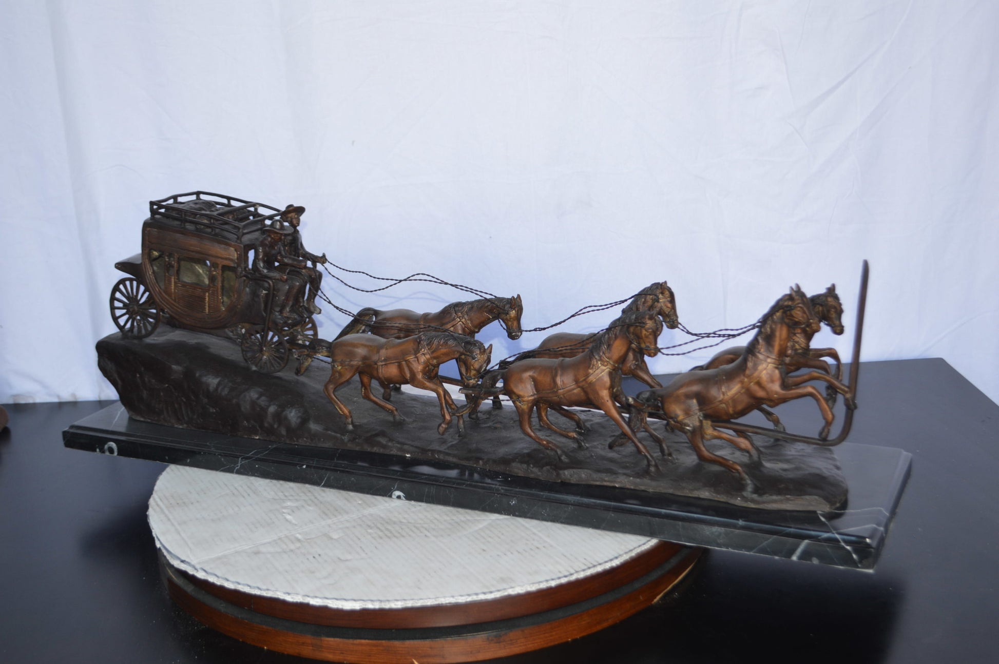 The Charles Marion Russell - inspired Bronze Statue, Stagecoach, mounted on a marble base depicts a scene from the Wild West. The Stagecoach Sculpture by Charles Marion Russell is a beautiful bronze sculpture depicting the stagecoach driver and his team of horses pulling a stagecoach down the steep embankment. Exquisite details show the strength and stamina of the team of horses, while the driver's face aptly shows his level of concentration. Get a feel for the excitement and adventure that is associated the Old West with this remarkable piece. This replica will add another perspective of the American history to your home. Size: 38"L x 10"W x 12"H. Weight is: 72Lb