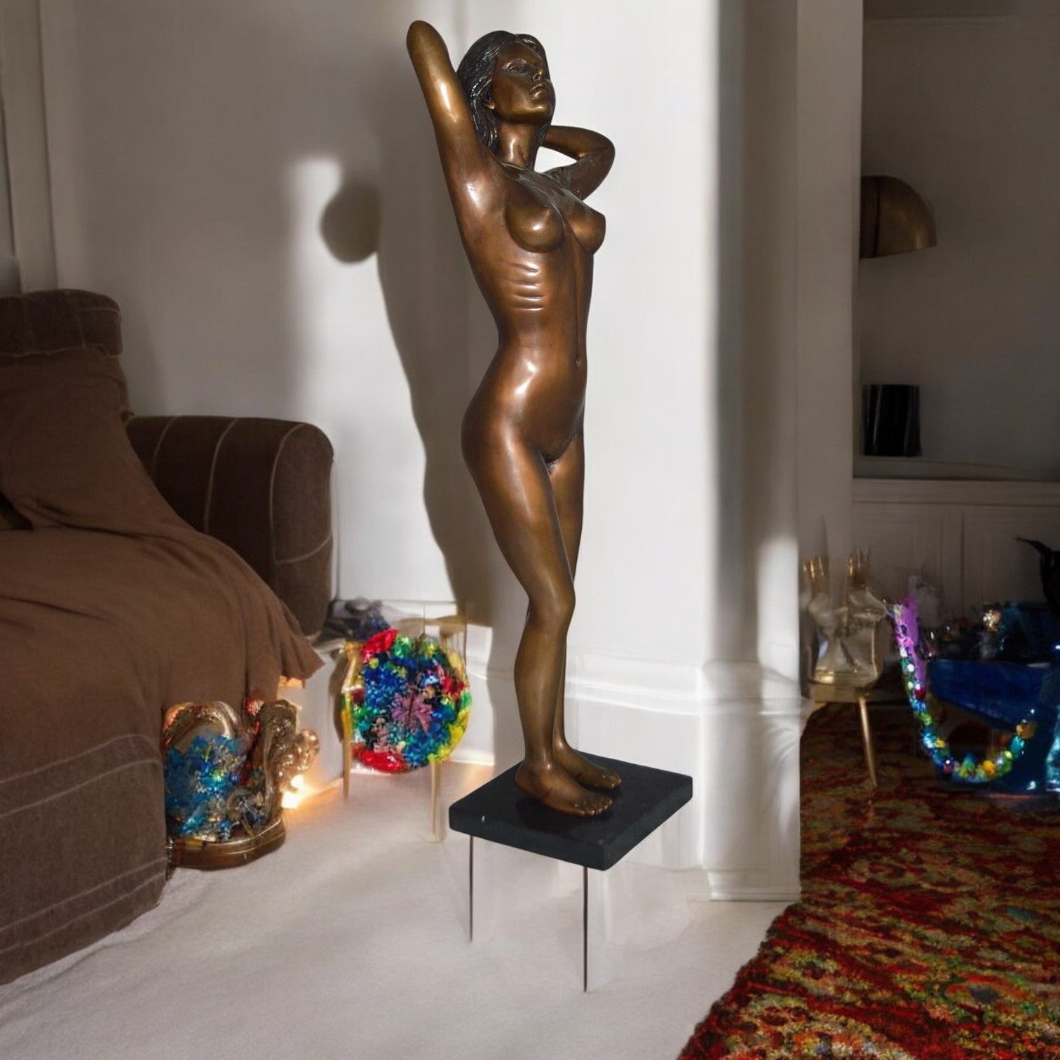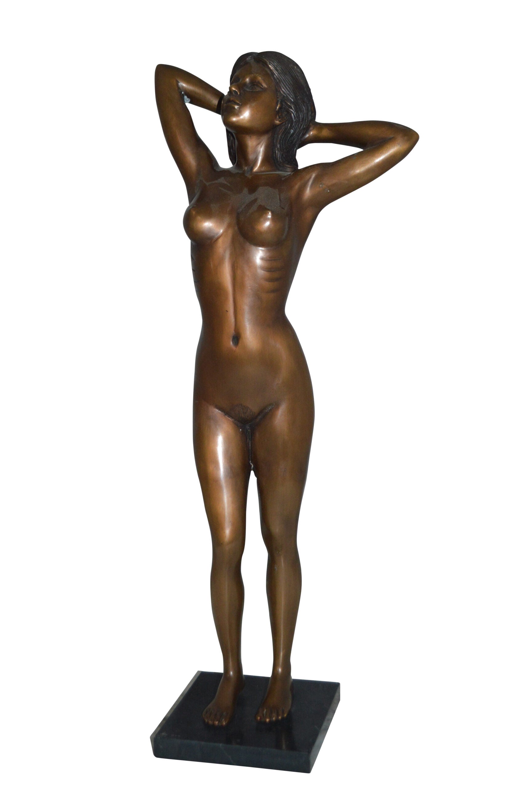 This charming bronze statue depicts Beautiful Young Lady standing nude mounted on a marble base. This very fine and unique abstract was casted using the ancient old "Lost Wax Method" with brown patina finish for preservation. 100% handmade and 100% bronze. This beautiful bronze-cast statue will be a valuable addition to any area of the home, office, patio, or garden. Size: 9"L x 5"W x 24"H. Weight is: 10Lb