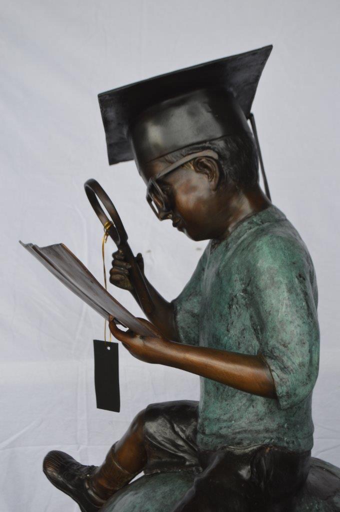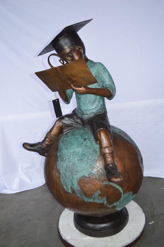 This bronze statue is the embodiment of knowledge and the constant search for it. A young boy sits on the world while reading a book, a true metaphor. It also reminds one of the timelessness of youth as he sits and enjoys a book. This is a beautiful, large statue cast in the Lost Wax method with a patina finish. Size: 28"L x 24"W x 52"H. Weight is: 128Lb
