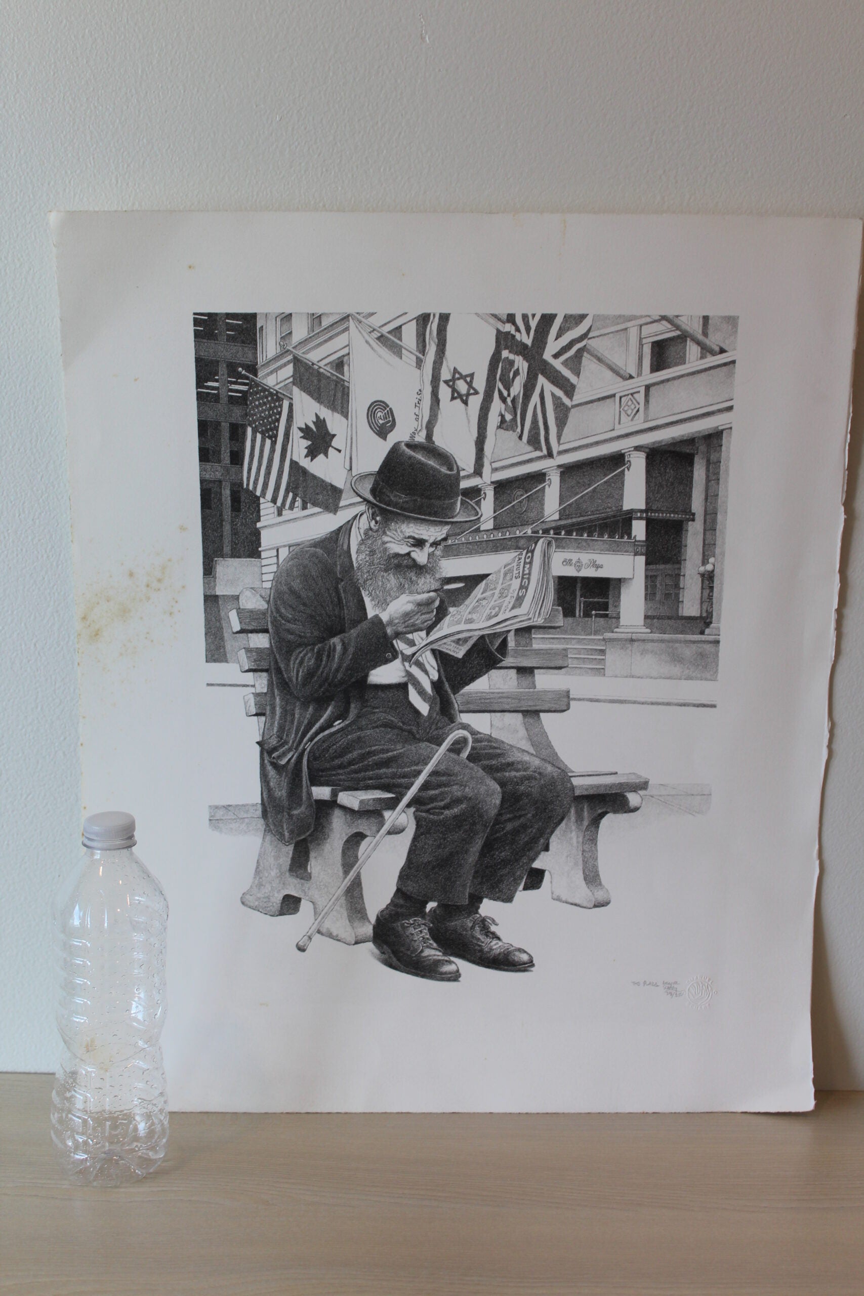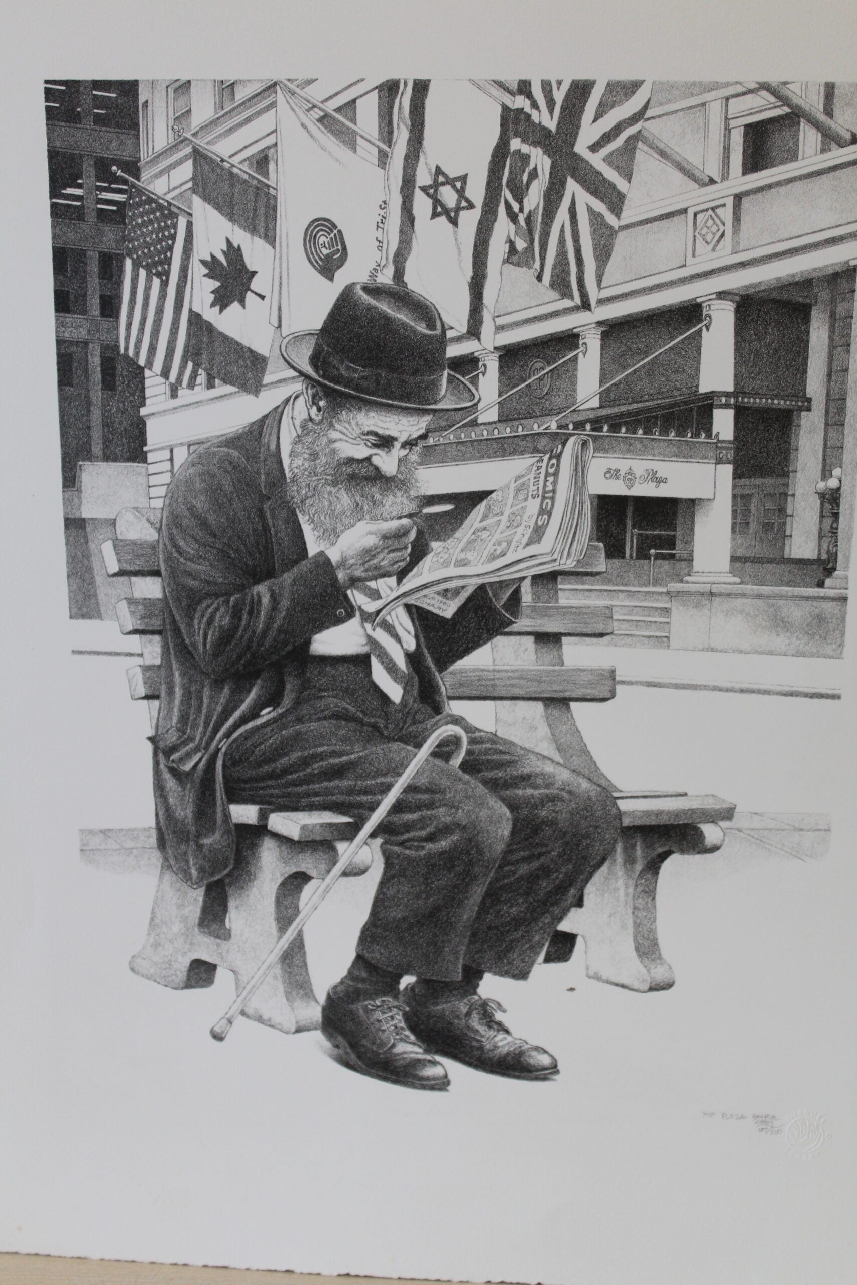 Enter the timeless allure of Emanuel Schary's "The Plaza." This black and white Lithograph captures a Jewish man immersed in a moment of contemplation, engrossed in a newspaper outside The Plaza hotel. Own a piece that transcends time, echoing the subtle elegance of metropolitan moments. Size: 12"L x 14"W x "H. Weight is: 2Lb