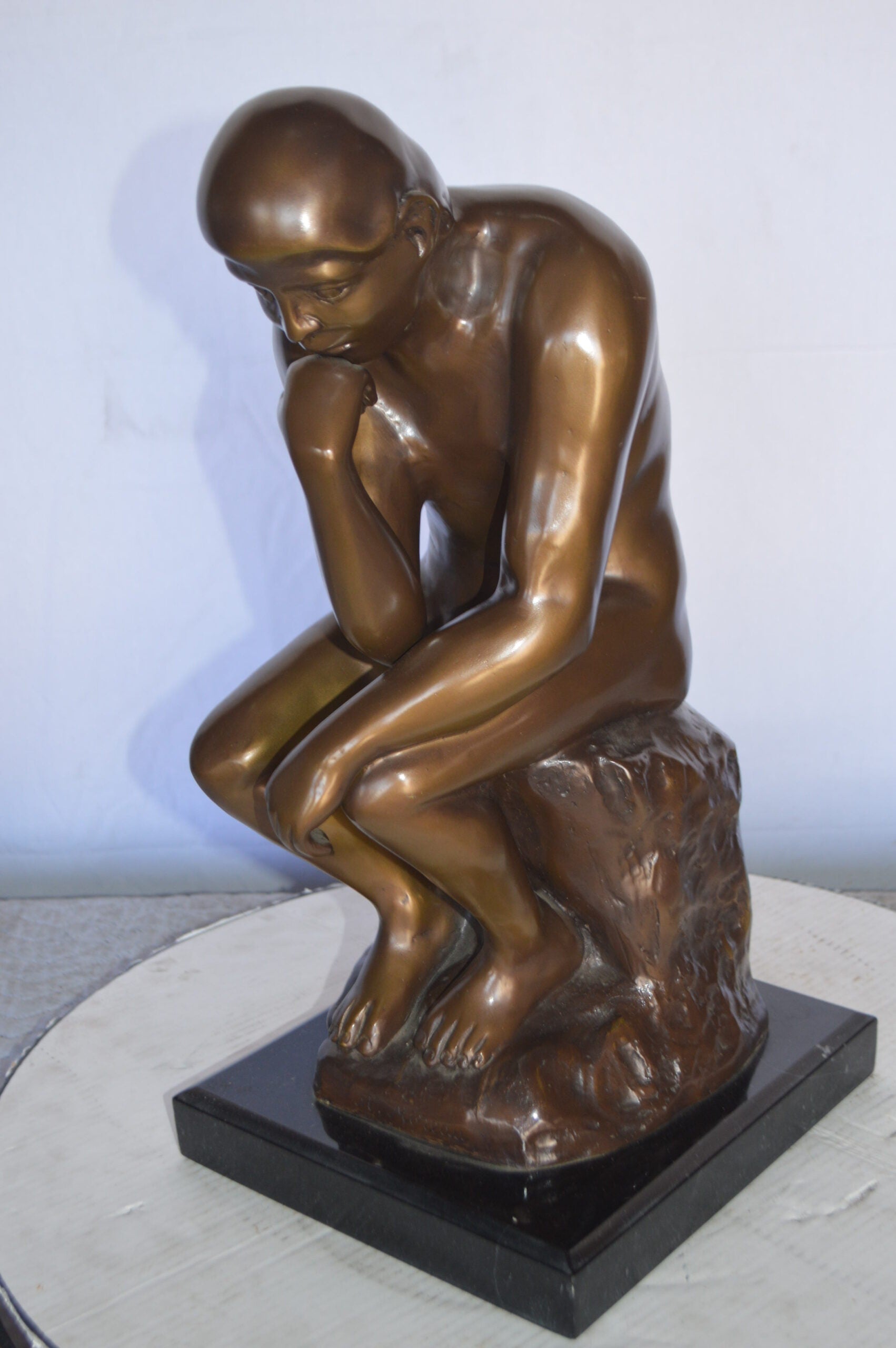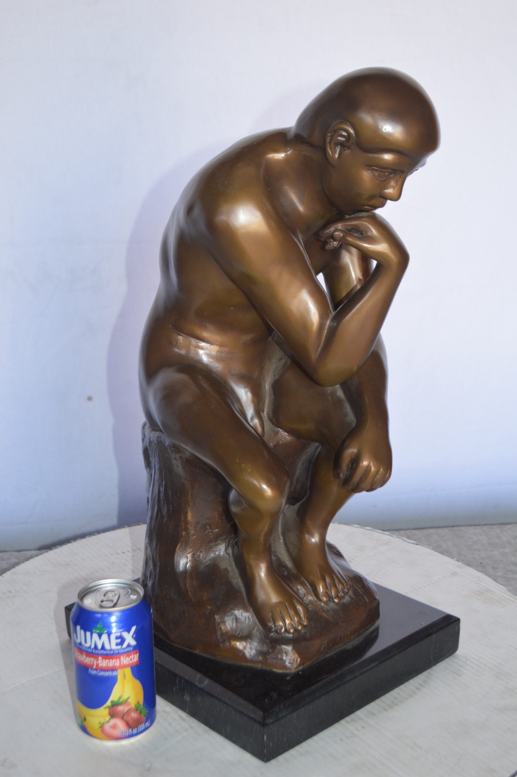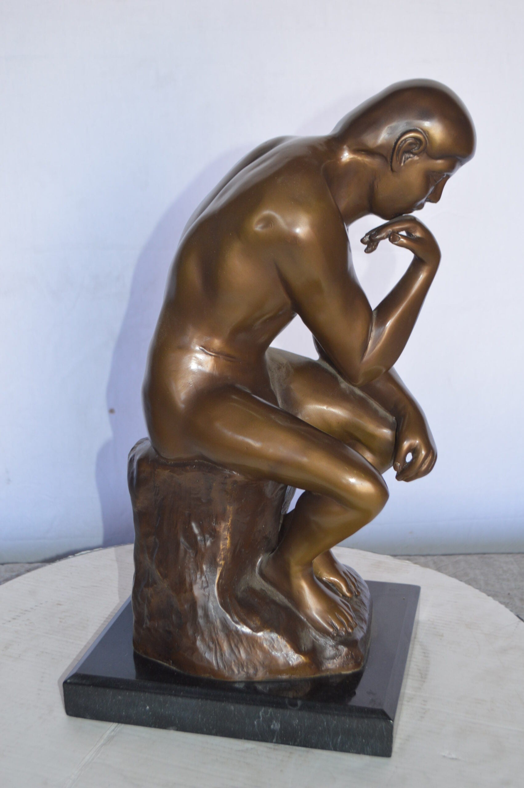 The Thinker is considered by many to be Rodin's most celebrated work. It was conceived as part of his monumental Gates of Hell, inspired by Dante's Divine Comedy. Originally titled "The Poet," The Thinker represents Dante himself. This reproduction was made from the heroic bronze original Sculpture by Rodin. This impressive Bronze Statue will be a permanent fixture on the grounds of your estate for years to come. Size: 10"L x 11"W x 20"H. Weight is: 32Lb