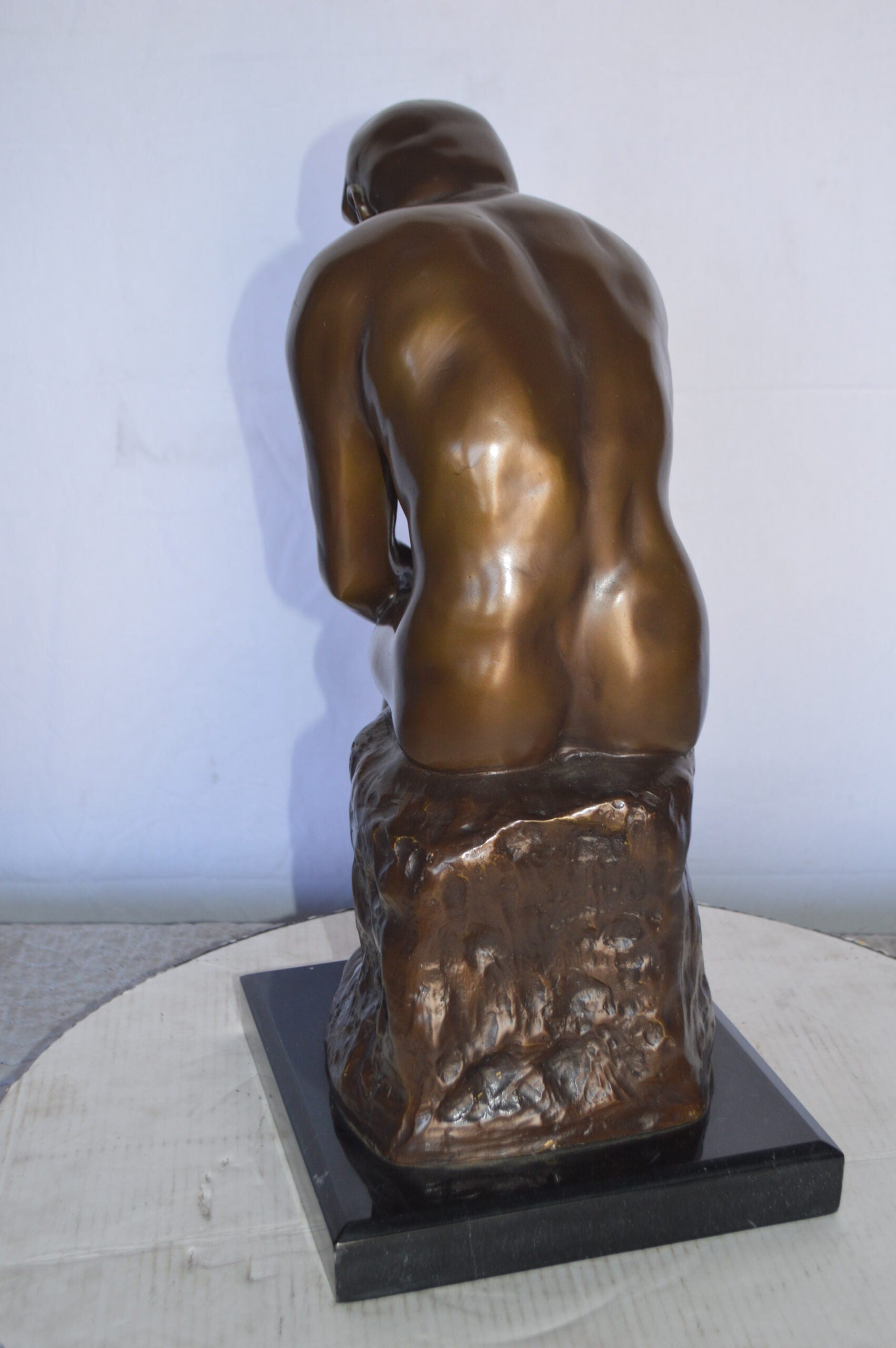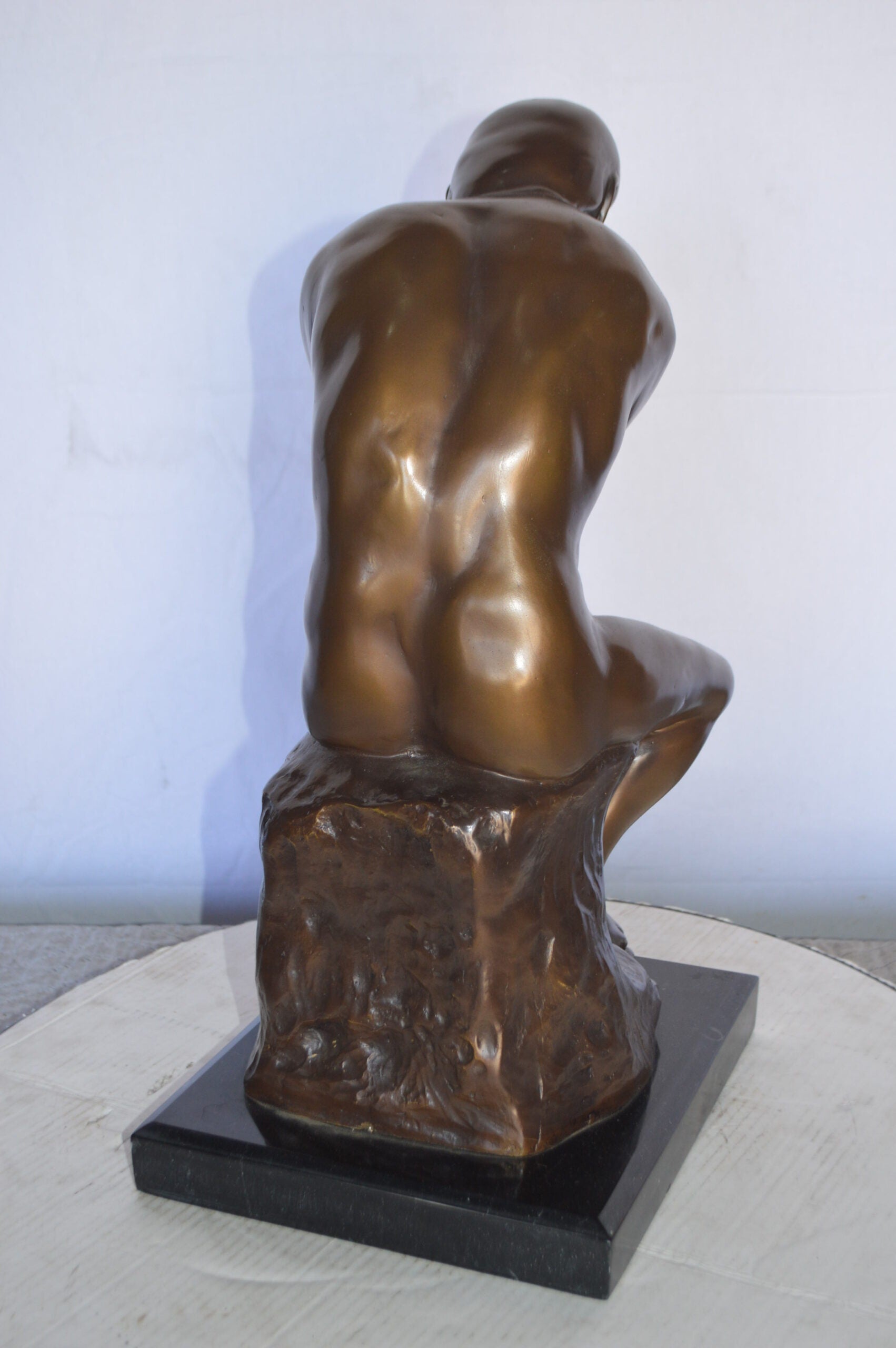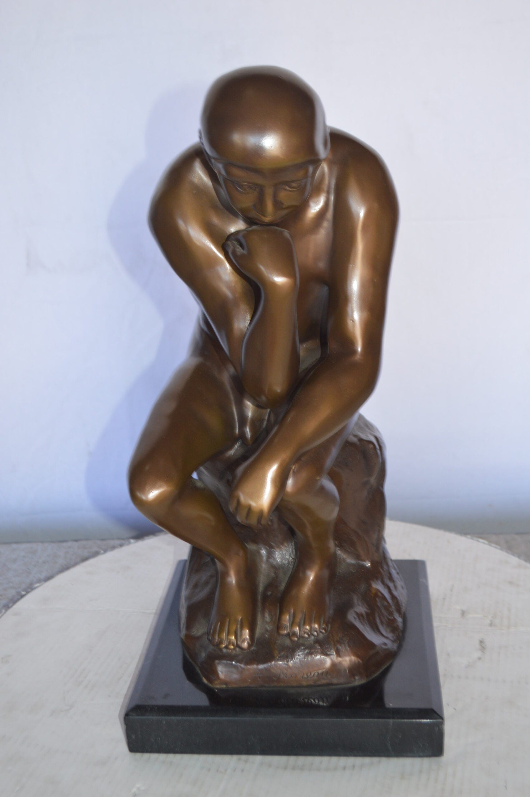 The Thinker is considered by many to be Rodin's most celebrated work. It was conceived as part of his monumental Gates of Hell, inspired by Dante's Divine Comedy. Originally titled "The Poet," The Thinker represents Dante himself. This reproduction was made from the heroic bronze original Sculpture by Rodin. This impressive Bronze Statue will be a permanent fixture on the grounds of your estate for years to come. Size: 10"L x 11"W x 20"H. Weight is: 32Lb