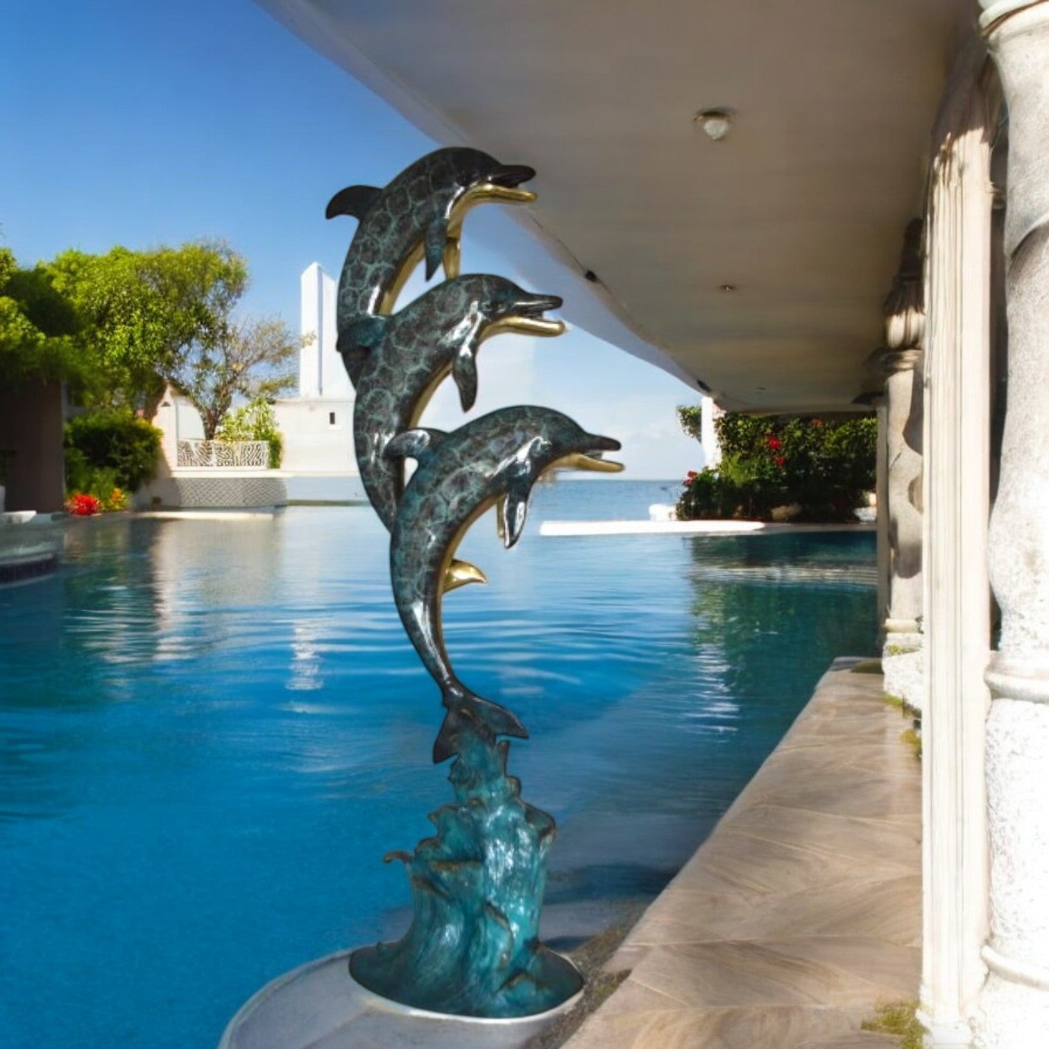 Surprise your garden guests with this large size outdoor Bronze fountain Statue of three Dolphins jumping out of the water. Each one of the dolphins is equipped with a hose that sprays water out of their mouth with the use of a fountain pump (pump is not included). Produced using superior quality bronze and a traditional casting method that yields pristine details. The patina chosen for this Timeless Creation is a mix of hand finishing with different colors and Polychrome techniques also referred to as enameling over bronze. This impressive Bronze Statue will be a permanent fixture on the grounds of your estate for years to come. Size: 22"L x 15"W x 67"H. Weight is: 70Lb