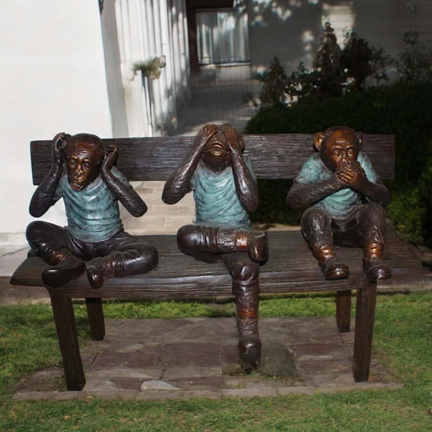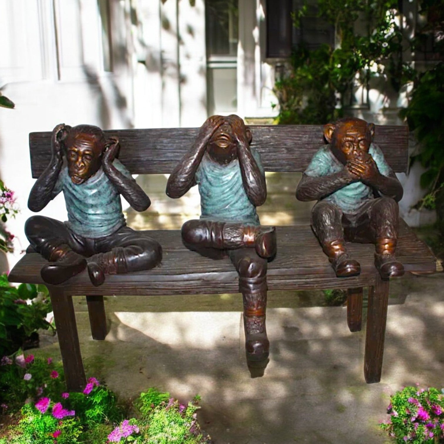The Cast Bronze Three Wise Monkeys on Bench Statue was cast by the traditional, Lost Wax Bronze Casting method. This labor intensive and time consuming method of casting bronze statues, ensure pristine quality and vivid detail. Size: 45"L x 19"W x 30"H. Weight is: 104Lb