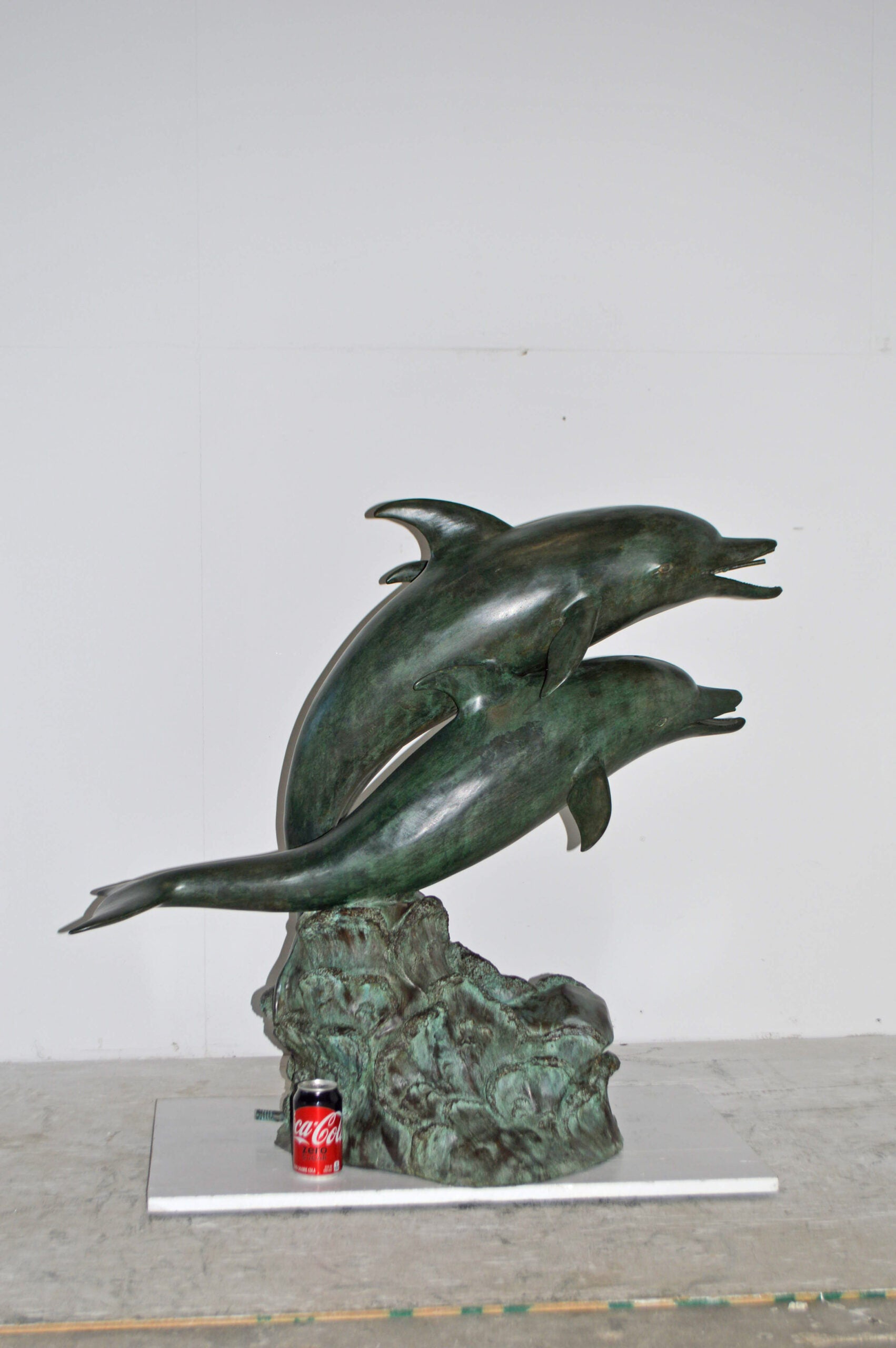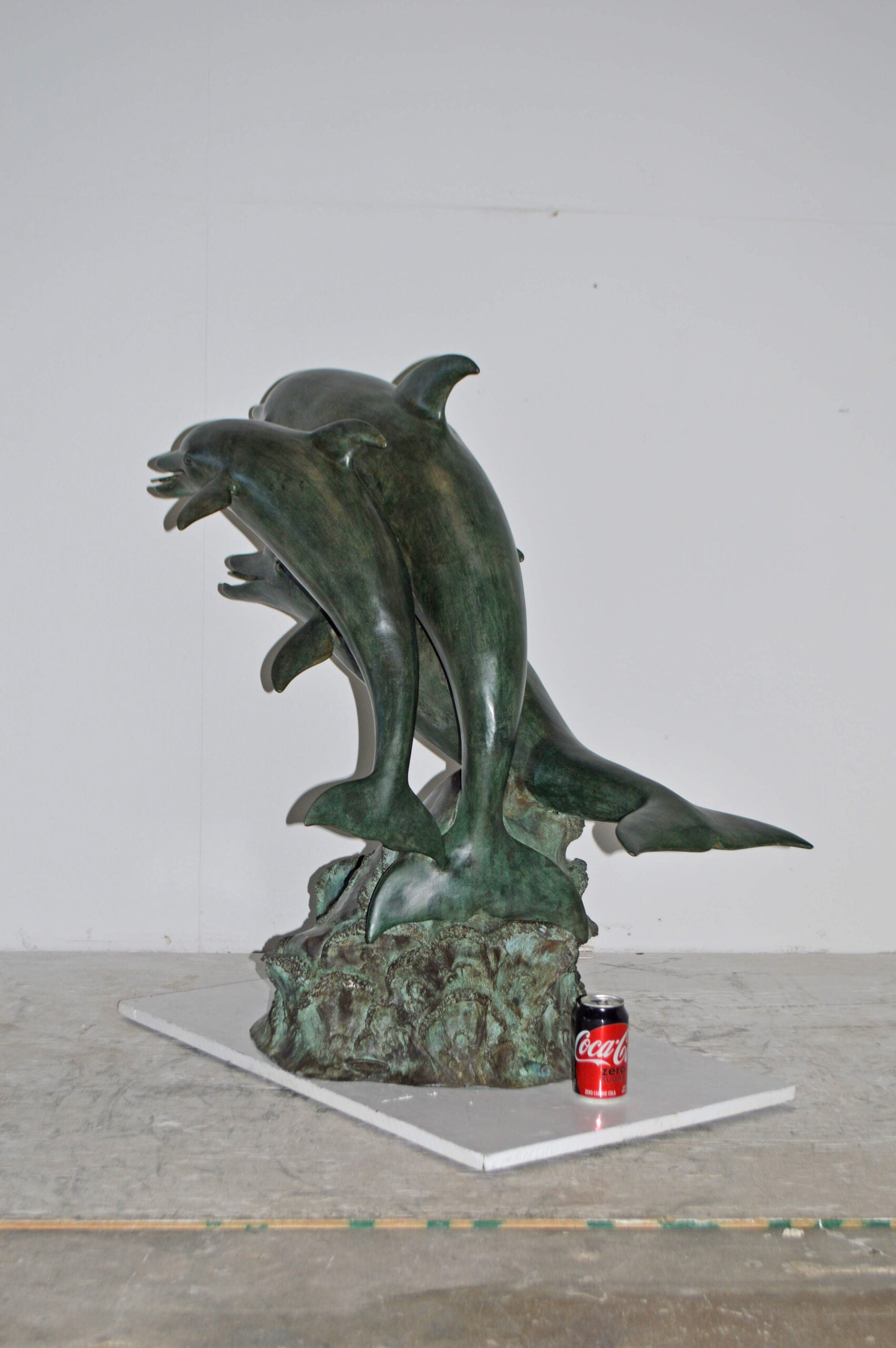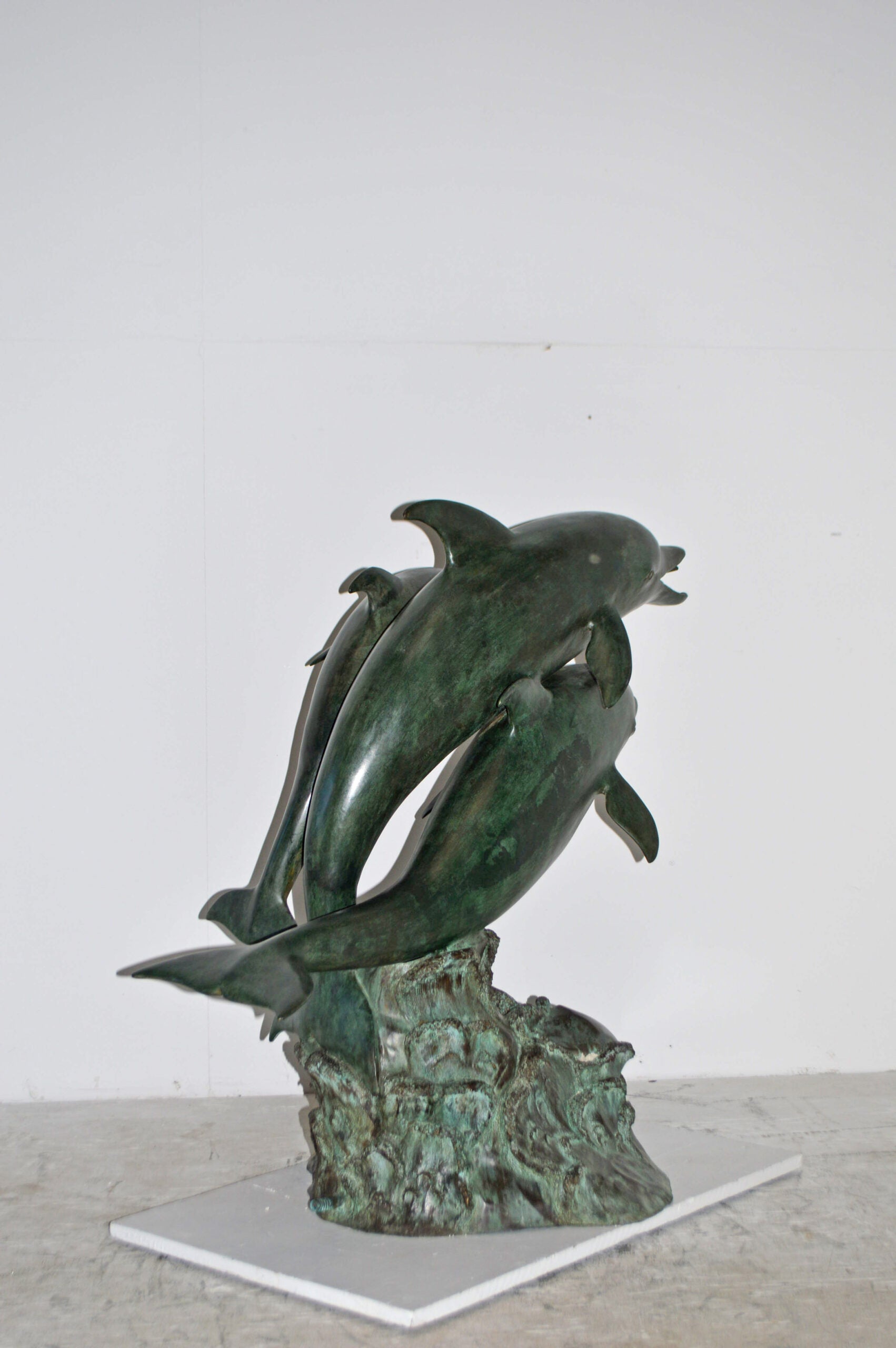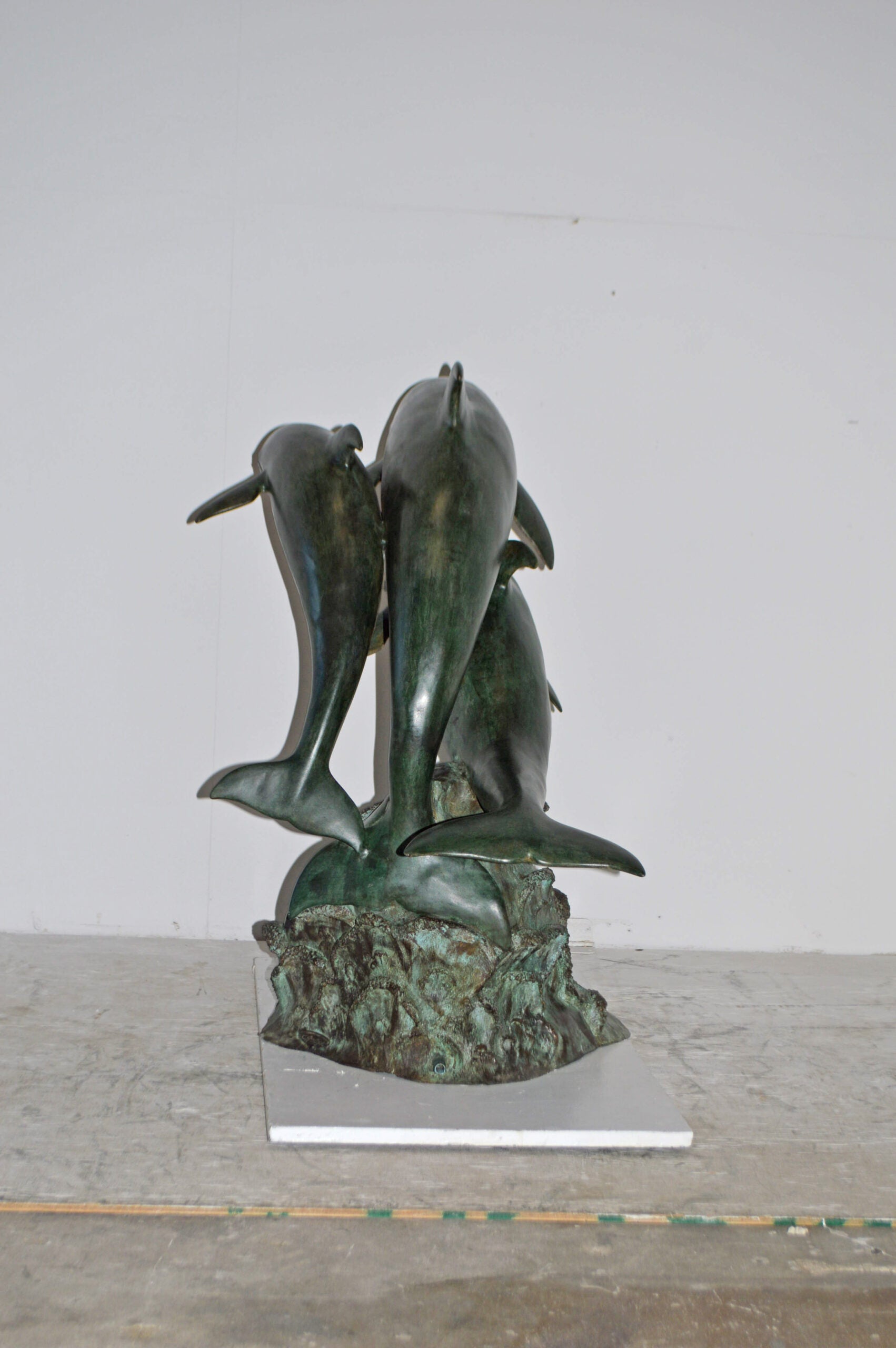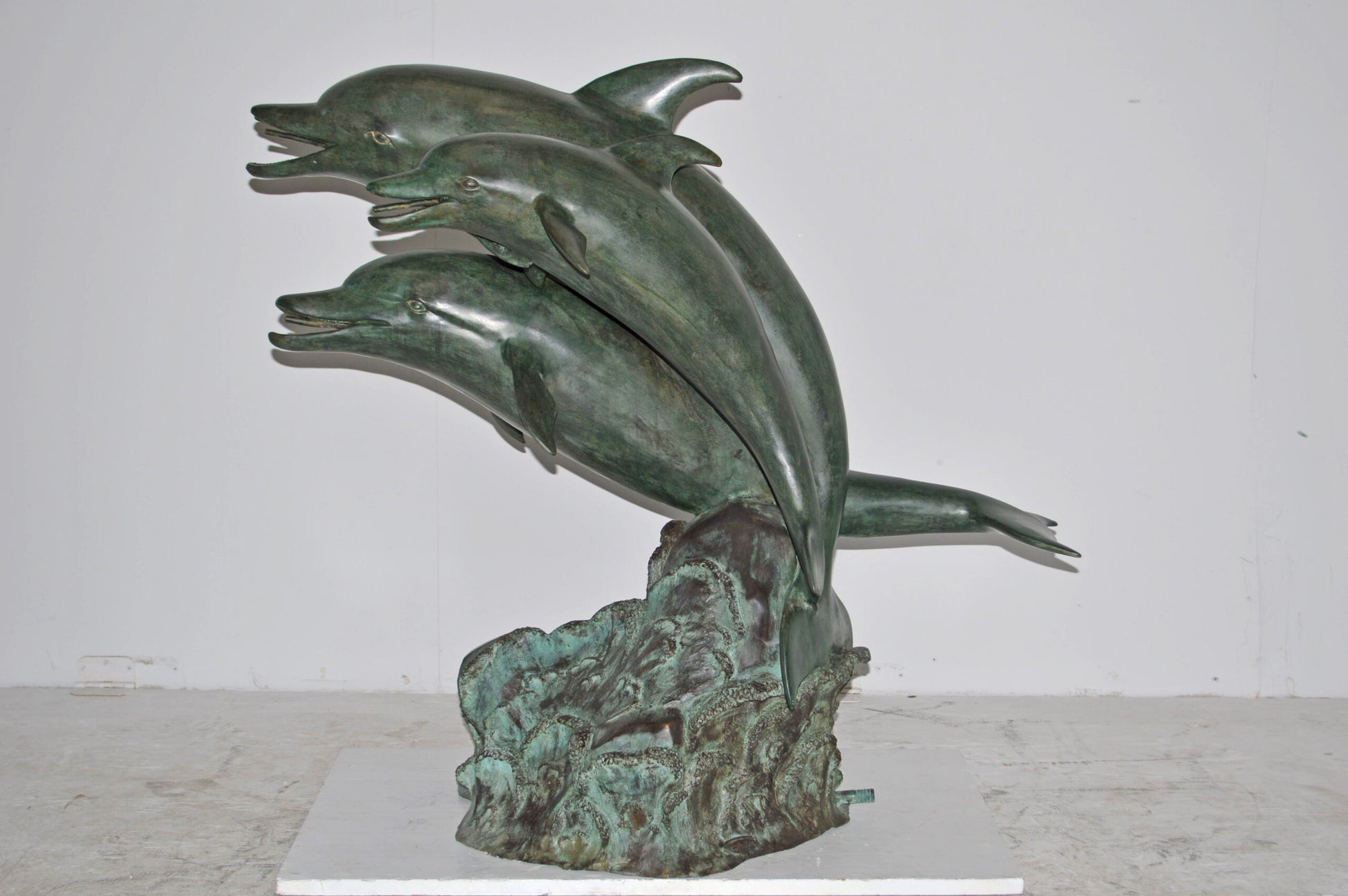 Surprise your garden guests with this large size outdoor Bronze fountain Statue of three Dolphins jumping out of the water. Each one of the dolphins is equipped with a hose that sprays water out of their mouth with the use of a fountain pump (pump is not included). Produced using superior quality bronze and a traditional casting using the lost wax method that yields pristine details. The patina chosen for this Timeless Creation is a mix of hand finishing with different tones of green and brown patina. This impressive Bronze Statue will be a permanent fixture on the grounds of your estate for years to come. Size: 40"L x 24"W x 36"H. Weight is: 88Lb