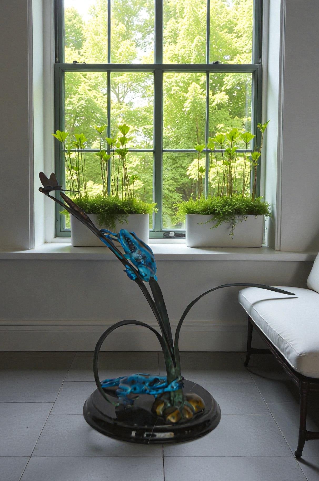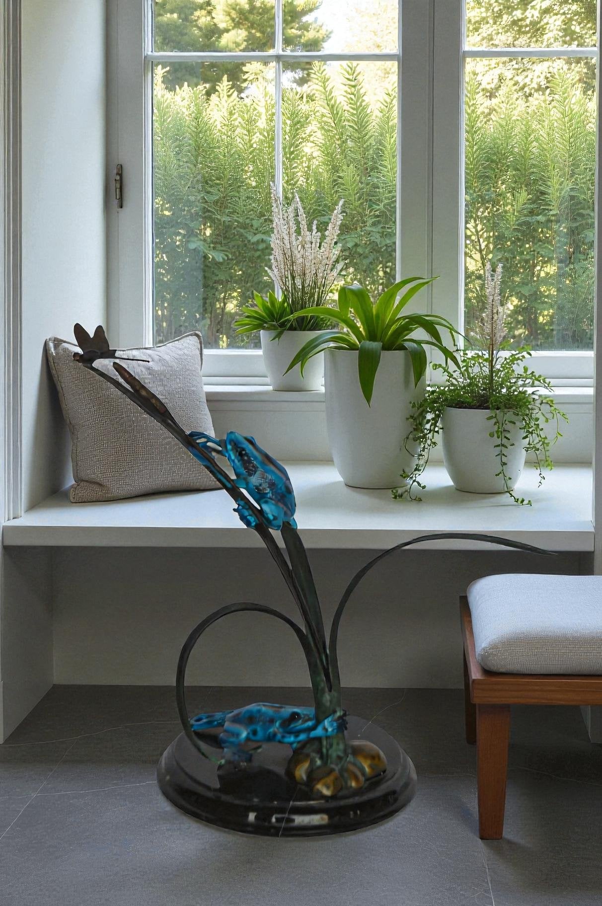 This beautiful bronze statue uses a process known as enameling over bronze, to create the classy blue finish of the frogs. In this statue, two blue frogs perch themselves on curled sawgrass, ready to pounce at their next meal, a resting dragonfly. This beautiful bronze statue would be a great addition to any home or office in need of a work of art. Size: 14"L x 8"W x 12"H. Weight is: 4Lb
