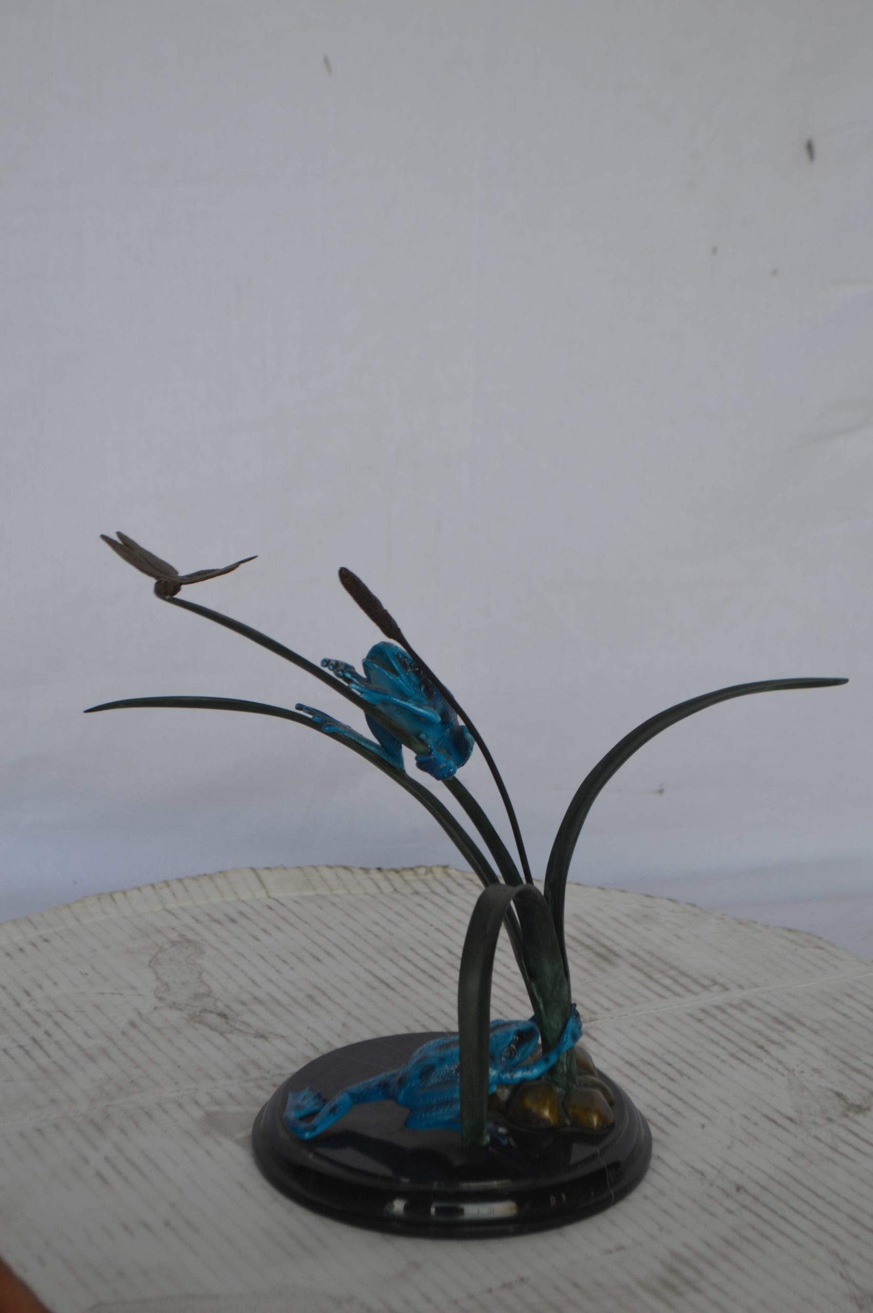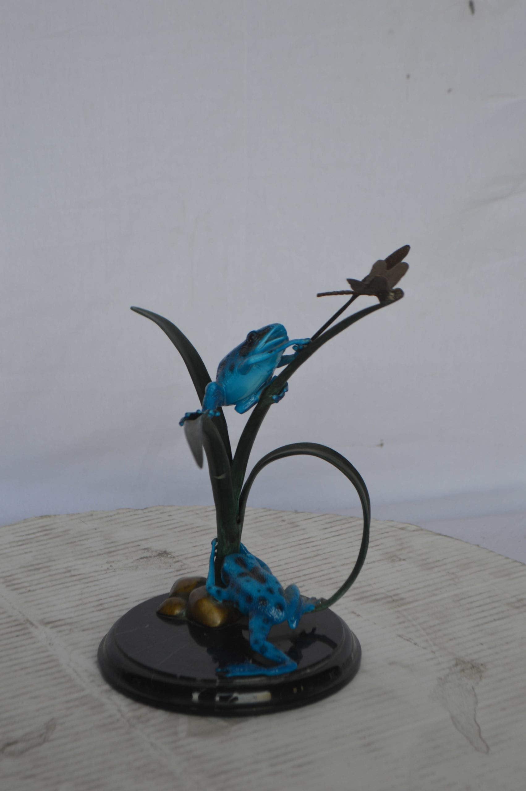 Two Blue Frogs catching a dragonfly Bronze Statue - Size: 14"L x 8"W x 12"H.