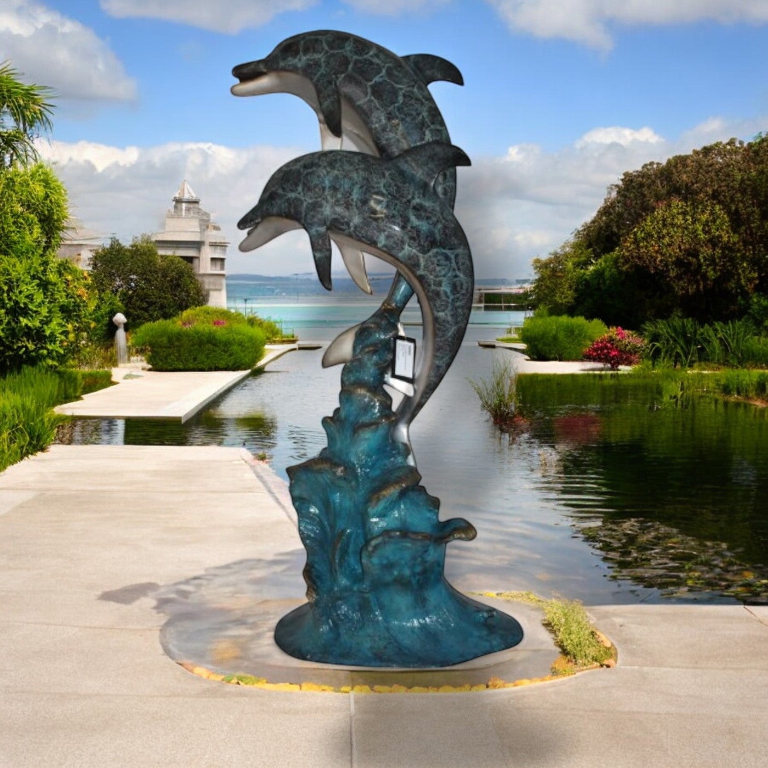 Surprise your garden/fountain guests with this realistic outdoor Bronze Statue of two Dolphins. Produced using superior quality bronze and a traditional casting method that yields pristine details, this impressive Bronze Statue will be a permanent fixture on the grounds of your estate for years to come. Size: 22"L x 12"W x 46"H. Weight is: 56Lb