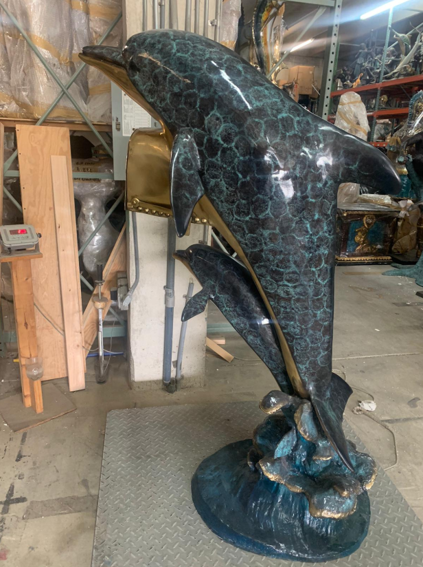Magnificent large size Mailbox bronze statue featuring in a natural form of two Dolphins jumping off the water. The sculpture tones are finished in a lacquer patina on a heavy bronze base. The patina chosen for this Timeless Creation is a mix of hand finishing with different colors and Polychrome techniques also referred to as enameling over bronze. This impressive Mailbox Bronze Statue will be a permanent fixture on the grounds of your estate for years to come. Size: 40"L x 33"W x 67"H. Weight is: 186Lb