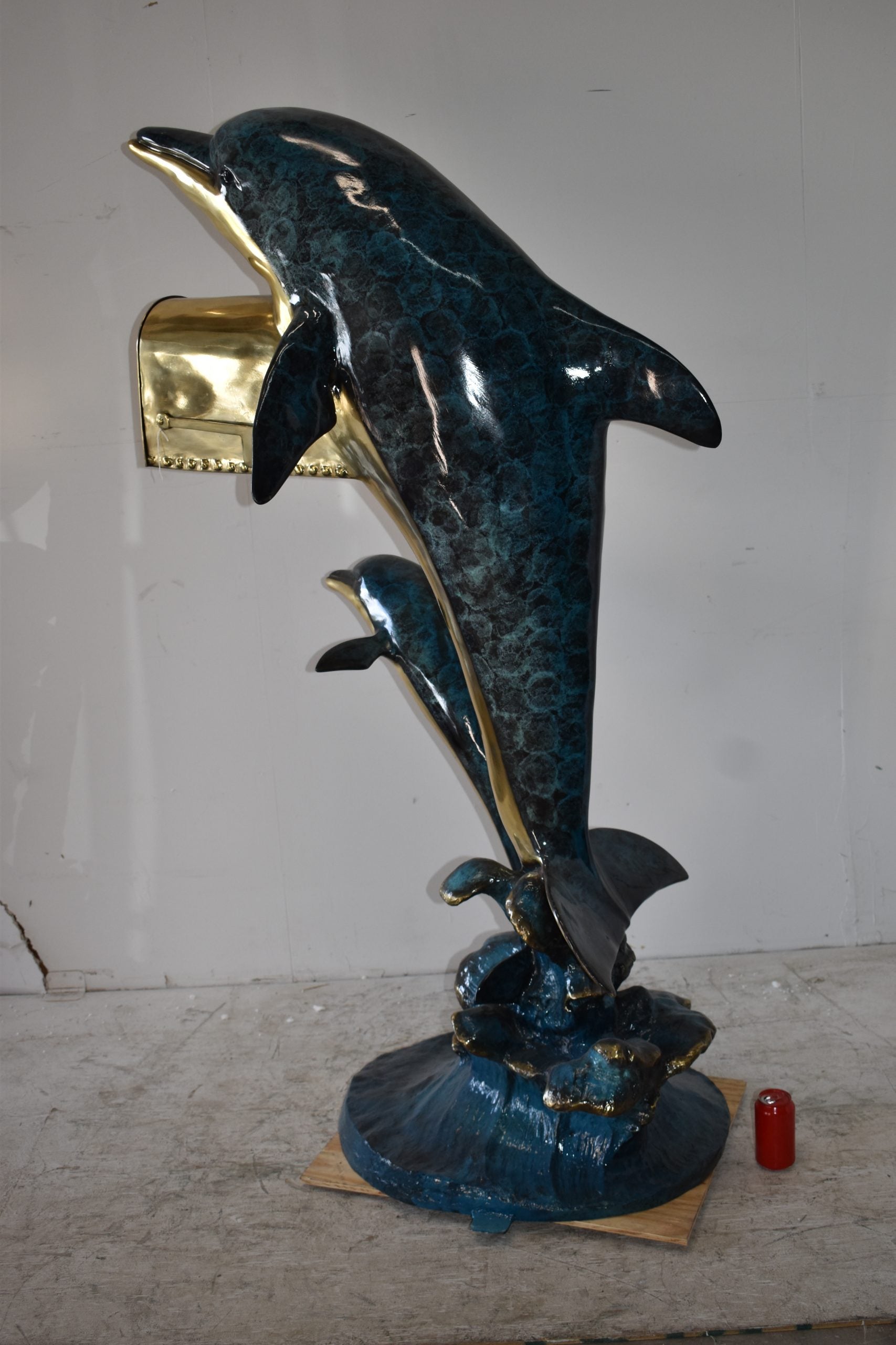 Magnificent large size Mailbox bronze statue featuring in a natural form of two Dolphins jumping off the water. The patina chosen for this Timeless Creation is a mix of hand finishing with different colors and Polychrome techniques also referred to as enameling over bronze. This impressive Mailbox Bronze Statue will be a permanent fixture on the grounds of your estate for years to come and certainly be the focal point on your street Size: 48"L x 31"W x 68"H. Weight is: 175Lb