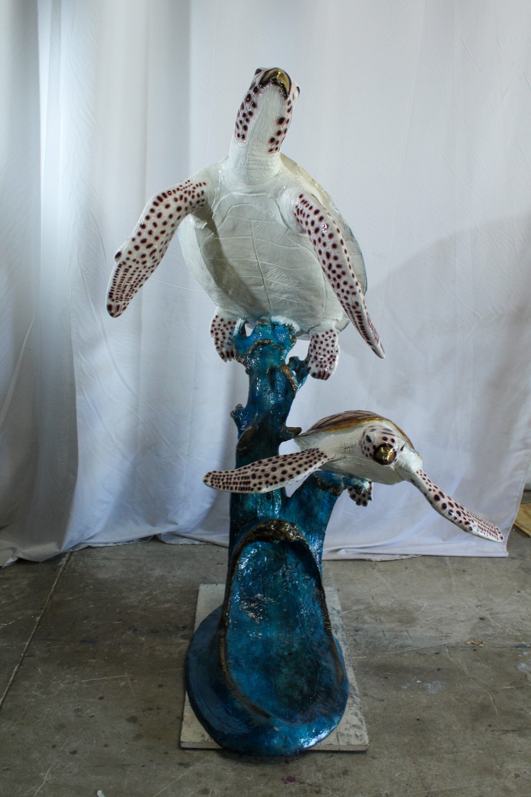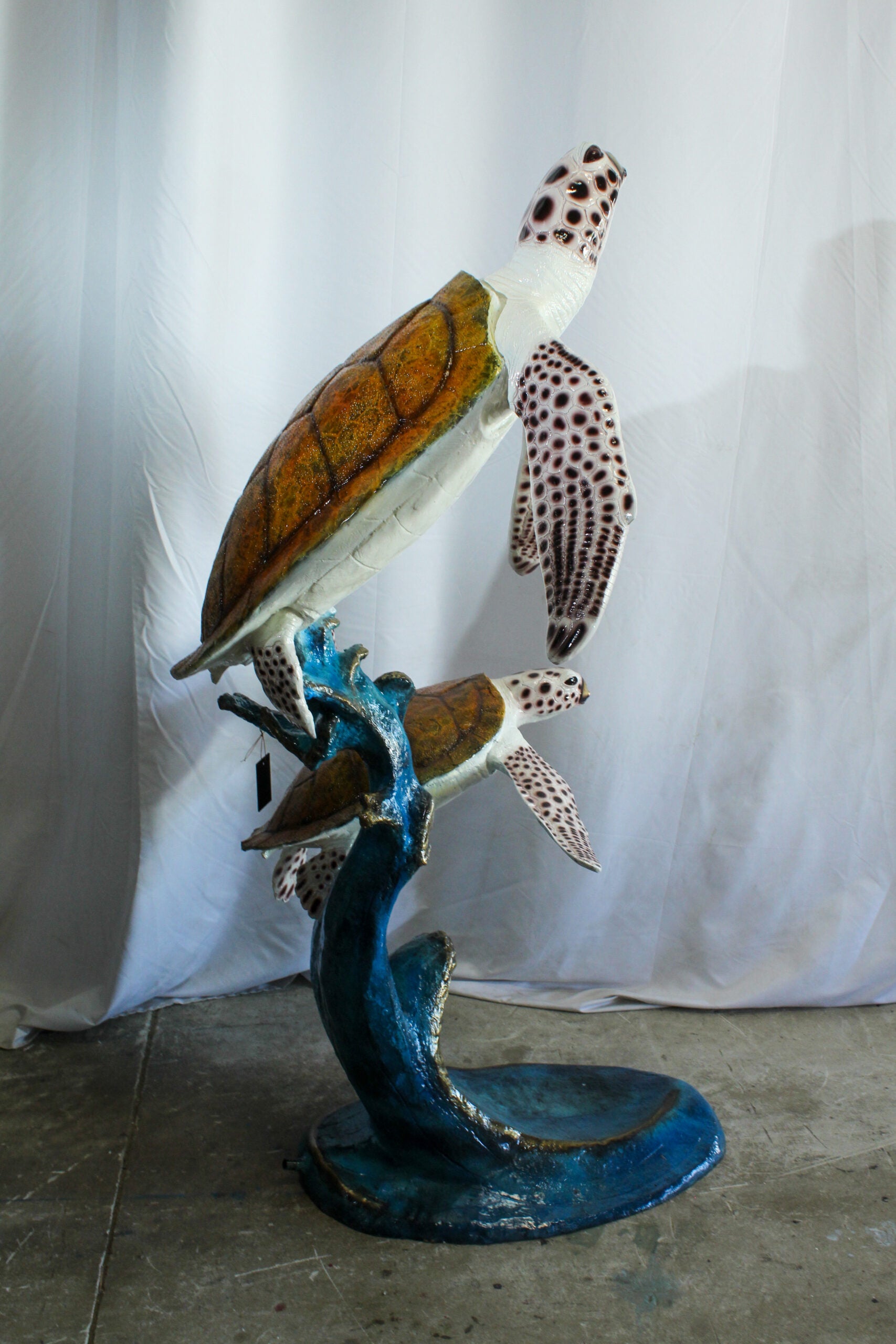 This elegant sea turtle fountain statue captures two turtles gracefully swimming above a wave-shaped coral base. Crafted using the lost wax casting method, the piece offers intricate detailing on the turtles’ shells and fins. Ideal for garden or indoor display, this fountain brings the essence of the ocean into your space. Made from durable bronze. Pump not included. Size: 52"L x 40"W x 68"H. Weight: 174Lb
