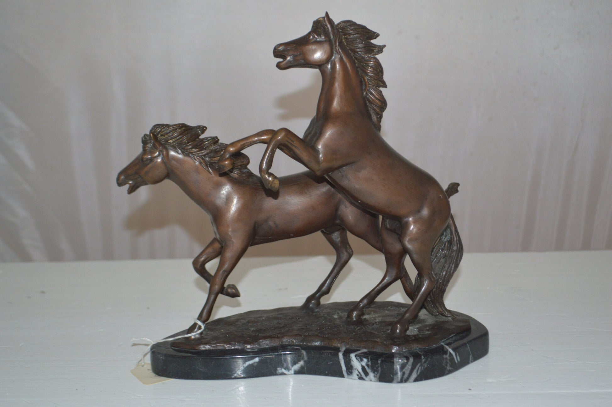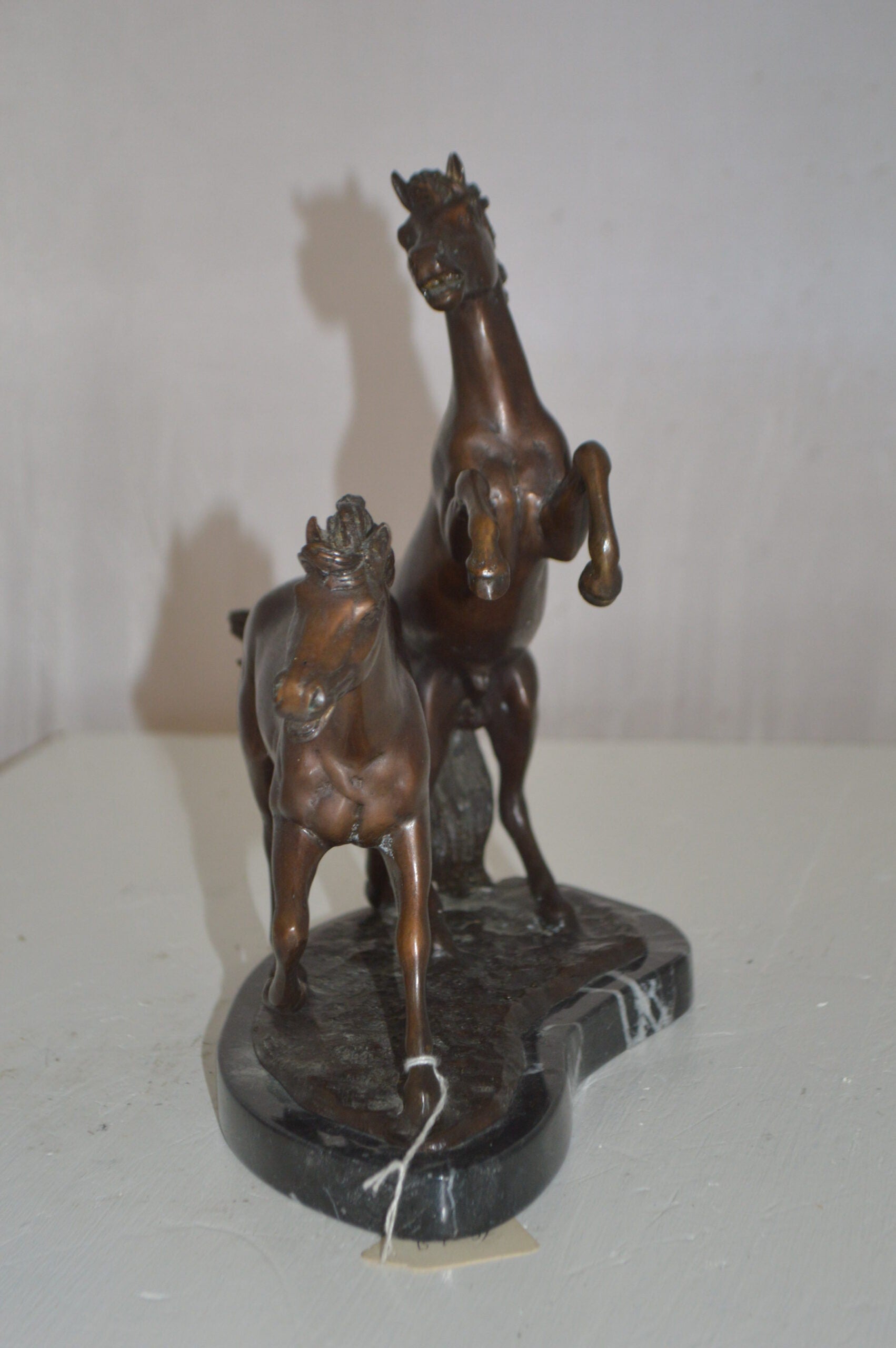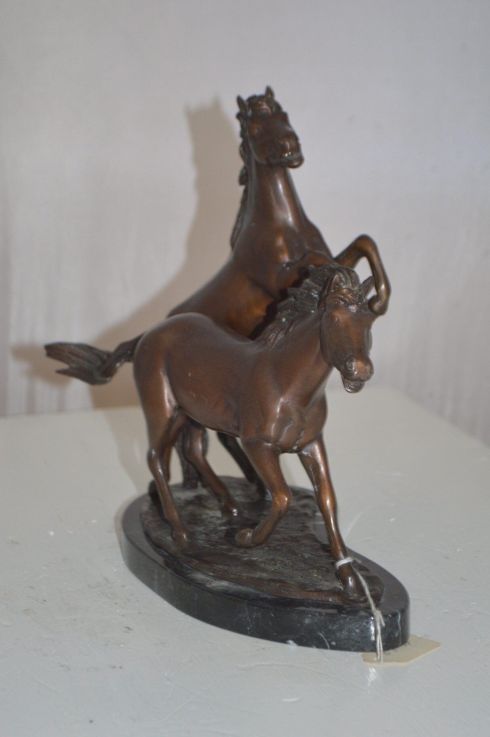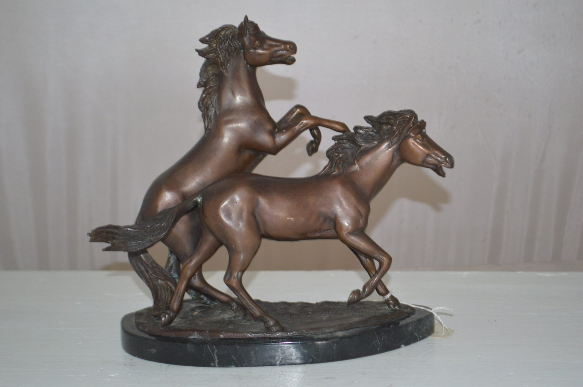 Two bronze finished horses running in the wide open fields made of solid bronze. This brown patina sculpture was cast using the Lost Wax Method and mounted on a marble base.. The feeling to be free would make any horse happy. This gorgeous horse sculpture would make for a great gift for anybody. Size: 11"L x 5"W x 11"H. Weight is: 7Lb