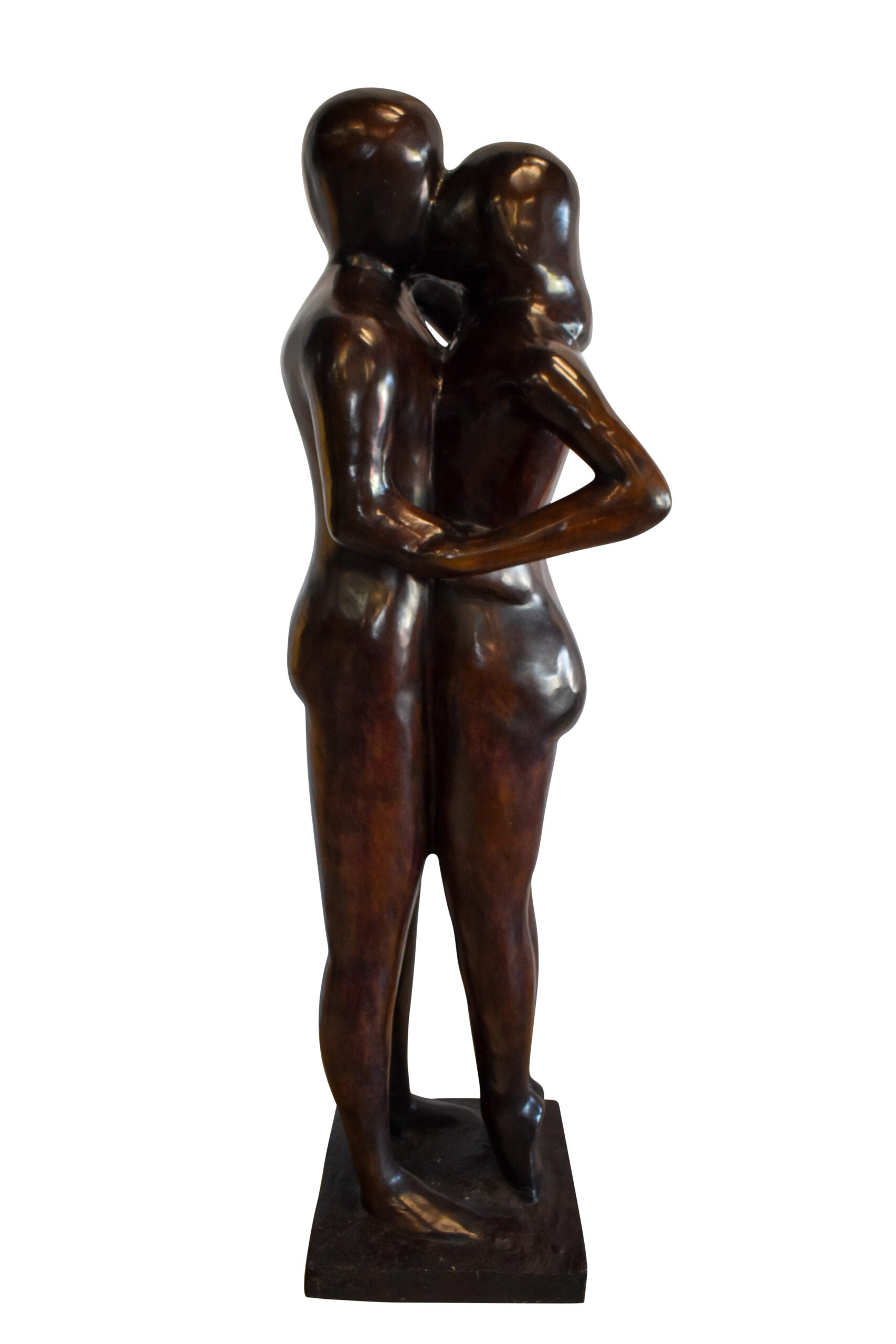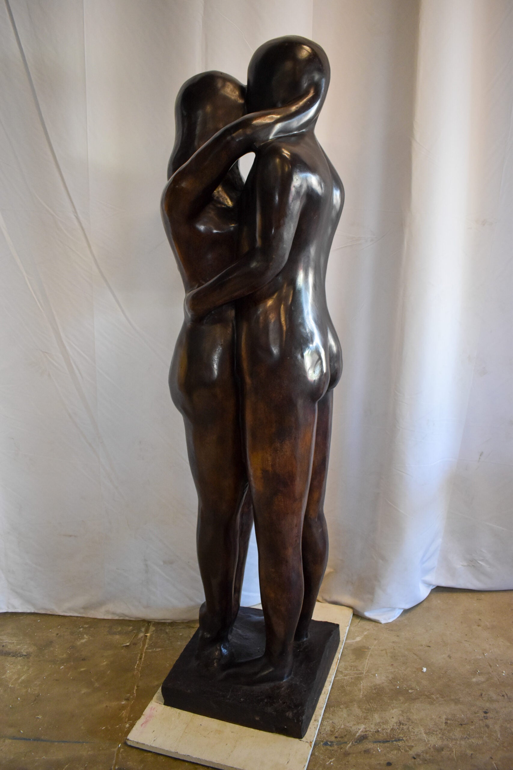 This bronze statue of two lovers embracing displays a man and woman entwined with love while standing up. The statue, over 6 feet tall, is a powerful and beautiful piece to bring meaning to any space. Size: 22"L x 19"W x 73"H. Weight is: 187Lb