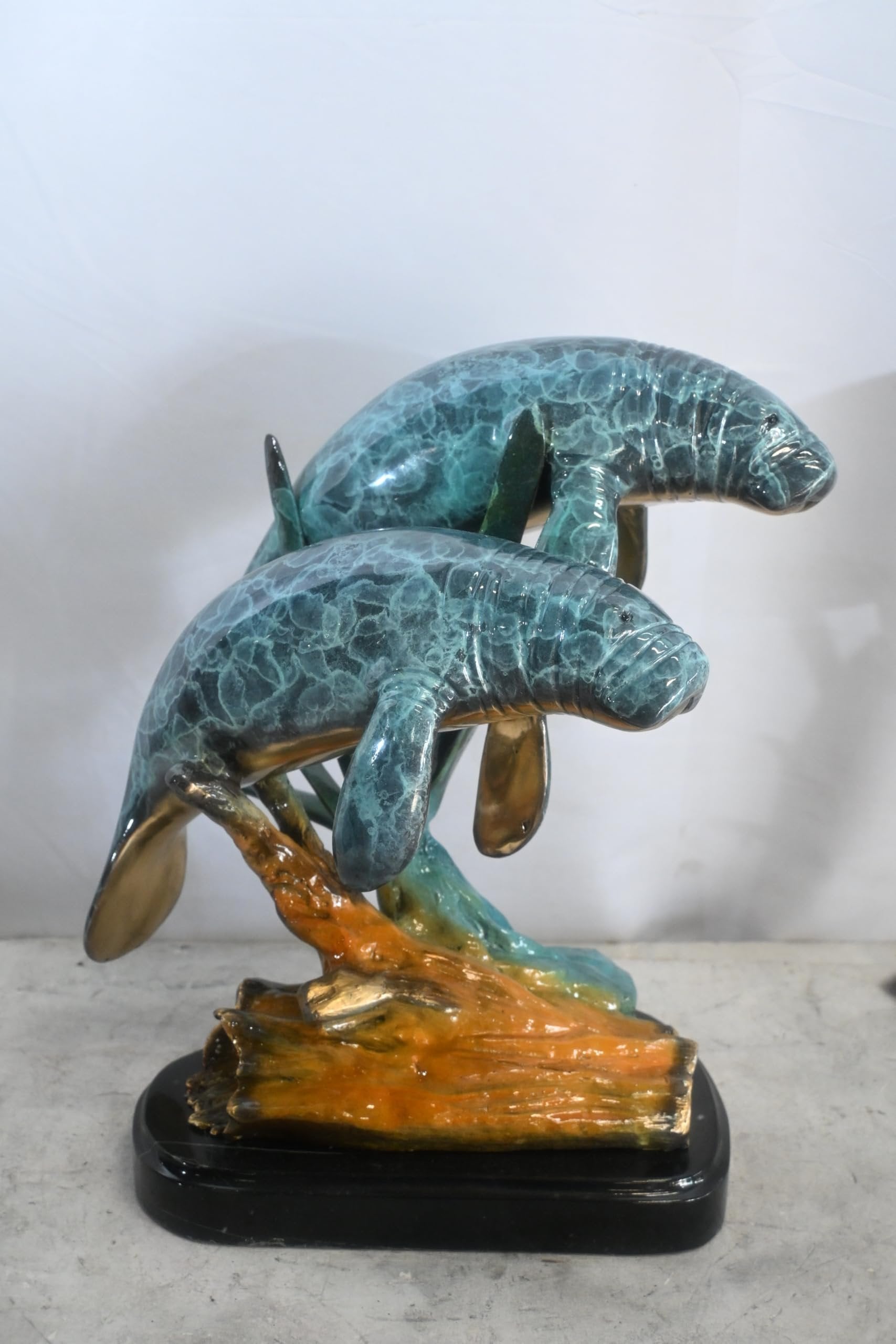 Charming bronze sculpture featuring two manatees swimming together crafted using the traditional lost wax method. This peaceful piece captures the gentle nature of these endangered marine mammals with beautiful turquoise patina finish showing textured skin detail. Gold bronze accents highlight flippers and coral elements. Mounted on elegant black marble base. Perfect for marine wildlife enthusiasts conservation supporters and coastal decor. Size: 15"L x 11"W x 12"H. Weight: 32Lb Expertly crafted using the lost wax casting method ensuring exceptional detail and durability in solid bronze construction Features two manatees in gentle swimming formation on coral base capturing the peaceful nature of these beloved gentle marine mammals Stunning turquoise blue green patina finish with textured surface creating realistic appearance of underwater light patterns and natural coloring Intricate detailing includes characteristic wrinkled skin texture paddle like flippers broad rounded tails and distinctive gentle facial features Mounted on elegant black marble base perfect for marine conservation supporters wildlife enthusiasts or coastal themed decor bringing tranquility to any space