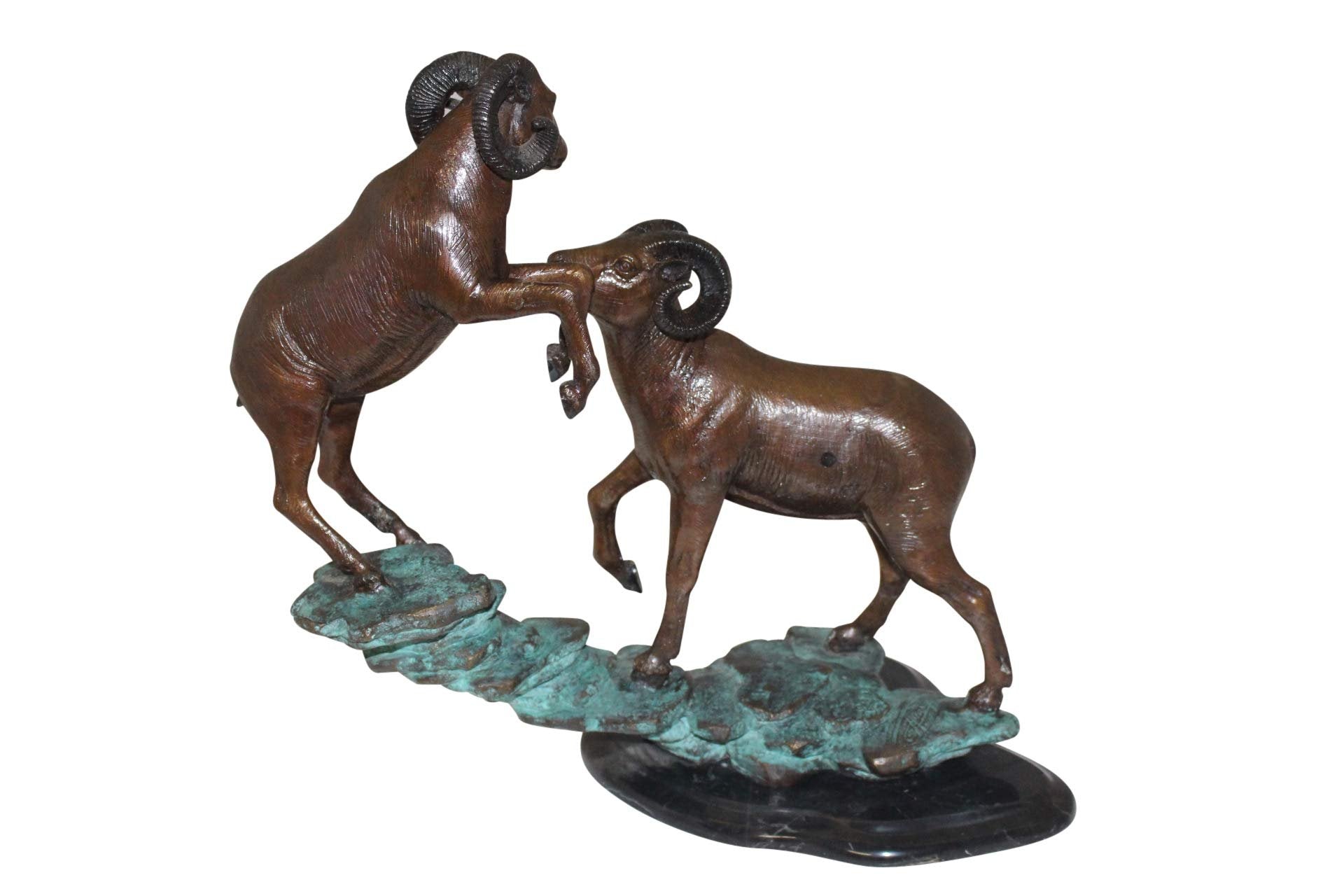 This awe-inspiring Ram Pair on Rocks Life Size Bronze Sculpture captures the two muscular creatures mid-brawl on a rocky outcropping. Size: 15"L x 8"W x 16"H. Weight is: 13Lb