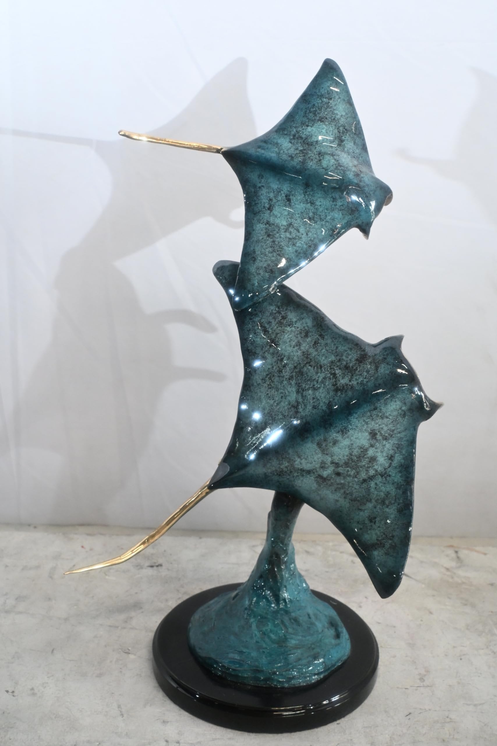 Elegant bronze sculpture featuring two stingrays in swimming formation crafted using the traditional lost wax method. This graceful piece showcases distinctive diamond shaped bodies with extended wing like fins and long tails. The dramatic dual finish contrasts rich blue green patina with lustrous polished gold bronze. Detailed gill slits and textured surfaces add authenticity. Mounted on wave base. Perfect for marine life enthusiasts and coastal decor. Size: 13"L x 7"W x 23"H. Weight: 14Lb Expertly crafted using the lost wax casting method ensuring exceptional detail and durability in solid bronze construction Features two stingrays in elegant swimming formation with distinctive diamond shaped bodies and long whip like tails creating graceful underwater scene Striking dual finish with rich blue green patina on one stingray and lustrous polished gold bronze on the other creating beautiful contrast Intricate detailing includes characteristic flat wing like pectoral fins gill slits textured skin and distinctive stingray anatomy capturing ocean grace Mounted on ocean wave base with black foundation perfect for marine life enthusiasts ray collectors or creating unique coastal statement piece