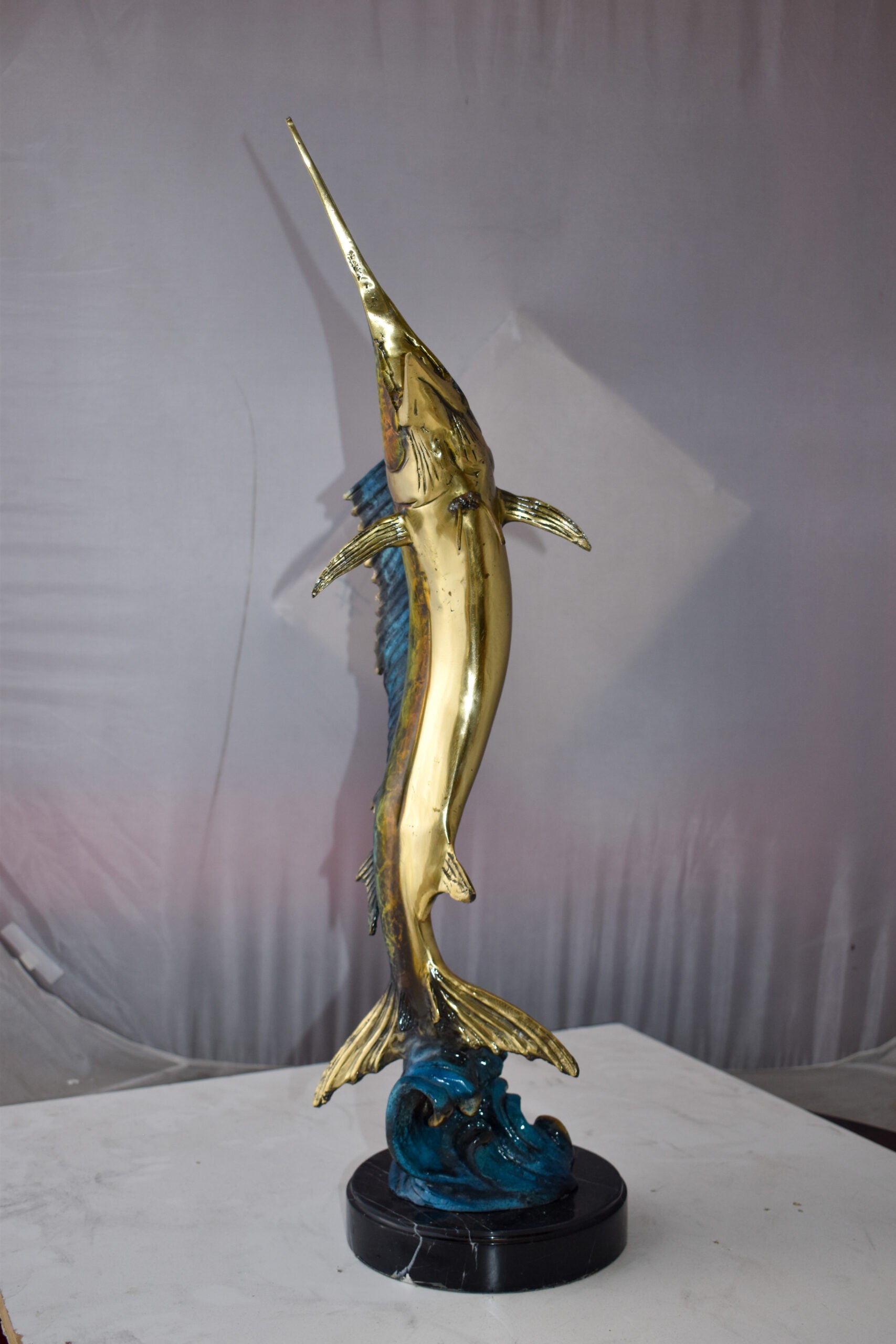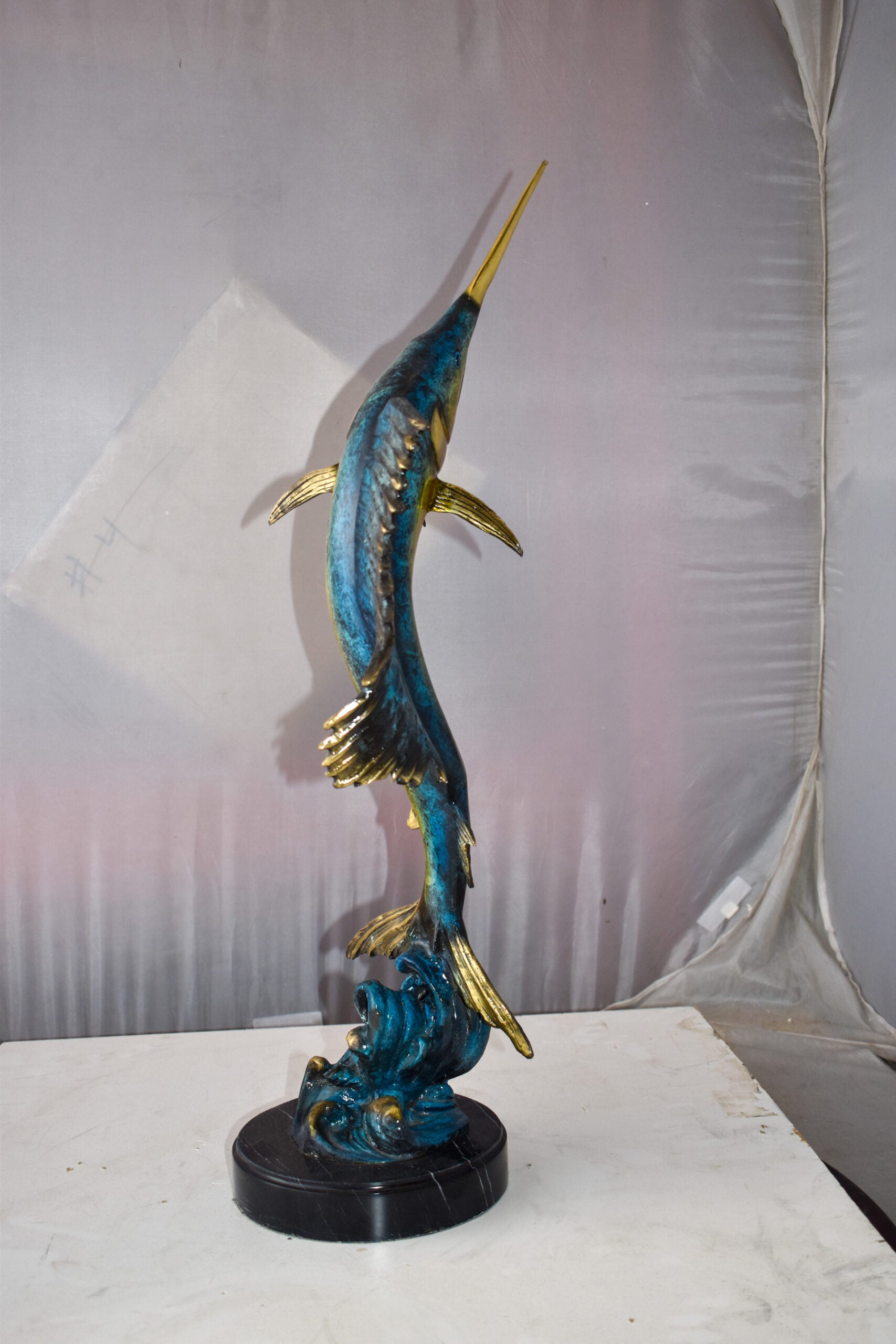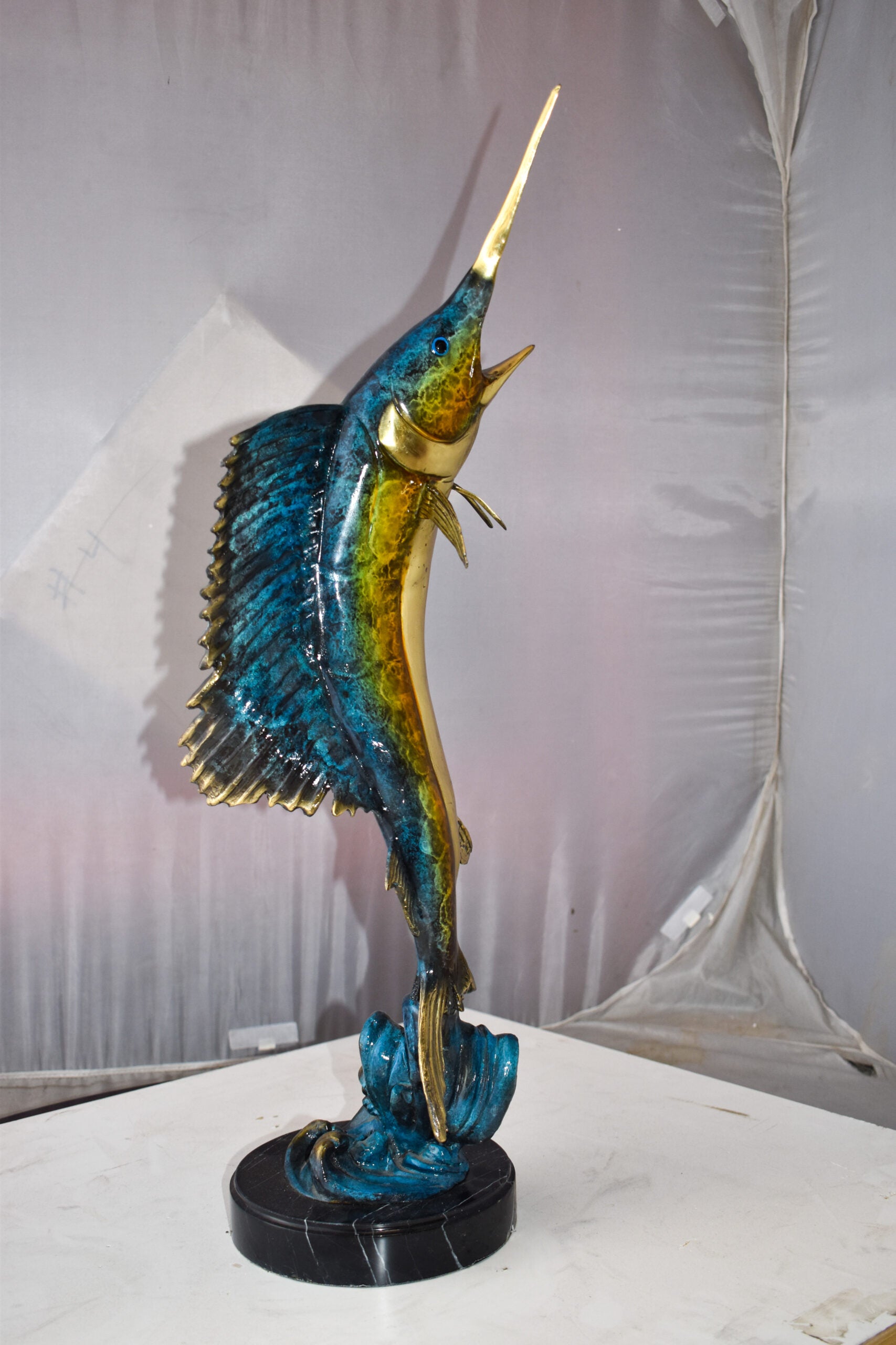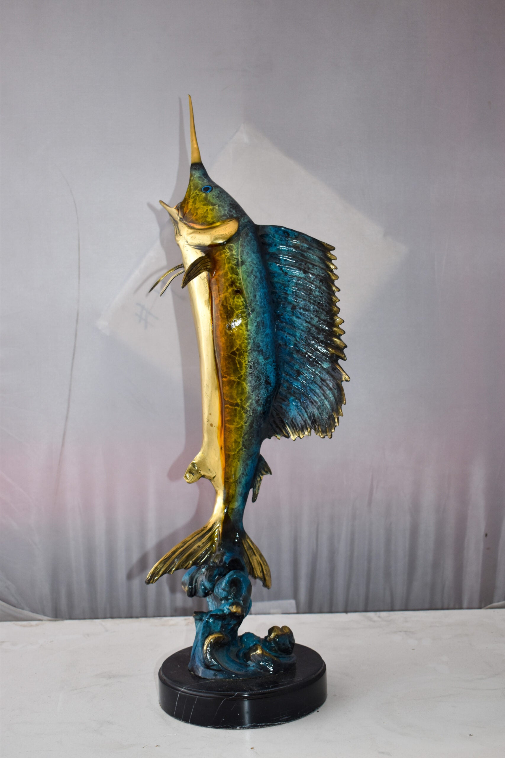 This bronze statue of a fierce marlin fish with striking colors and careful attention to detail. The marlin fish jumping of the ocean, creates an illusion of feeling as if he is in motion. Handcrafted and casted using traditional lost wax method, stained with different colors using polychrome techniques also referred to as enameling over bronze. This expression of the world beneath the waves would look great in the home of any ocean life lover. Size: 12"L x 8"W x 30"H. Weight is: 20Lb