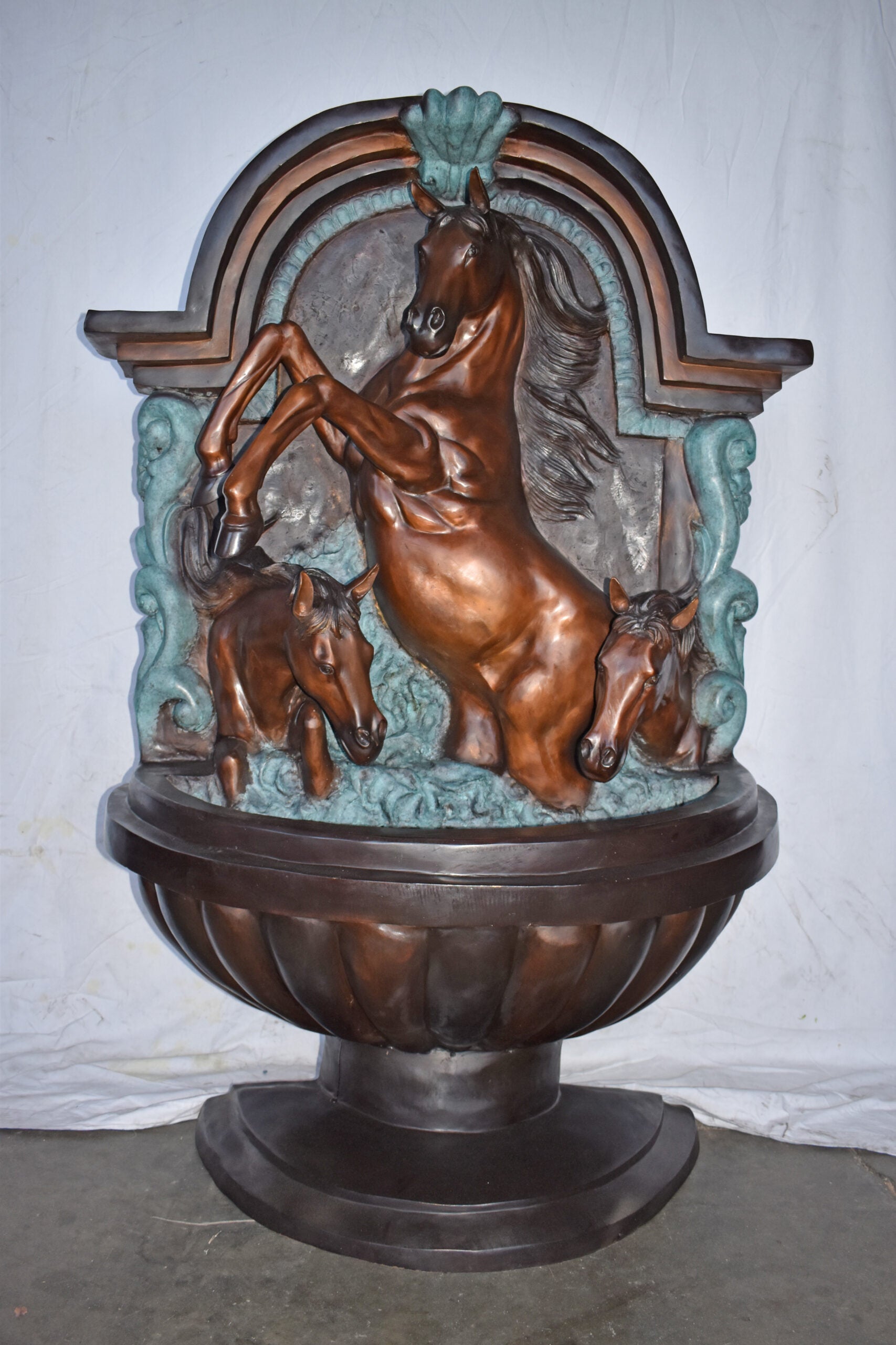 Triple horses wall Fountain can be a grand addition to your yard. Water sprays out of the horses mouth to the tab underneath, with the use of a fountain pump (pump is not included). Cast in the traditional lost-wax method, using superior quality bronze that yields pristine details, this impressive Bronze Statue will be a permanent fixture on the grounds of your estate for years to come. Size: 46"L x 21"W x 69"H. Weight is: 332Lb