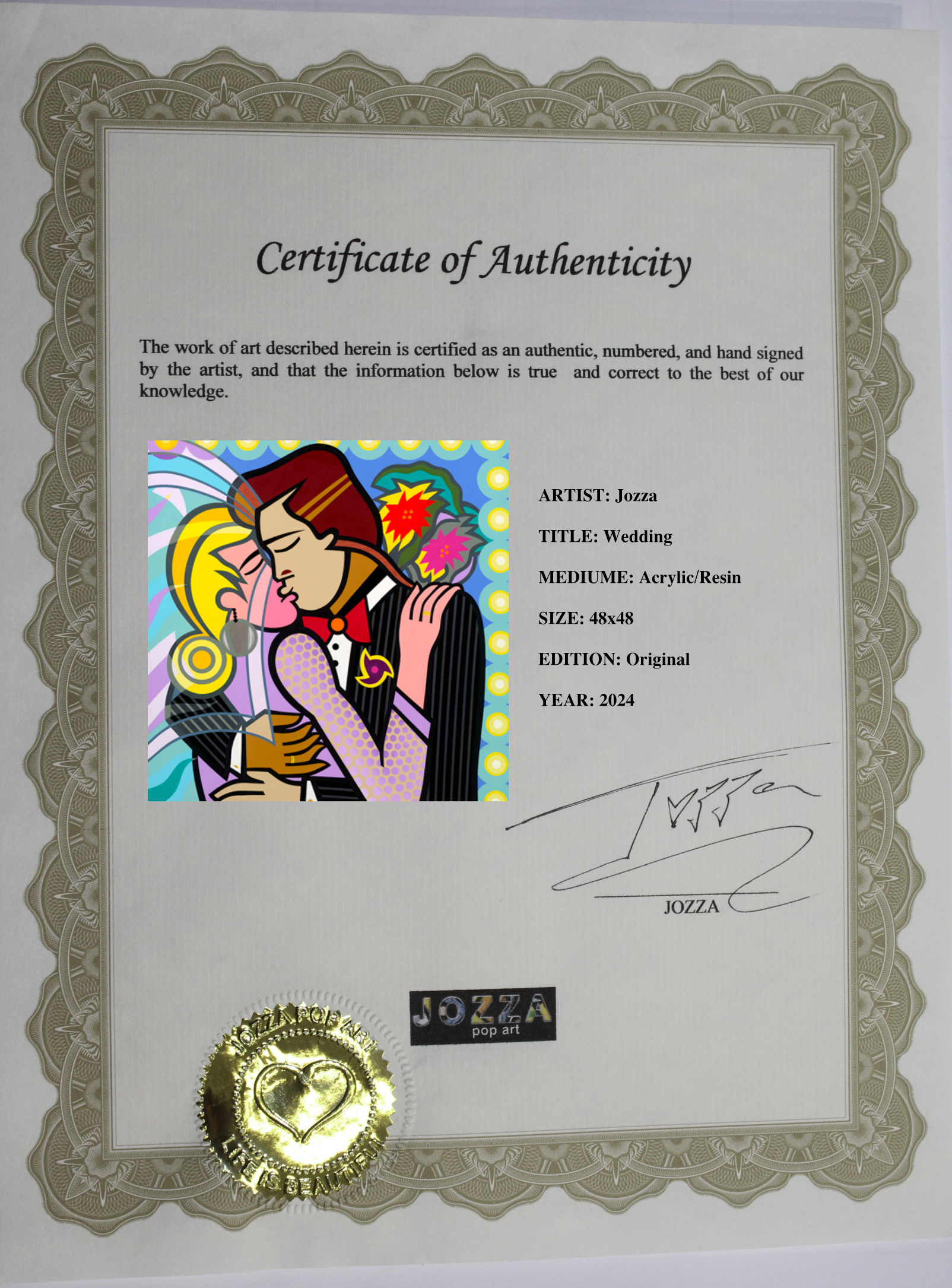 Wedding Kiss, A Wall Art Painting by Jozza, Original Acrylic print on Canvas, hand signed and numbered by the artist. Jozza, born in 1958 in Hidrolandia, a small town located in central Brazil, one of the most exciting Pop Artists in the world today, creates his artistic vision with vibrant imagery and combinations of bright color and hard-edged abstract subjects. This artwork comes gallery wrapped, stretched ready to hang Size: 48"L x 48"W x 1"H. Weight is: 6Lb