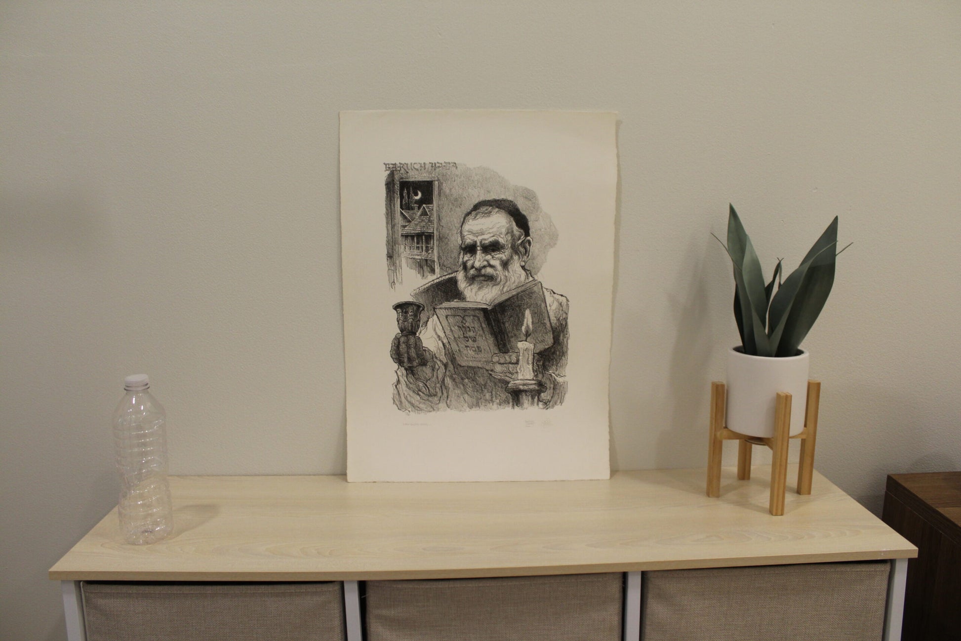 When Elijah Comes... by Emanuel Schary is a mesmerizing black and white Lithograph that captures a sacred moment. Witness a man immersed in the Passover prayer book, holding a glass of wine, and earnestly praying for Elijah's arrival. This poignant artwork brings the spirit of tradition into your space, making it a heartfelt addition to your collection. Elevate your home with the beauty of faith and heritage! Size: 10"L x 14"W x "H. Weight is: 2Lb