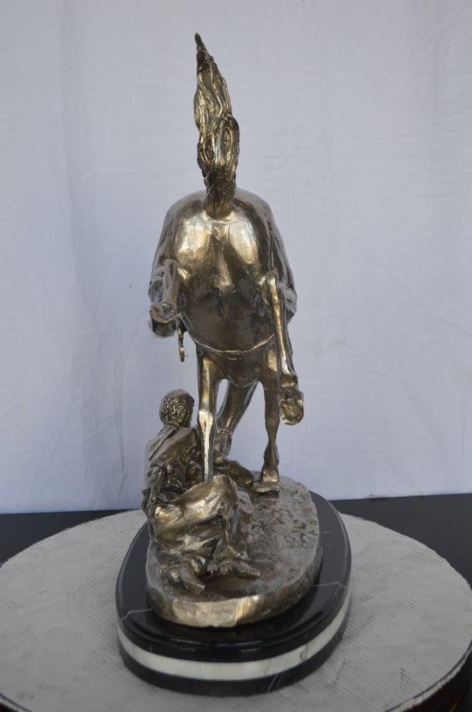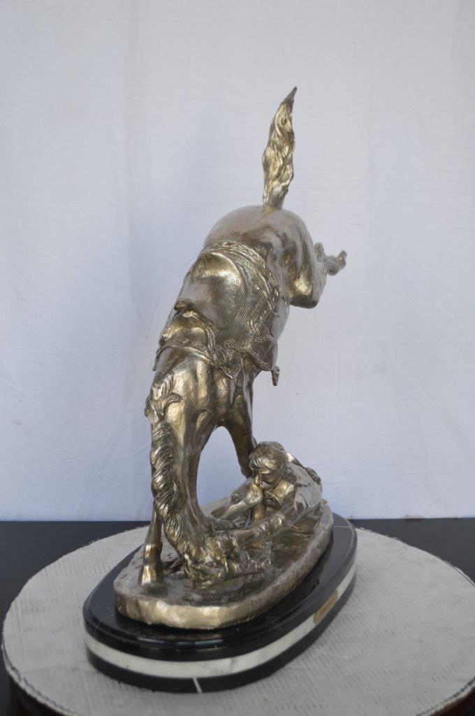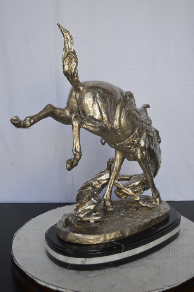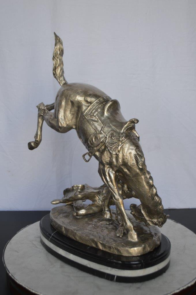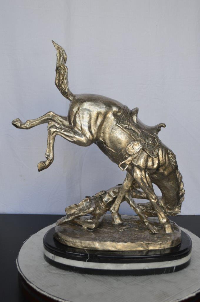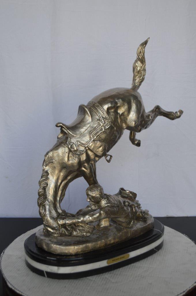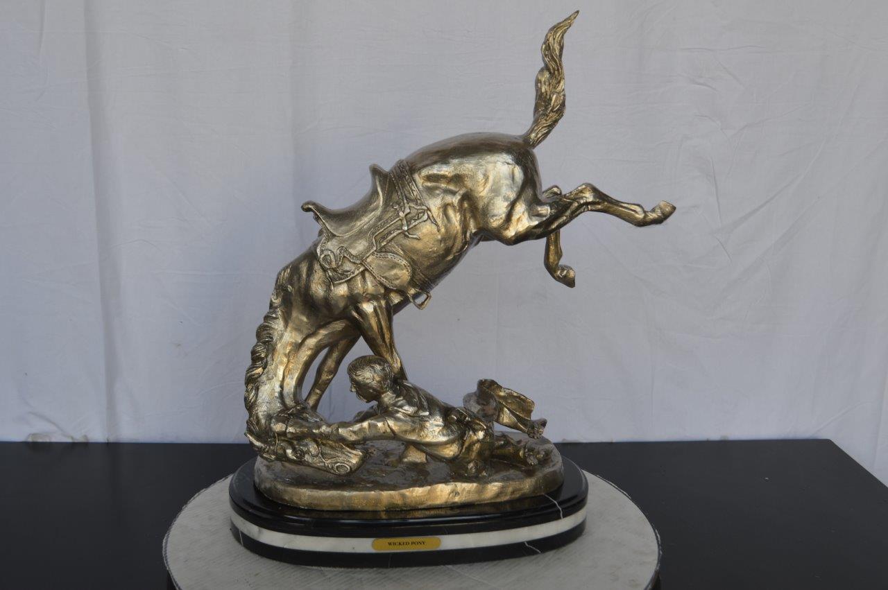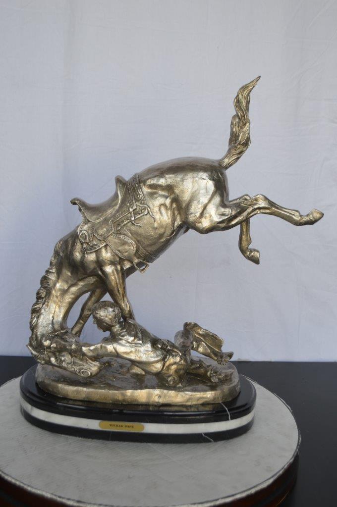 The Remington-inspired silver finished Bronze Statue, Wicked Pony, mounted on a marble base depicts a scene from the Wild West. The Wicked Pony sculpture presents a cowboy that had been thrown from a rank tempered bronc. Inspired by a real-life event, this Remington bronze sculpture depicts a fallen rider attempting to wrestle his horse to the ground in a desperate attempt to regain control. Silver finished bronze with the greatest attention to detail, this replica will add an air of the American frontier history to your home. Size: 11"L x 22"W x 26"H. Weight is: 58Lb