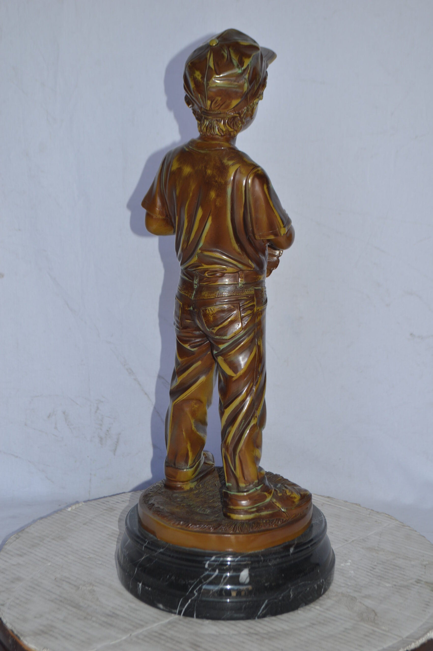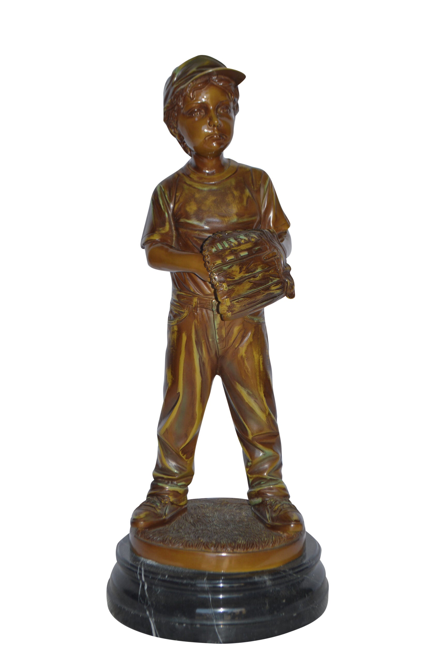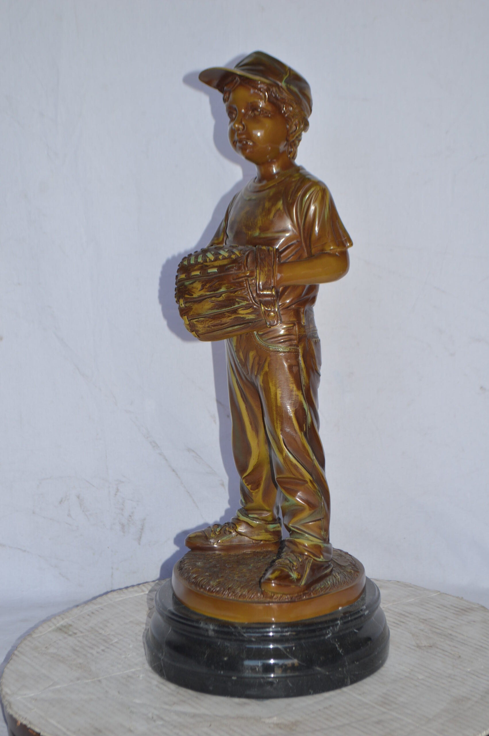 With his Baseball glove and uniform, this sculpture shows the innocence of a young American boy playing baseball mounted on a heavy marble base. This exceptionally fine and unique abstract was casted using the ancient old Lost Wax Method stained in green and brown patina finish for preservation. This beautiful large bronze-cast statue will be a valuable addition to any area of the home, office, patio, or outside in the garden. Size: 12"L x 12"W x 28"H. Weight is: 42Lb