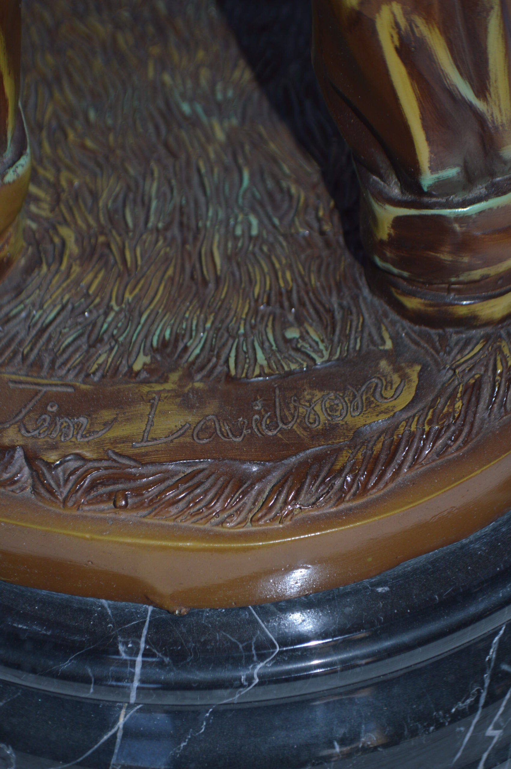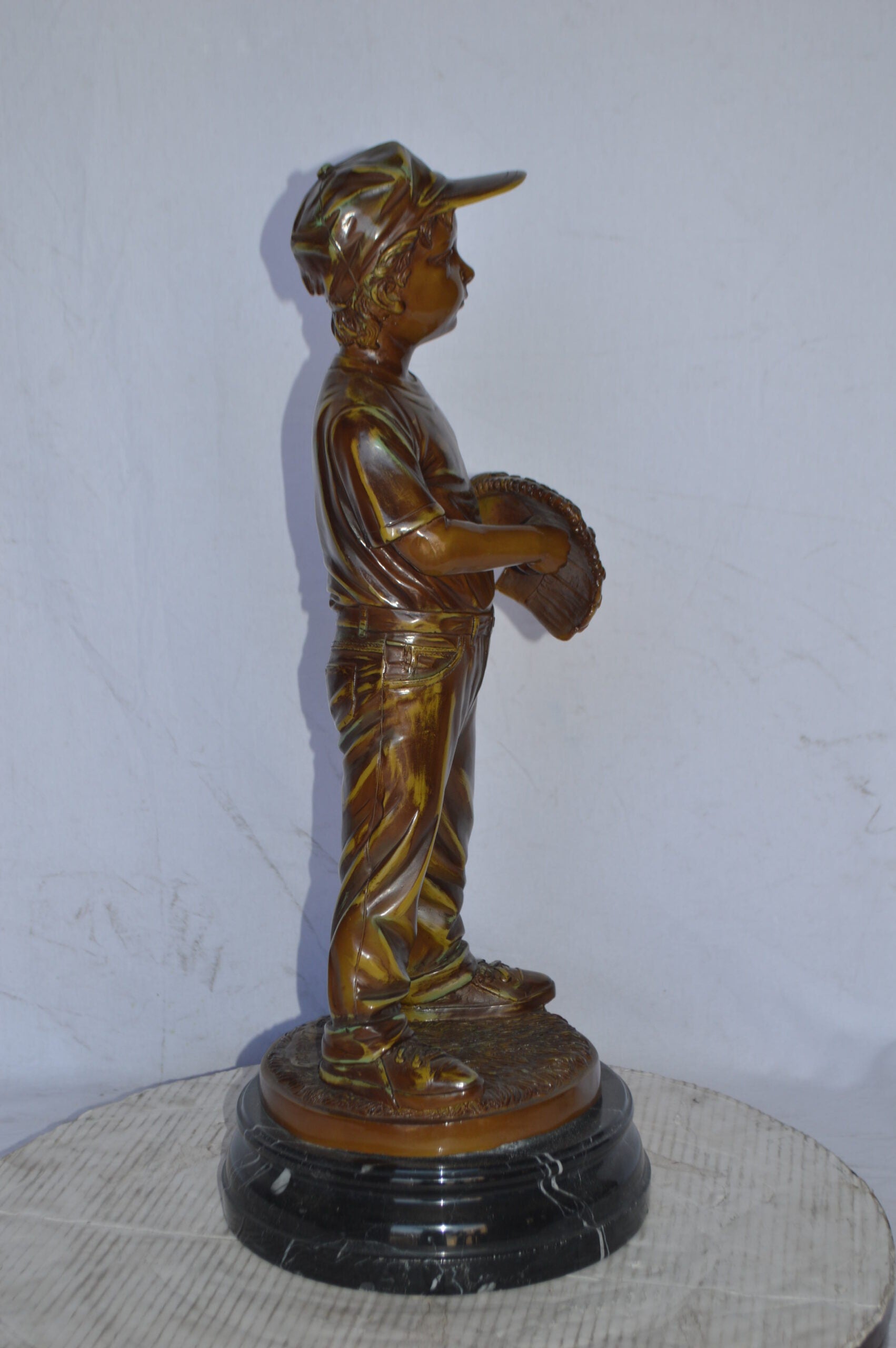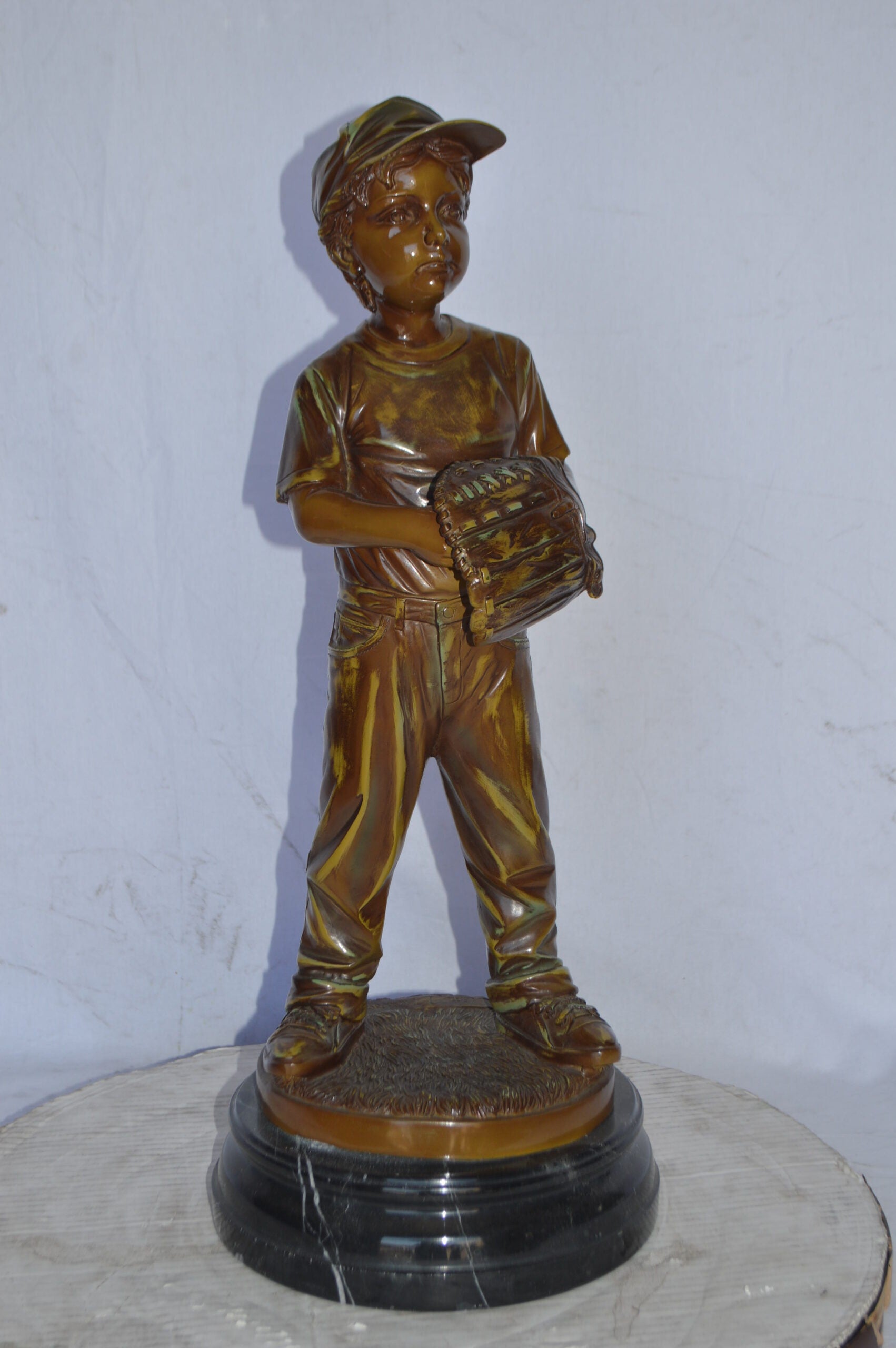 With his Baseball glove and uniform, this sculpture shows the innocence of a young American boy playing baseball mounted on a heavy marble base. This exceptionally fine and unique abstract was casted using the ancient old Lost Wax Method stained in green and brown patina finish for preservation. This beautiful large bronze-cast statue will be a valuable addition to any area of the home, office, patio, or outside in the garden. Size: 12"L x 12"W x 28"H. Weight is: 42Lb
