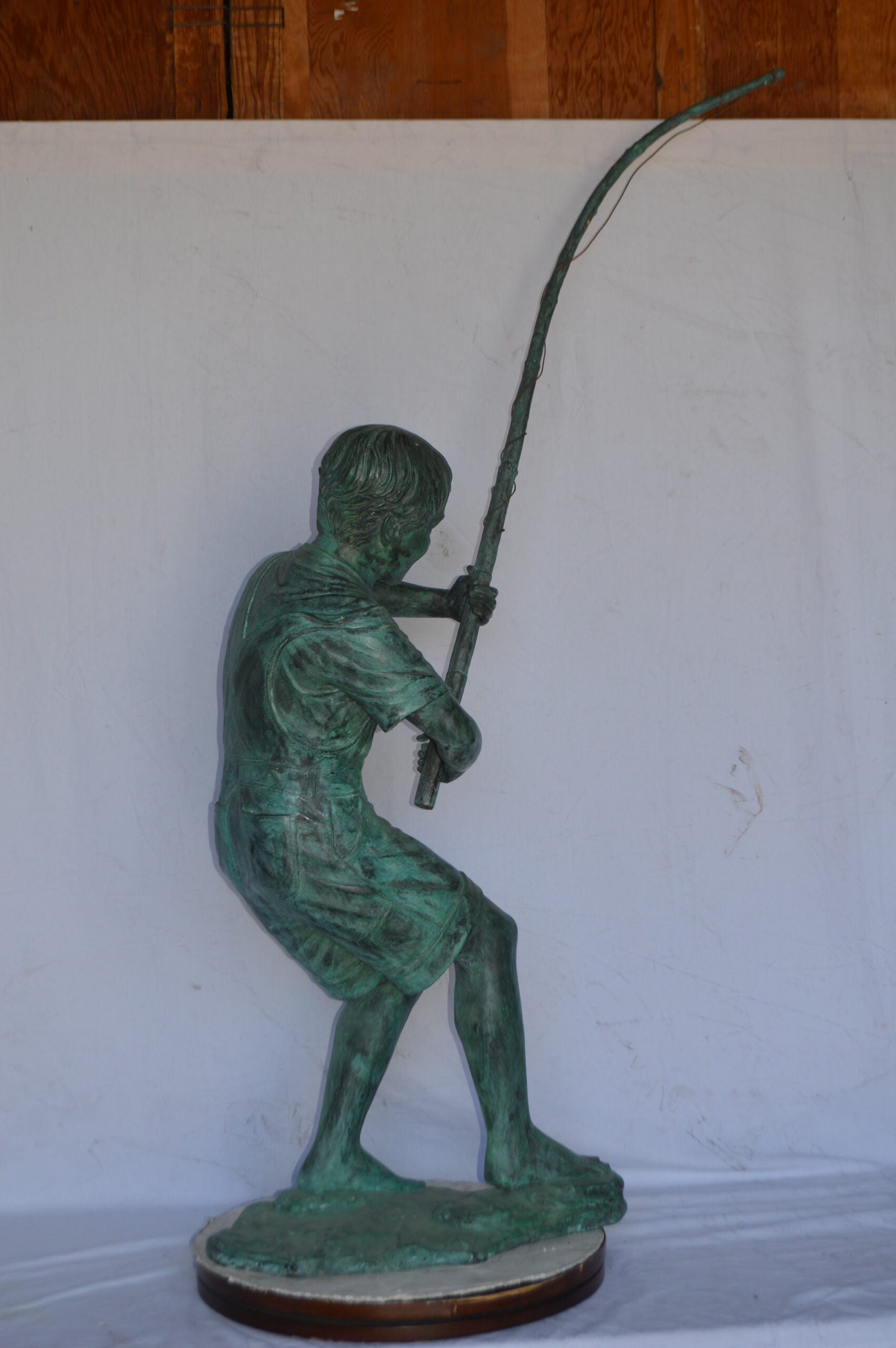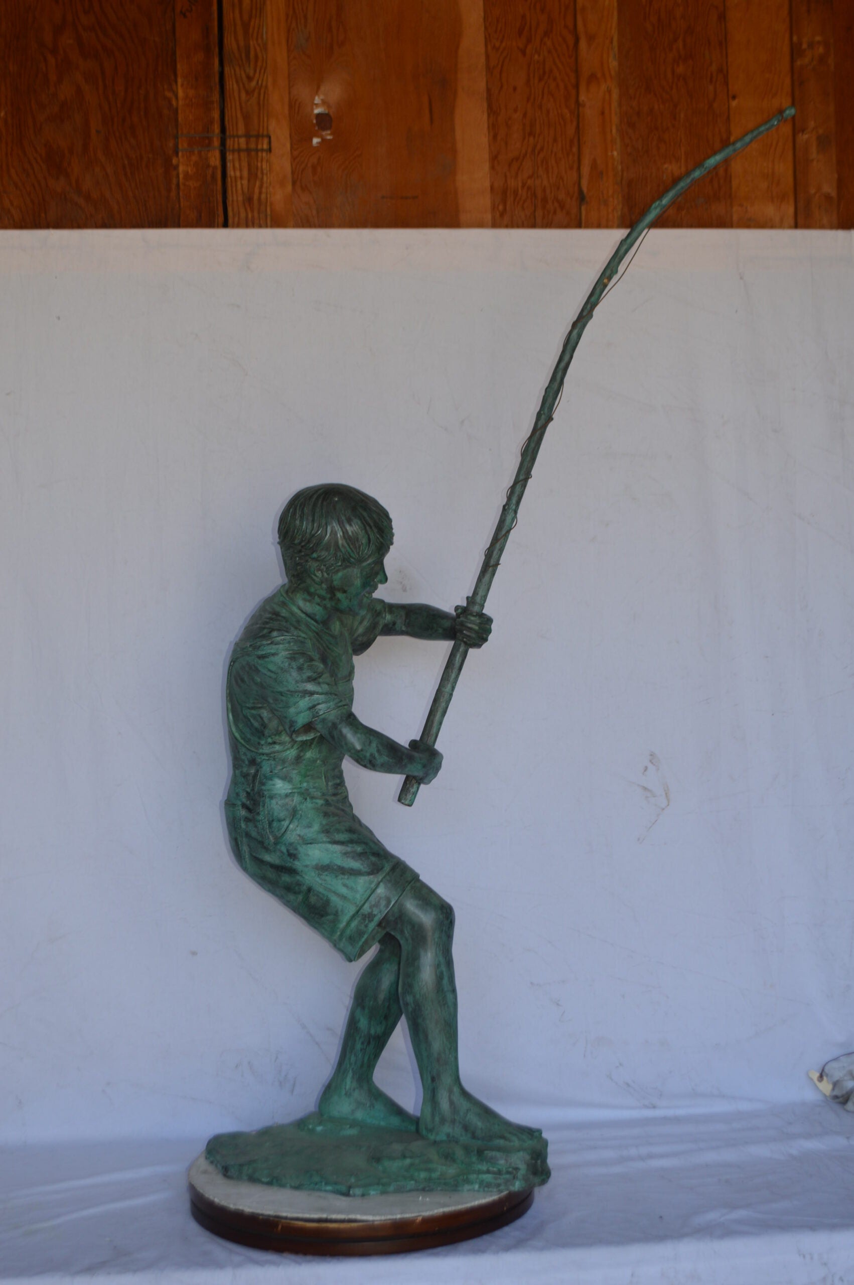 This young boy is interacting with his fishing rod. As evidenced by his face and the size of his rod, he is fighting some large catch. This beautiful bronze statue is cast using the "Lost Wax" method and is covered with a patina finish. This bronze statue is particularly great for any fan of fishing, nature, or art. This is sure to make any observer reminisce about a simpler, more youthful time. Size: 16"L x 54"W x 62"H. Weight is: 88Lb