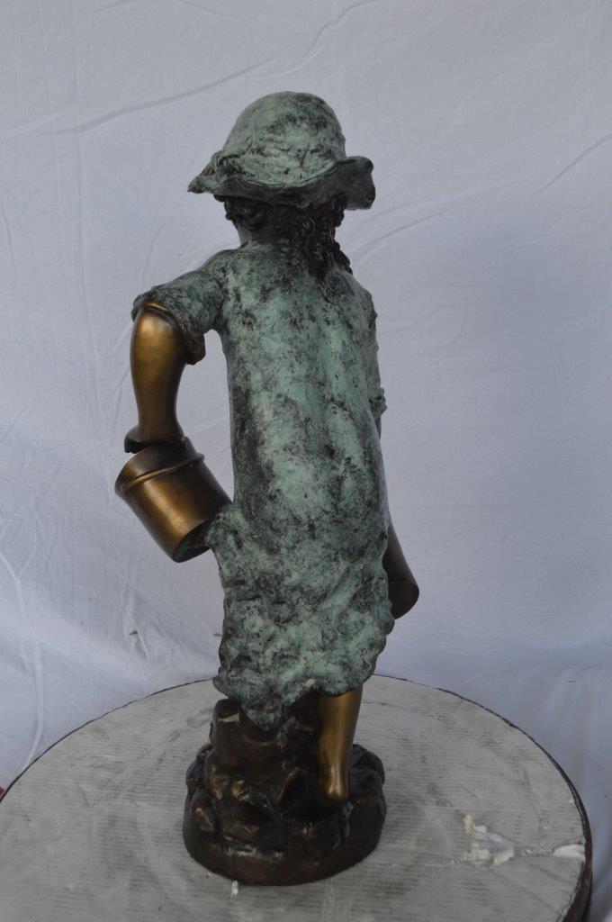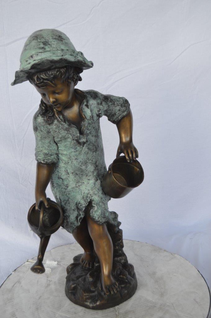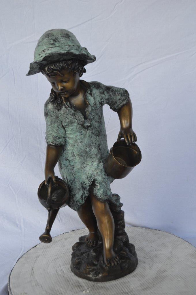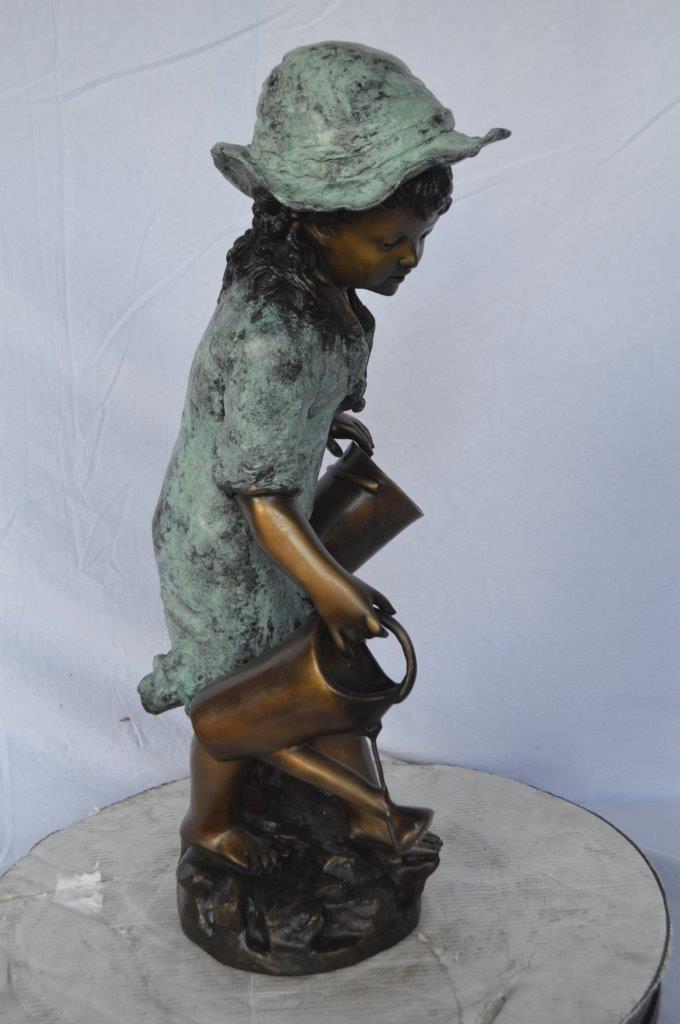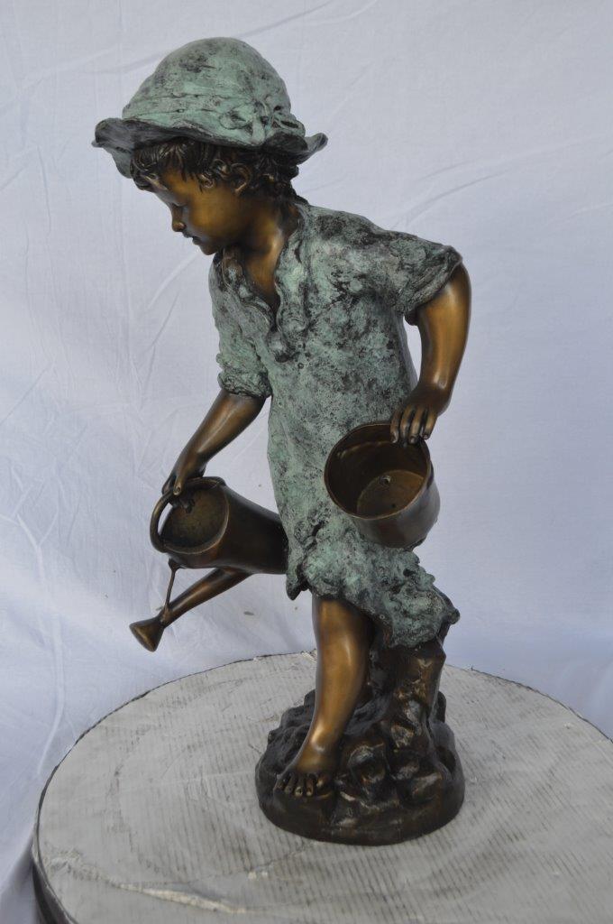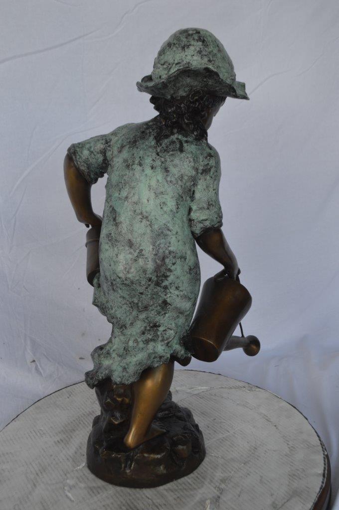 This young girl is gardening with a small watering can. Clearly she is dedicated to her craft. This statue is cast in bronze using the Lost Wax method and is covered in a green patina. Water spills from the watering can and from the bucket with the use of a fountain pump (pump not included). This is an impressive addition to any home, patio, or garden in particular. Any fan of gardening, nature, or art will appreciate the exquisite details in this bronze sculpture. Size: 12"L x 14"W x 28"H. Weight is: 29Lb