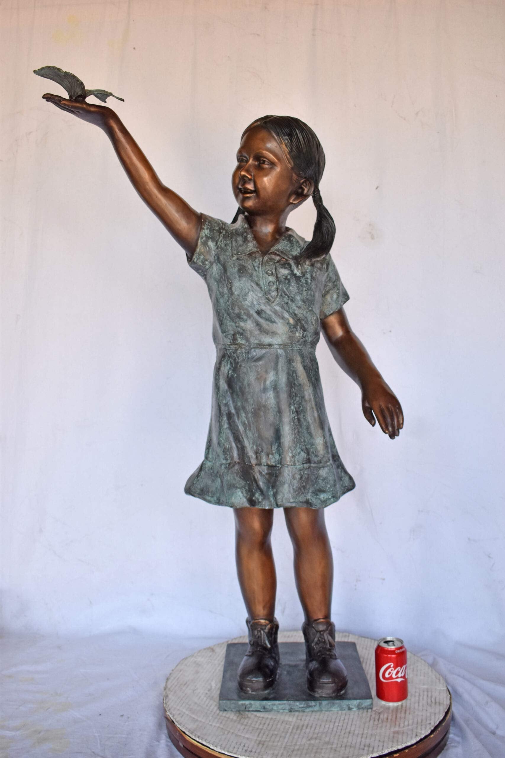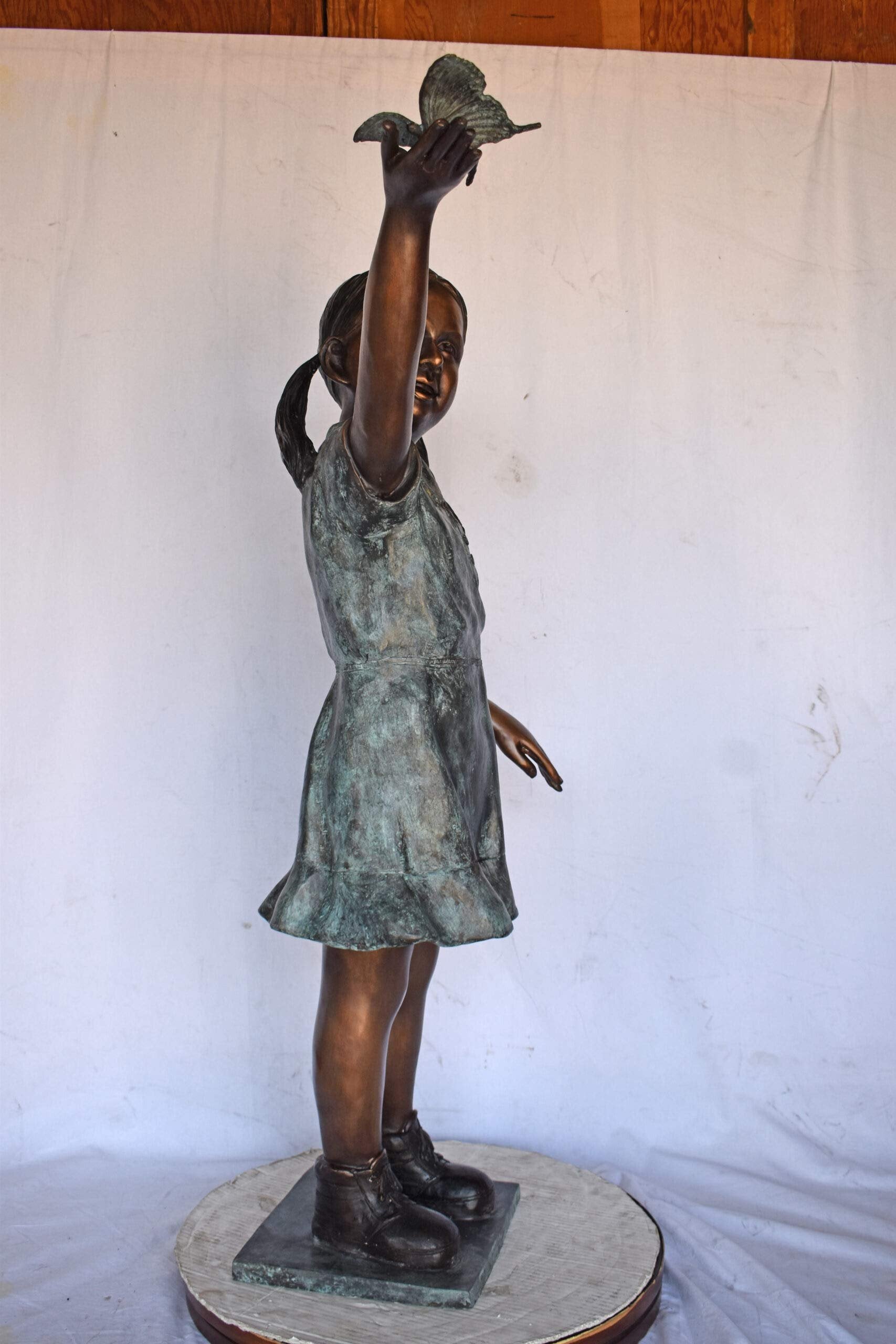 This charming life size statue depicts a little girl holding a butterfly while setting it free. This fine and unique abstract of the girl and butterfly were casted using the ancient old Lost Wax Method with brown and green patina finish. This bronze statue is museum quality bronze which will be a valuable addition to any area of the home, office, or patio. Size: 21"L x 11"W x 49"H. Weight is: 65Lb
