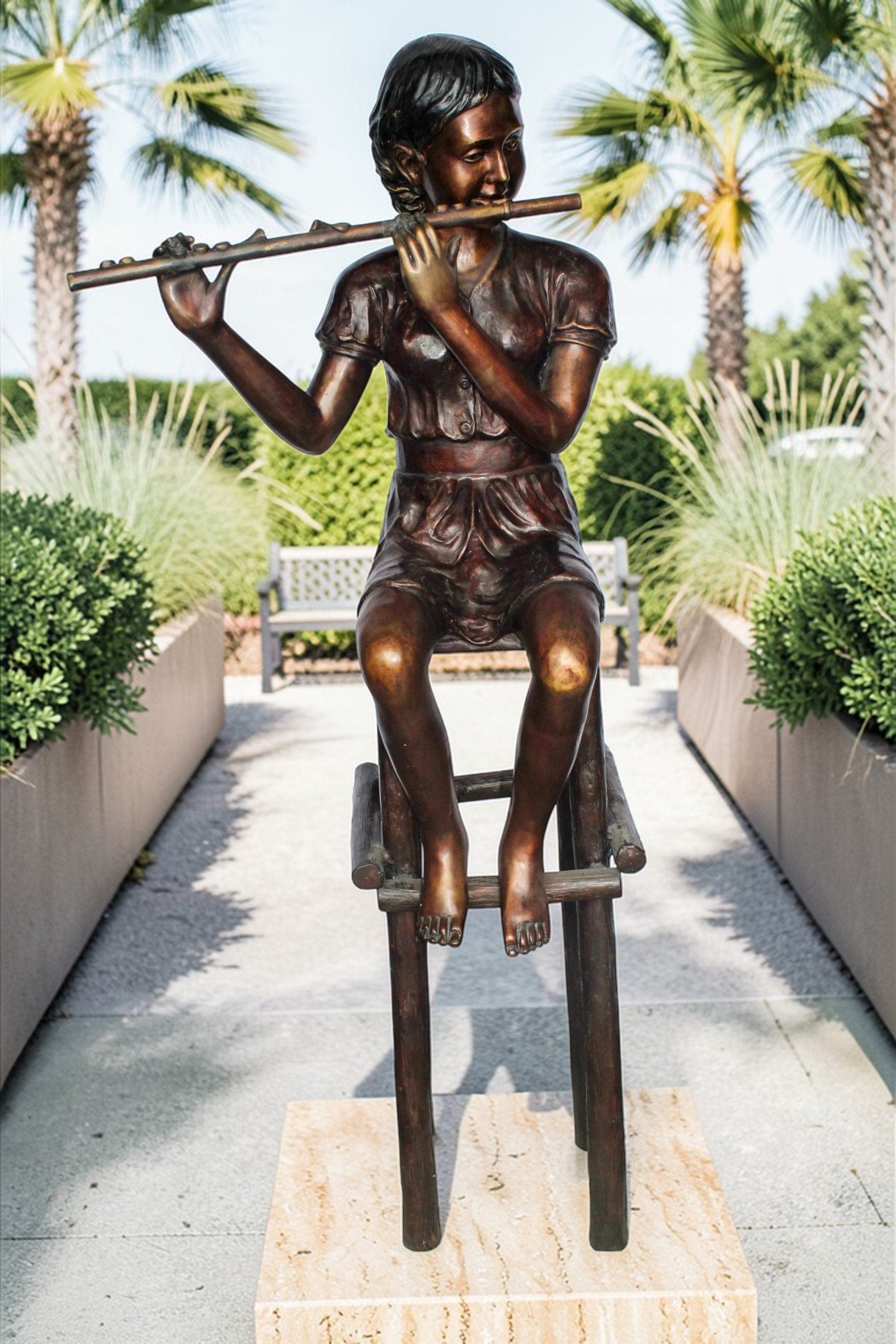 This bronze statue depicts a young girl playing the flute while sitting on a chair, handcrafted and cast using the traditional lost wax method. The intricate details bring a sense of tranquility and artistry to any space. Perfect for gardens or interiors, this piece showcases skilled craftsmanship and a love for music. Size: 24"L x 16"W x 58"H. Weight: 75Lb