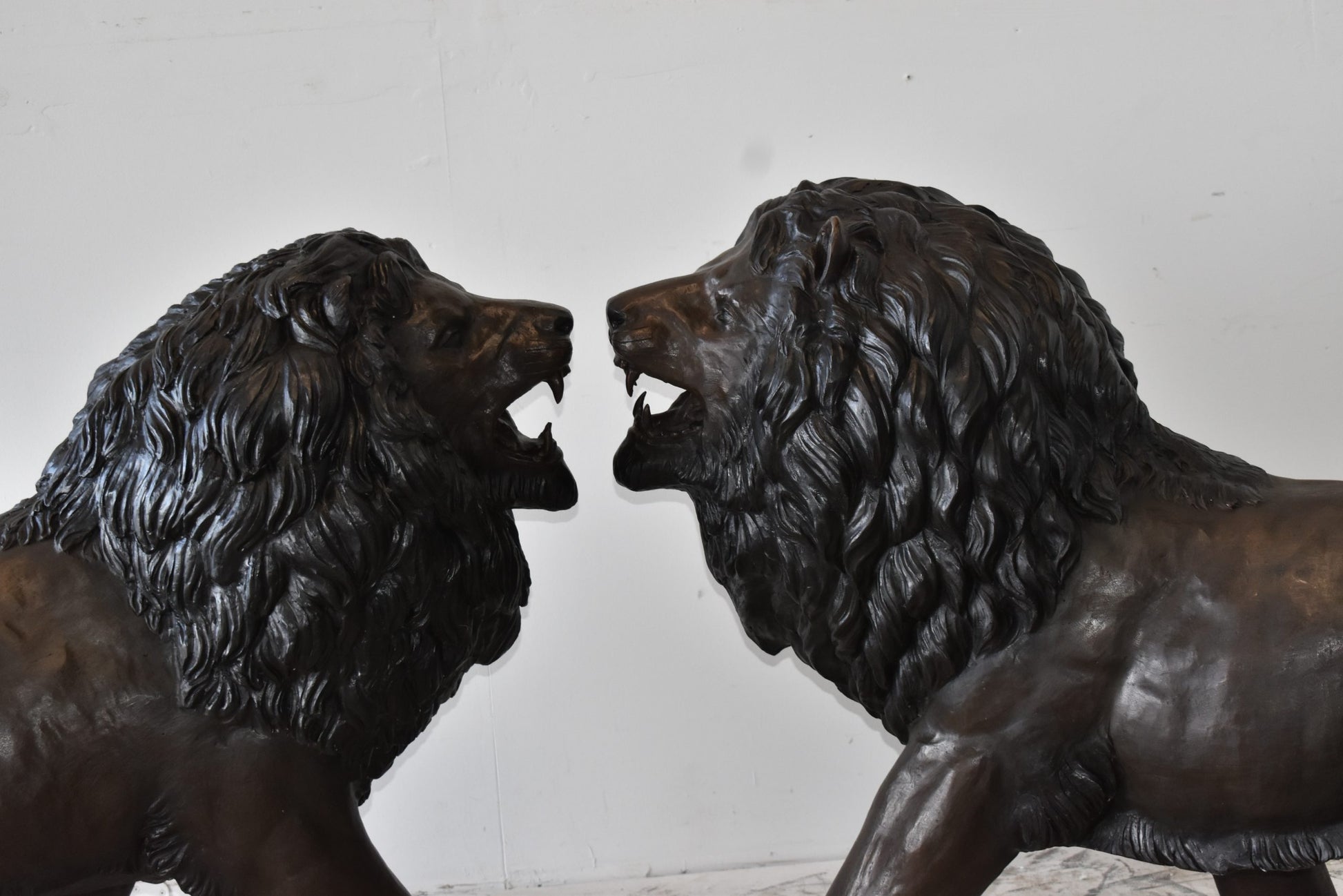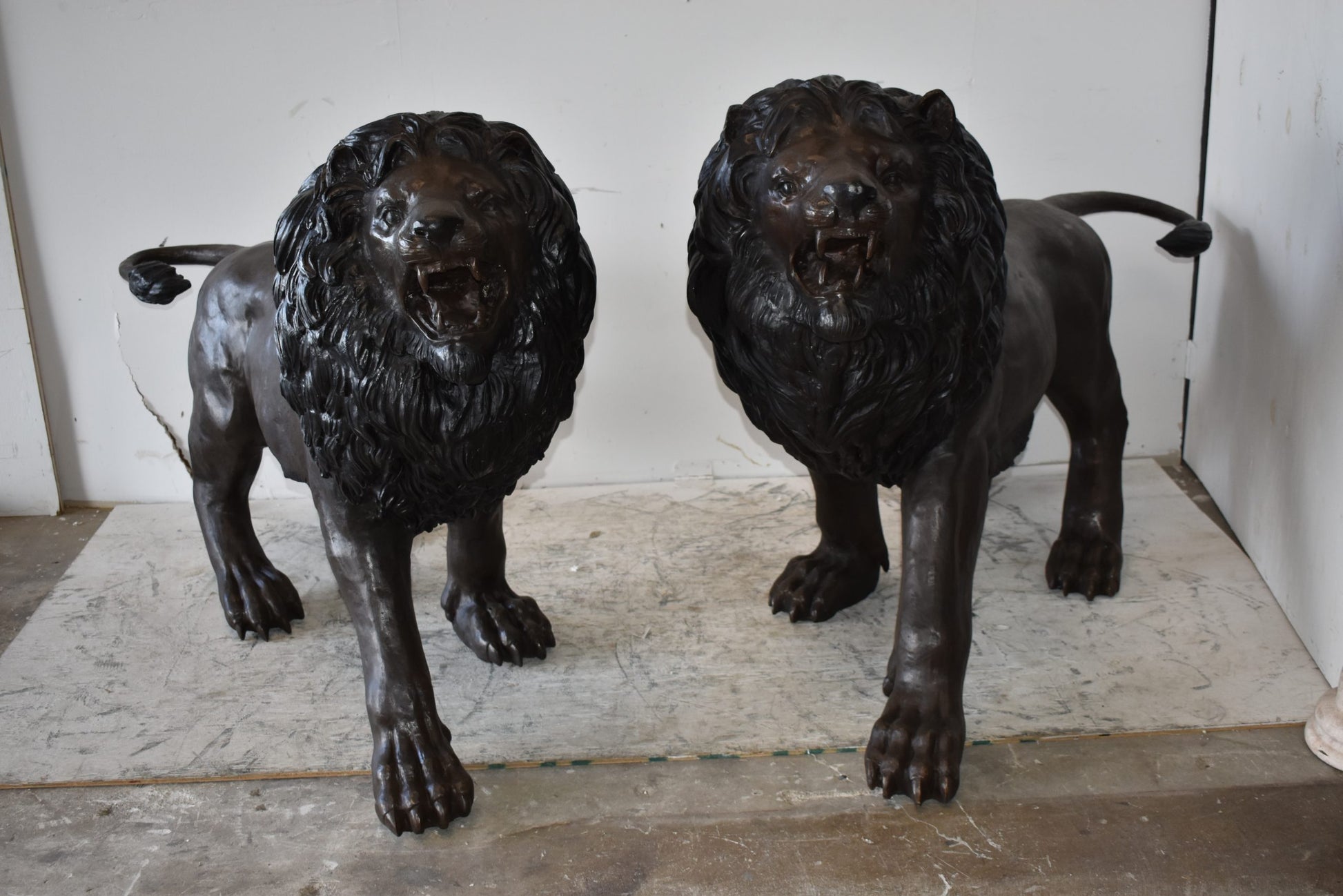These two large-size lions are pridefully standing, looking away from one another and watching the kingdom. Their gorgeous manes are hanging down their body with exquisite details, giving them a particularly majestic look. These two are true examples of two pieces of museum quality hand-casted bronze using the Lost Wax Process of bronze casting. Size: 24"L x 60"W x 41"H. Weight is: 160Lb