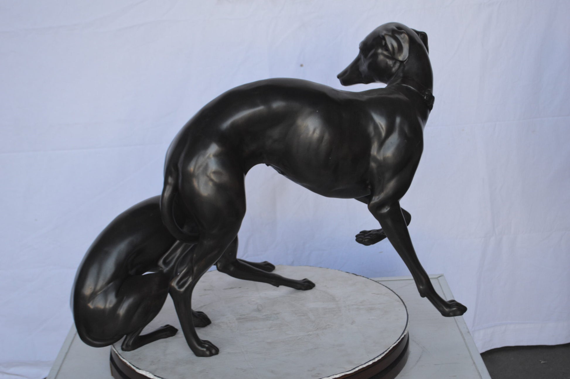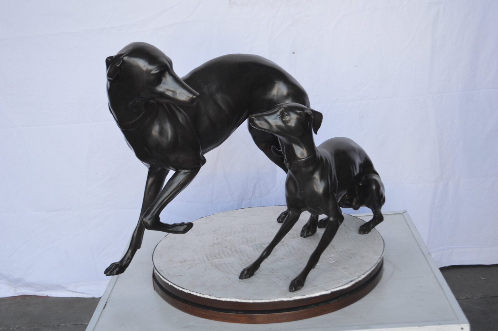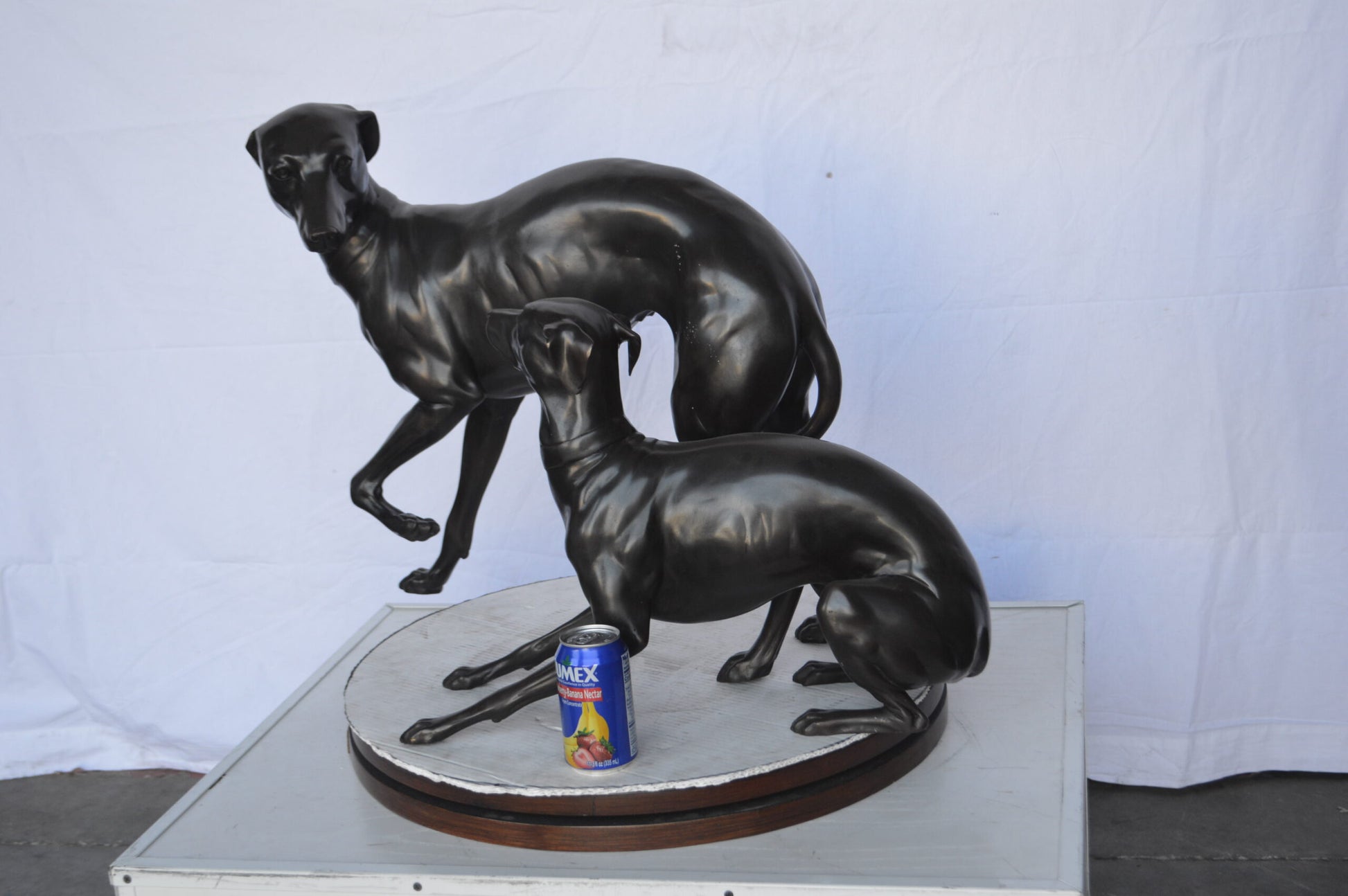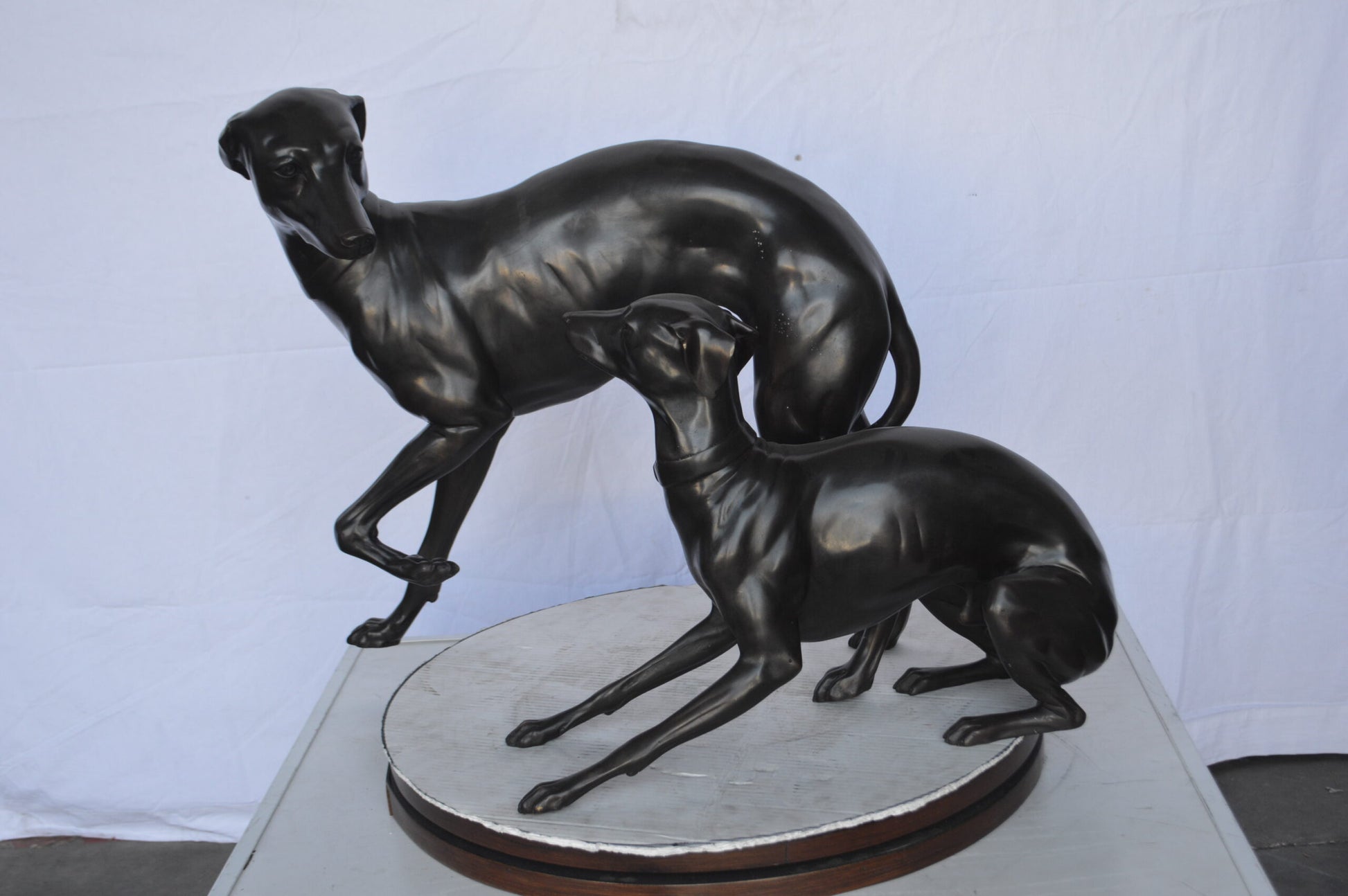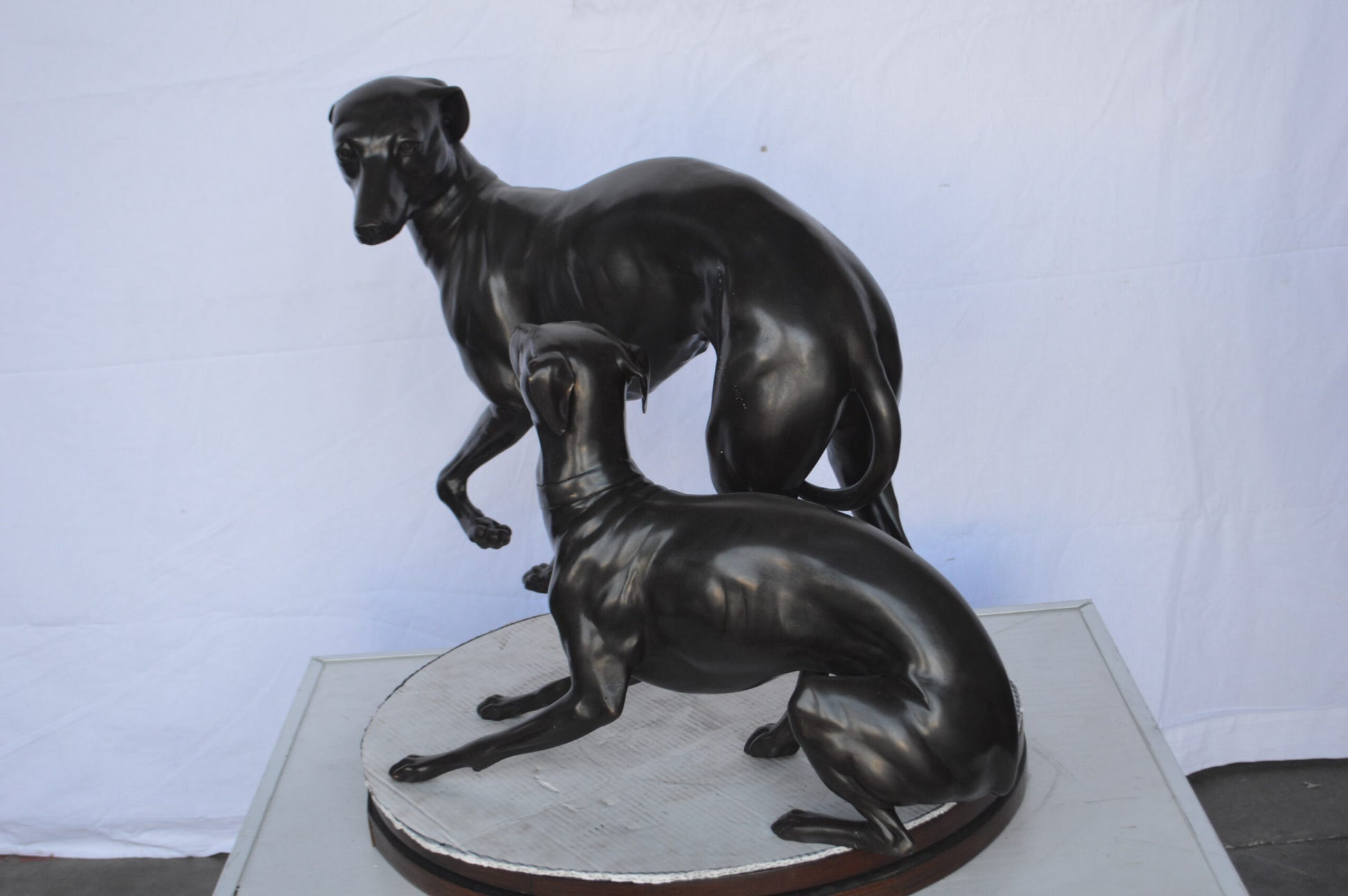 This charming life size bronze statue depicts Beautiful a pair of Whippet Dogs playing together. The Whippet (also English Whippet or Snap Dog) is a dog breed of medium size. They are a sighthound breed that originated in England, where they descended from Greyhounds. Whippets today still strongly resemble a smaller Greyhound. Whippets also participate in dog sports such as lure coursing, agility, and flyball. The name is derived from an early 17th-century word, now obsolete, meaning to move briskly. These are beautiful bronze statues stained in dark brown patina with a clear finish for preservation. These bronze statues are a museum quality and hand-cast in high-quality pure bronze using the Lost Wax Process of bronze casting. Size: 32"L x 17"W x 23"H. Weight is: 37Lb