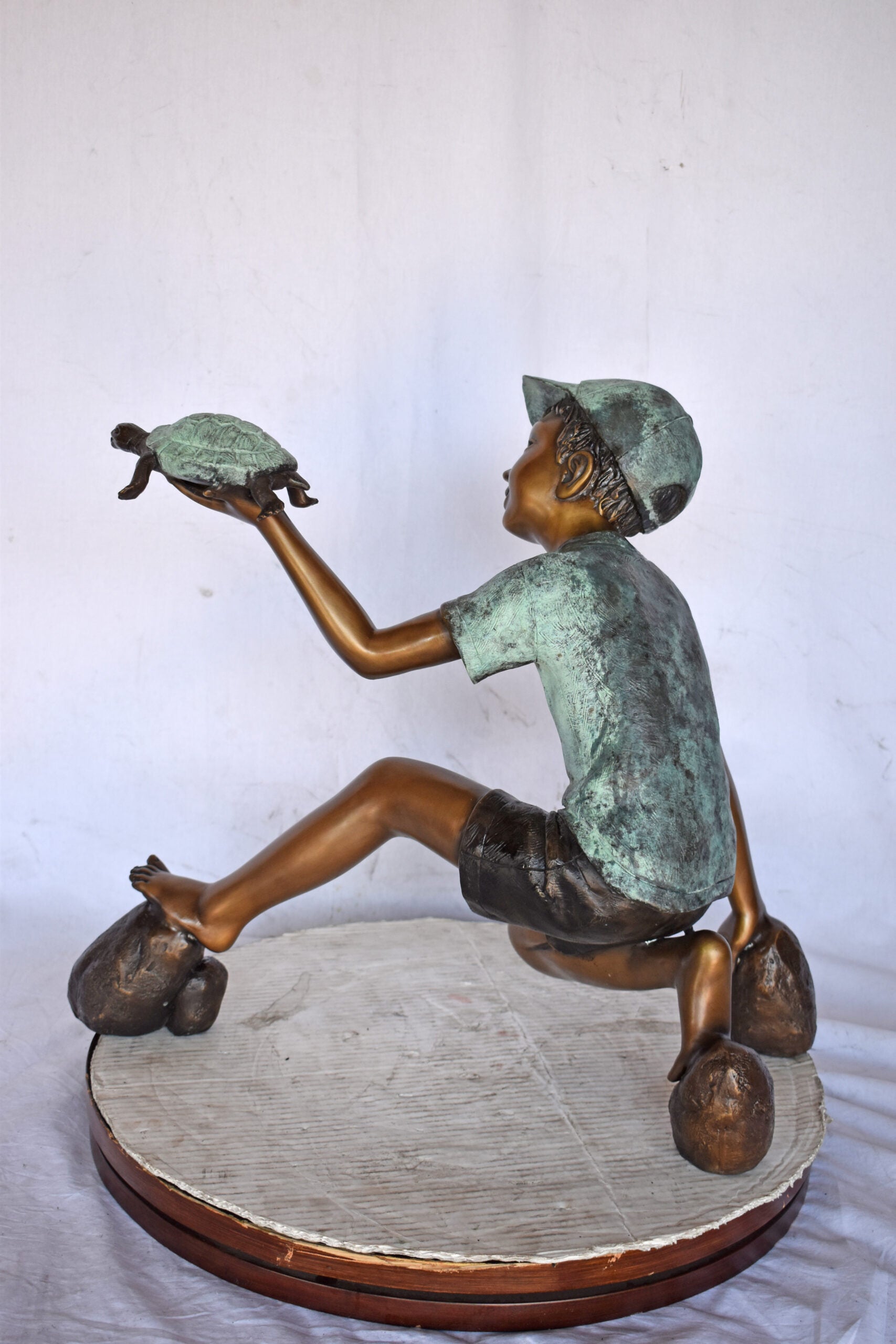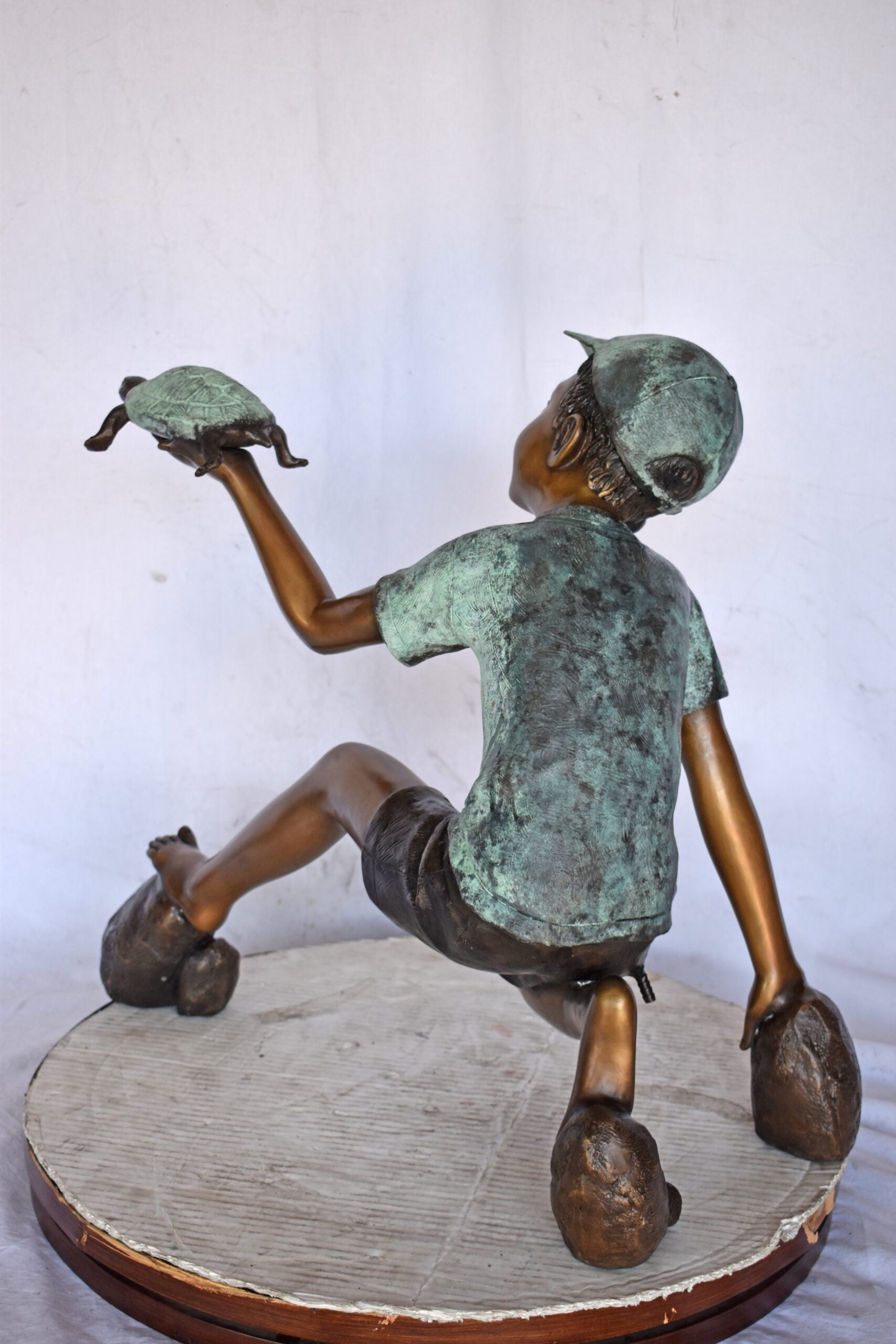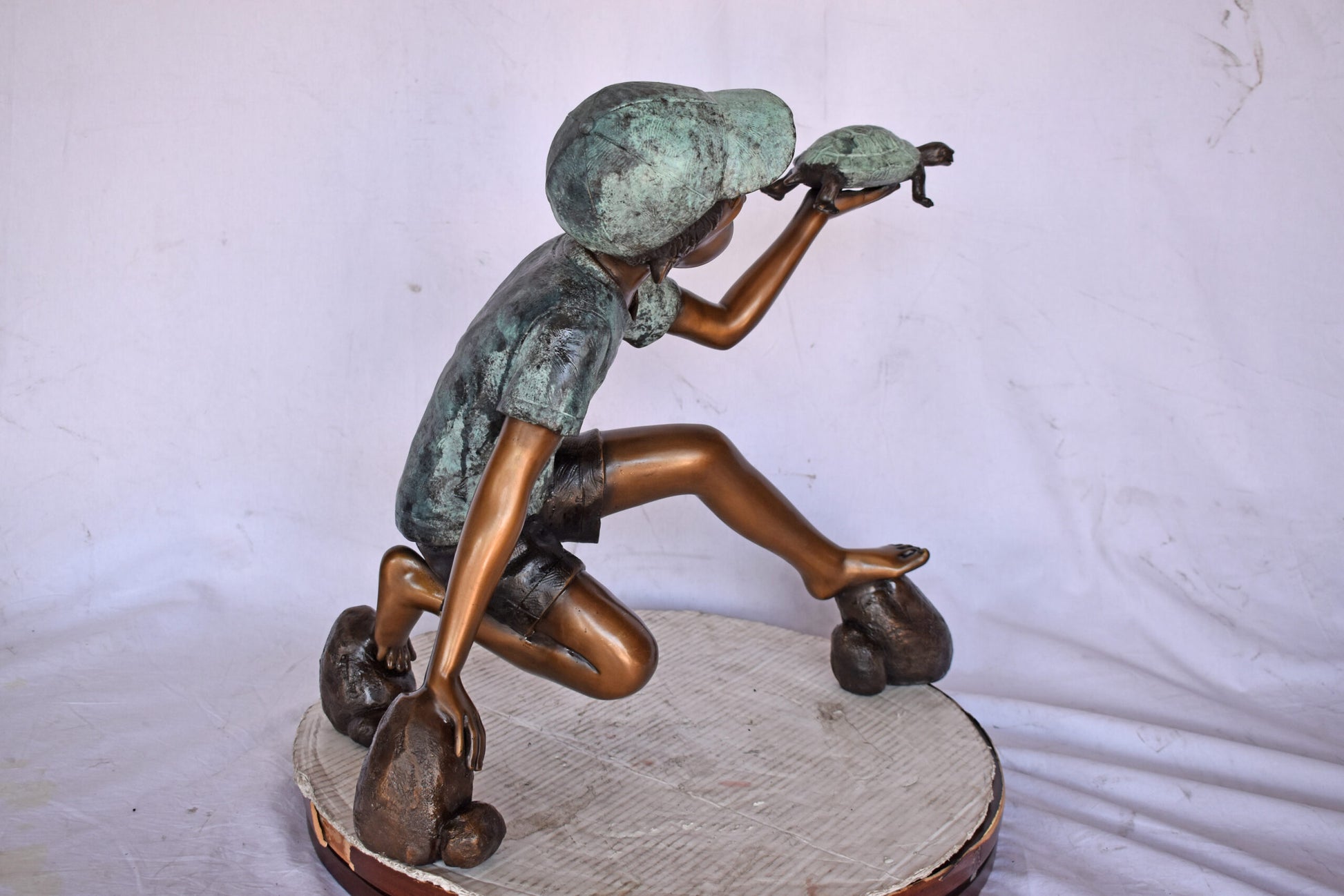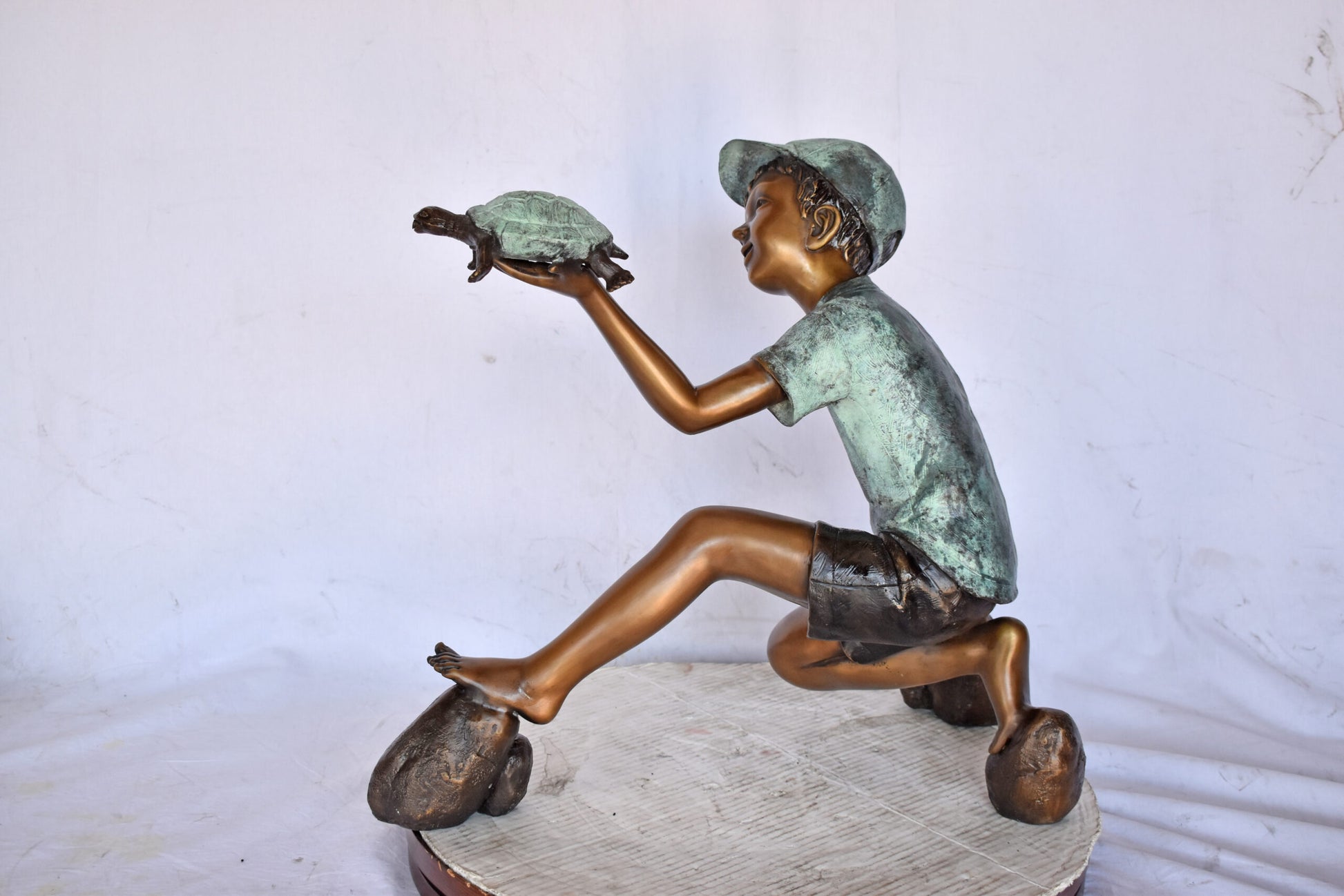 Adventurous Boy Holds a turtle bronze statue fountain-Size 22" x 11" x 23"H