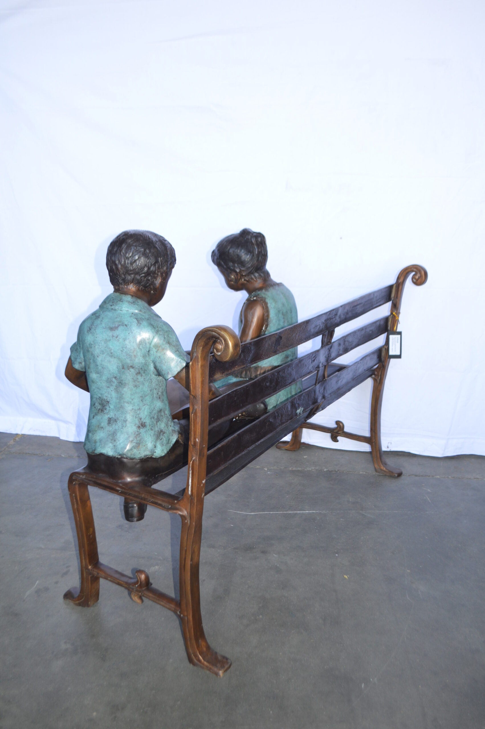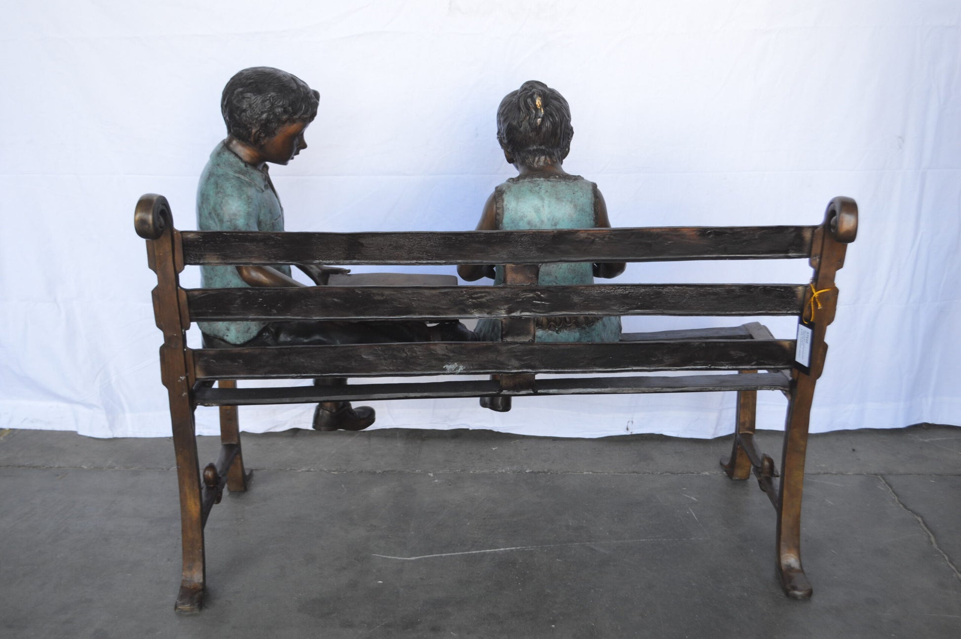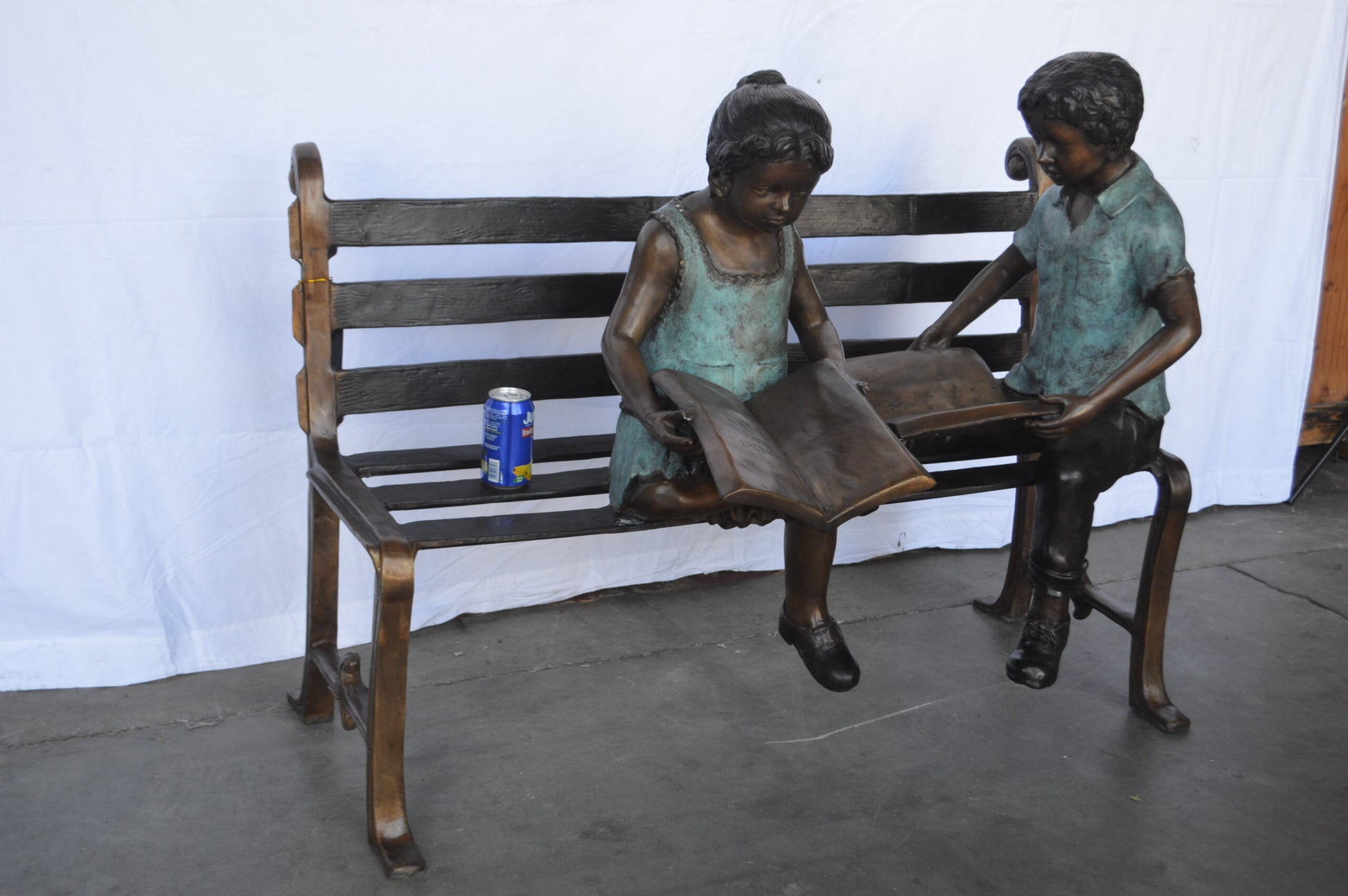 Magnificent real life size bronze statue of two kids sitting on a bench outside reading a book. The joy of kids getting lost in a book, will make your landscape come alive. The Sculpture tones are finished in a lacquer patina on a heavy bronze bench. This is a perfect addition to a home that reminds us of the simple things in life. Size: 48"L x 29"W x 39"H. Weight is: 130Lb