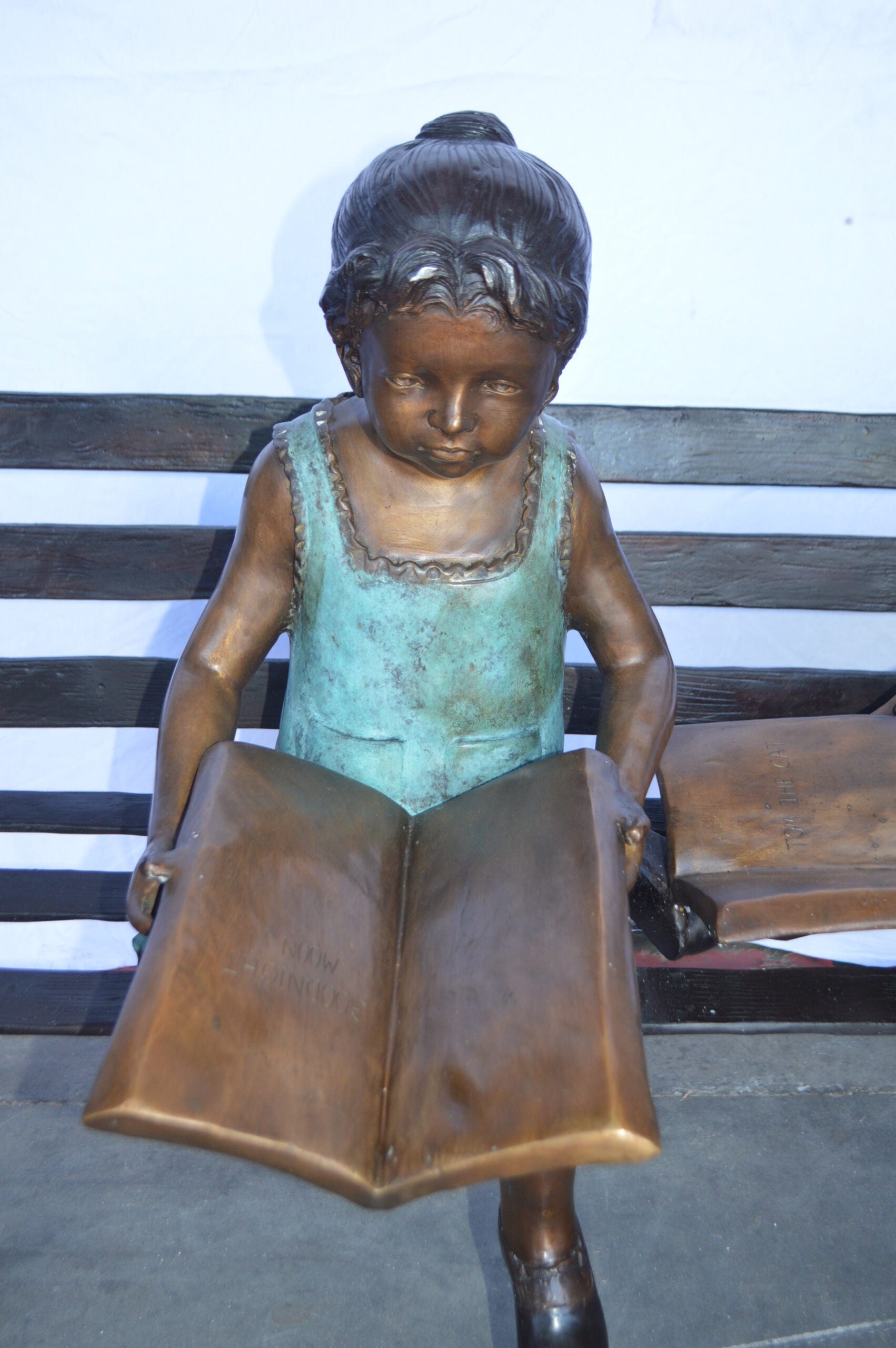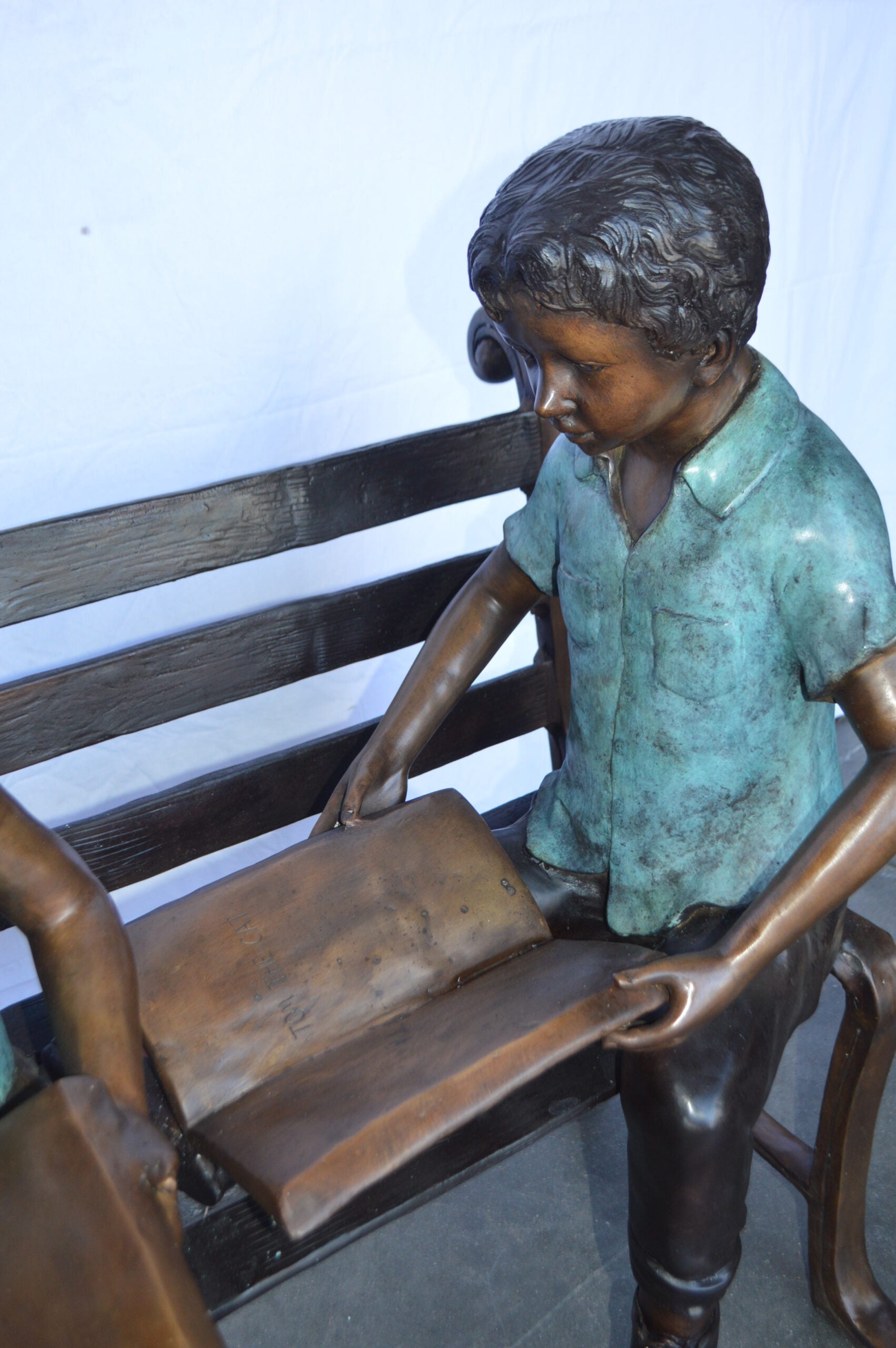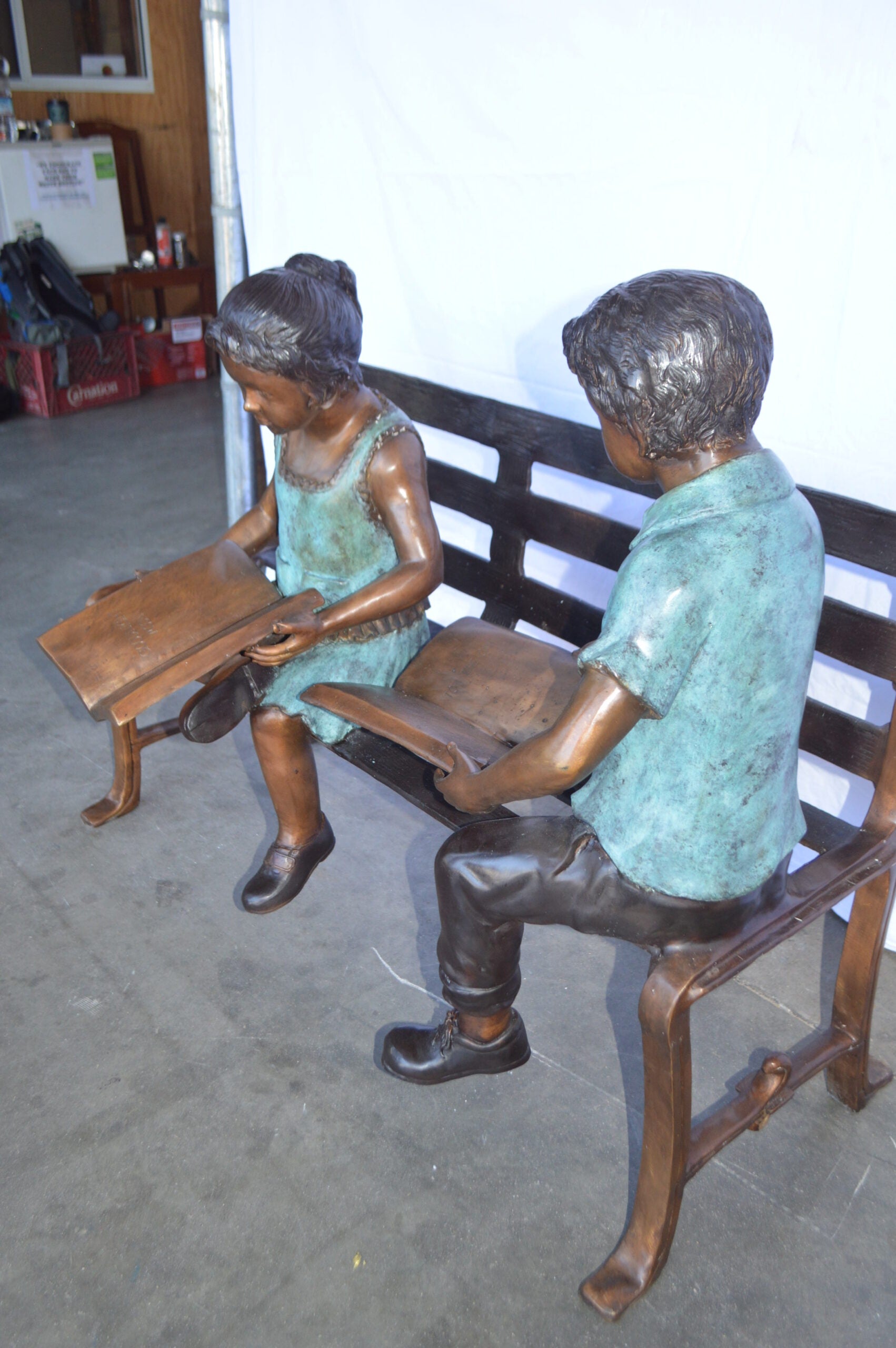 Magnificent real life size bronze statue of two kids sitting on a bench outside reading a book. The joy of kids getting lost in a book, will make your landscape come alive. The Sculpture tones are finished in a lacquer patina on a heavy bronze bench. This is a perfect addition to a home that reminds us of the simple things in life. Size: 48"L x 29"W x 39"H. Weight is: 130Lb