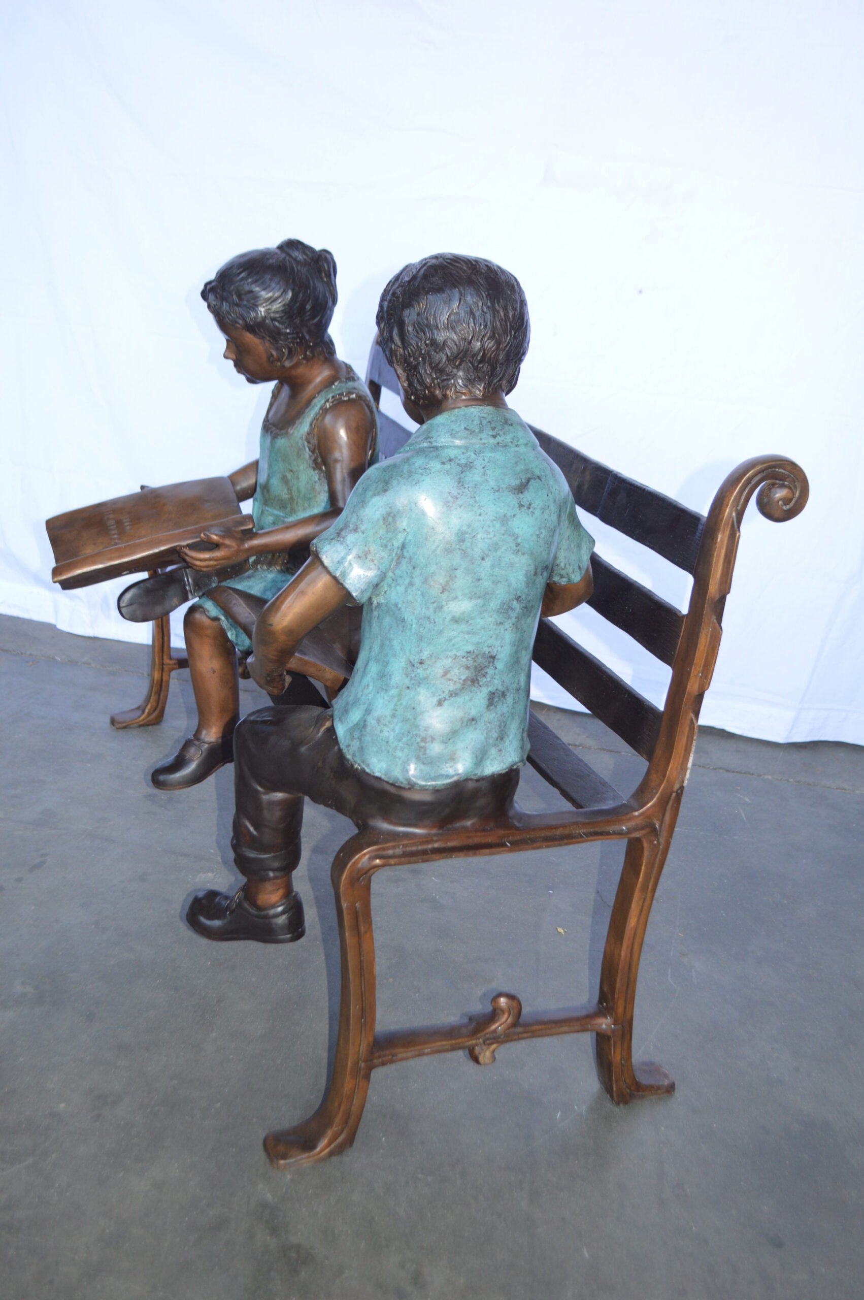 Boy And Girl Reading Books on Bench Bronze Statue - Size: 48"L x 29"W x 39"H.