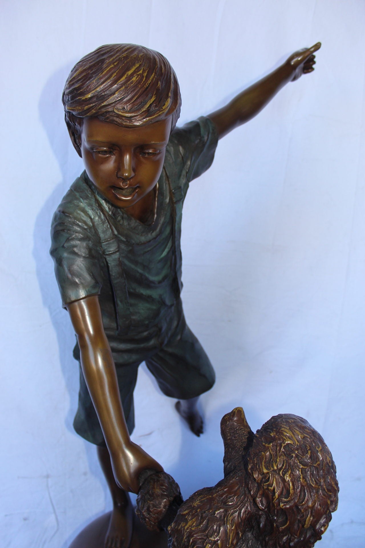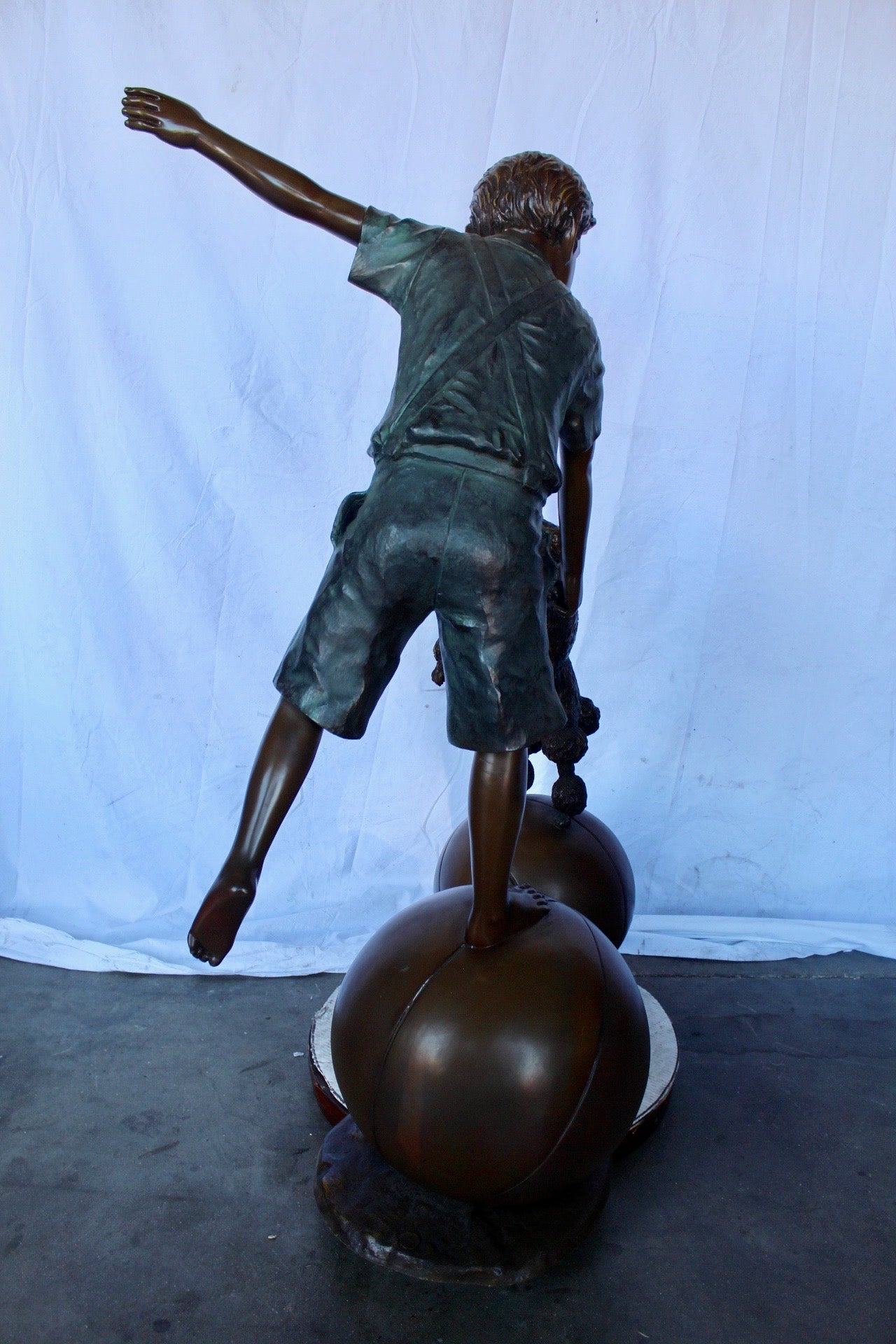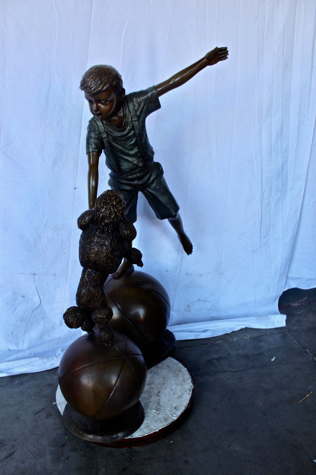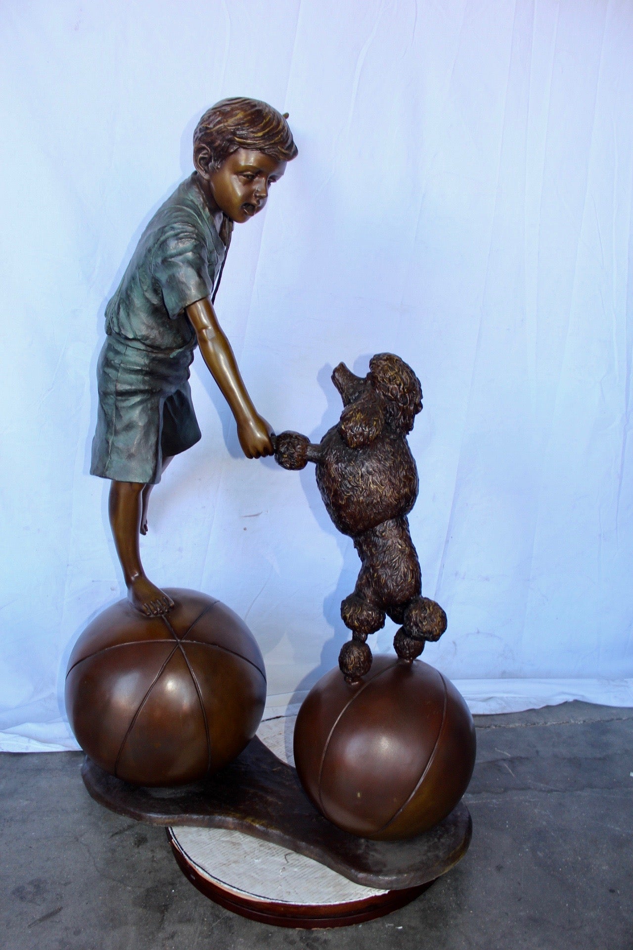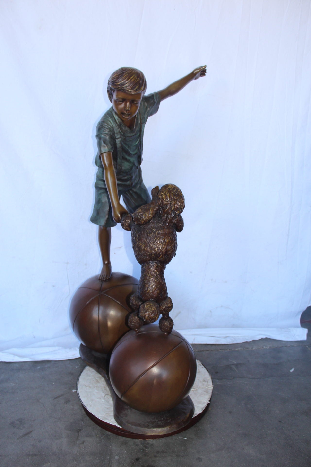 Transport your room into an adorable and lighthearted space with this large bronze statue. Depicting a young boy and poodle balancing on balls and holding hands, the statue brings about a joyful and innocent feel to any space. Using a lost wax method and green patina method, the boys outfit is extremely detailed, making it seem more realistic. Size: 38"L x 27"W x 55"H. Weight is: 98Lb