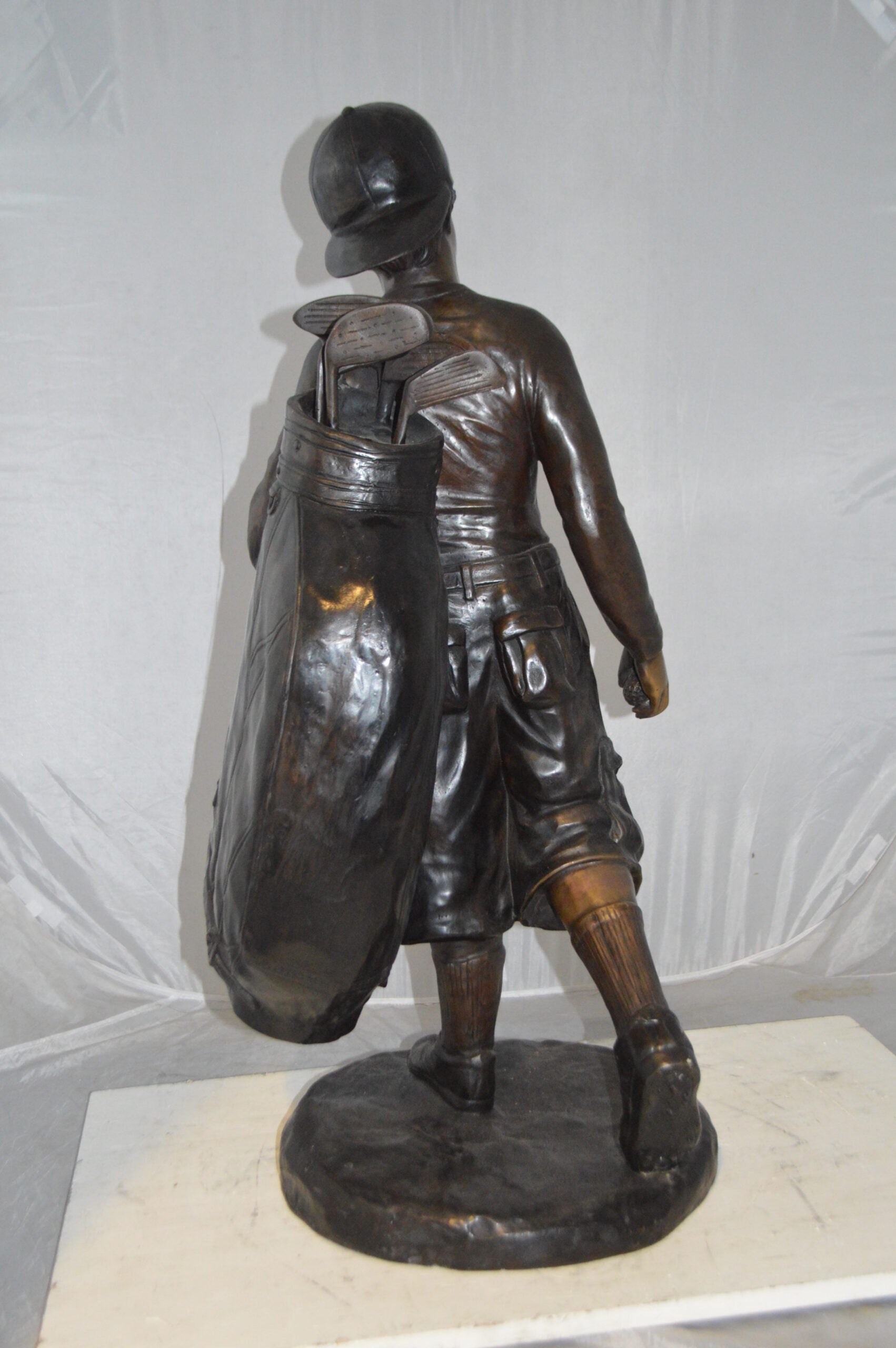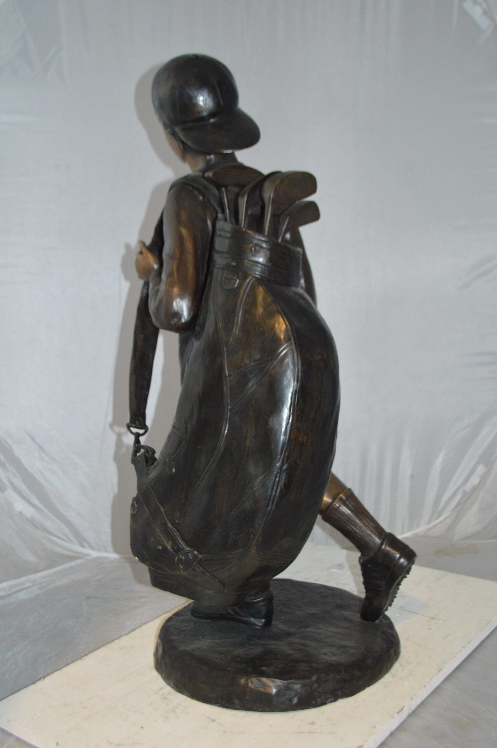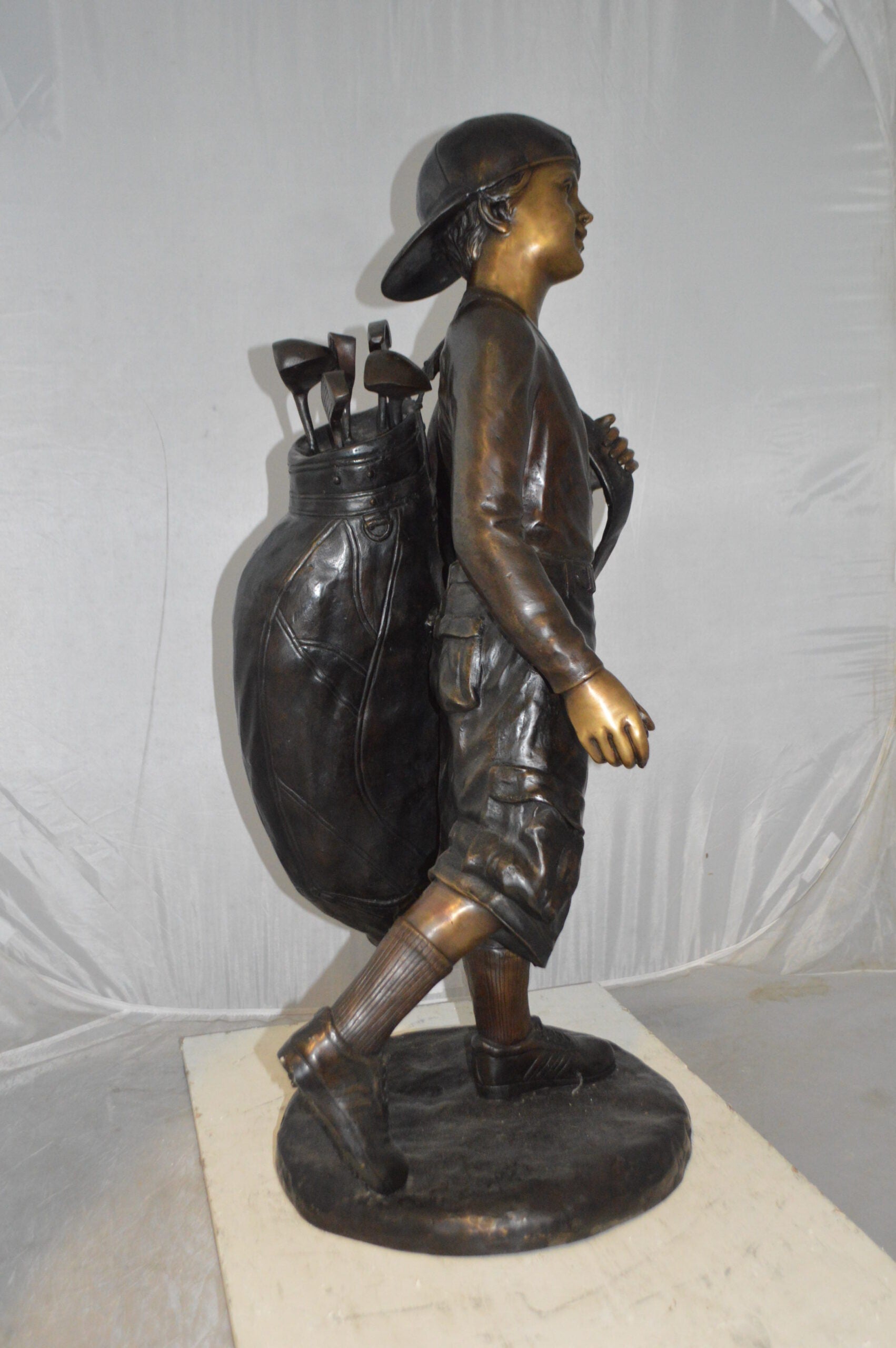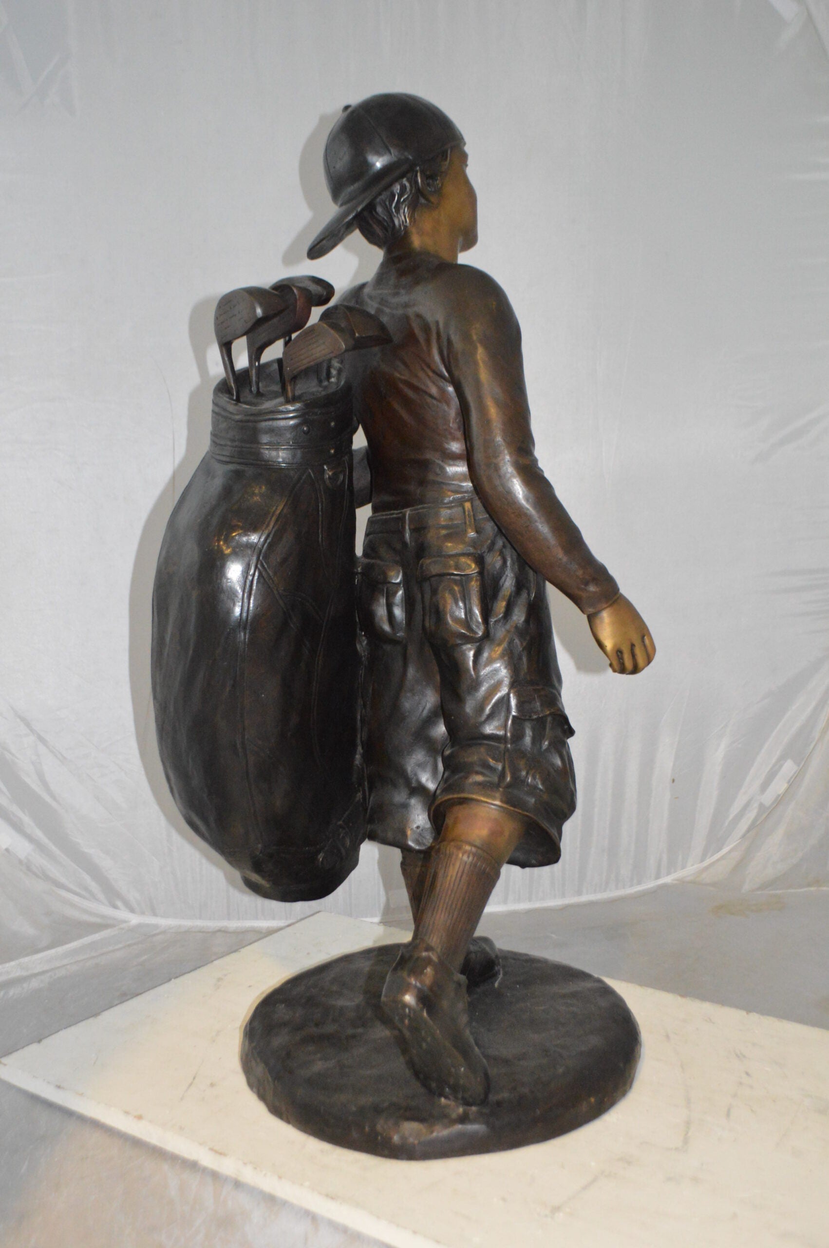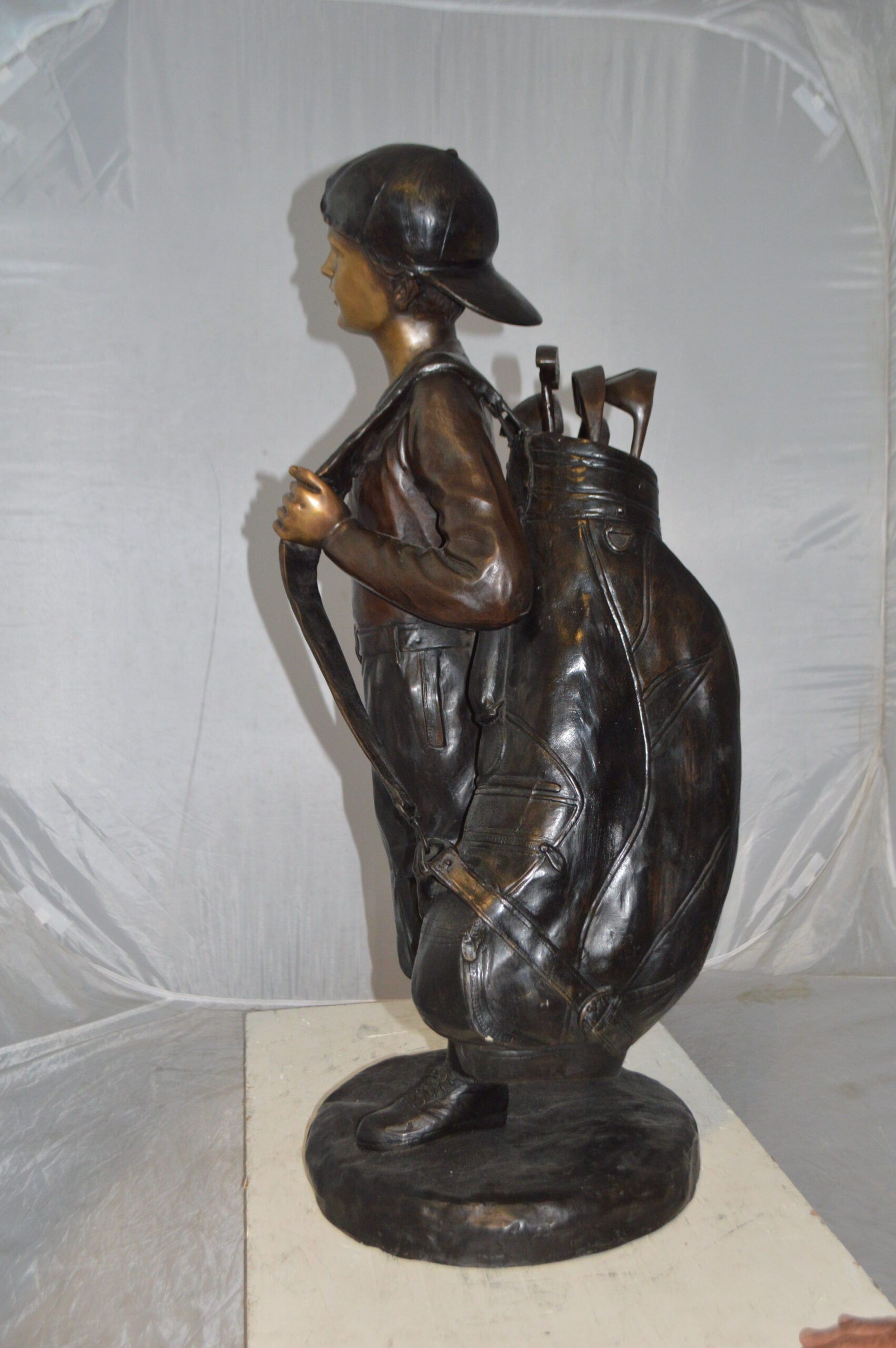 Enjoy this young boy carrying a Golf Bag Bronze Statue. Our impressive, 360-degree, large scale golfer carrying his golf bag statue is expertly finished with a hand-applied, classic bronze patina accented by and antiqued colored patinas to bring out the amazing detail is sure to be the garden or home focal point. Size: 15"L x 15"W x 38"H. Weight is: 50Lb
