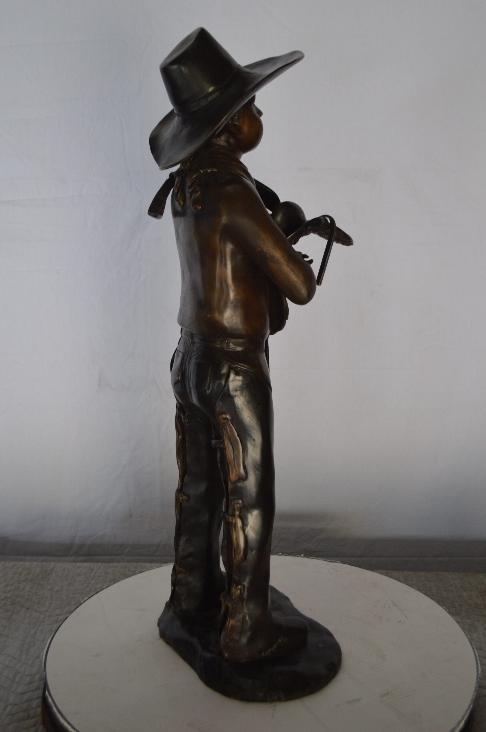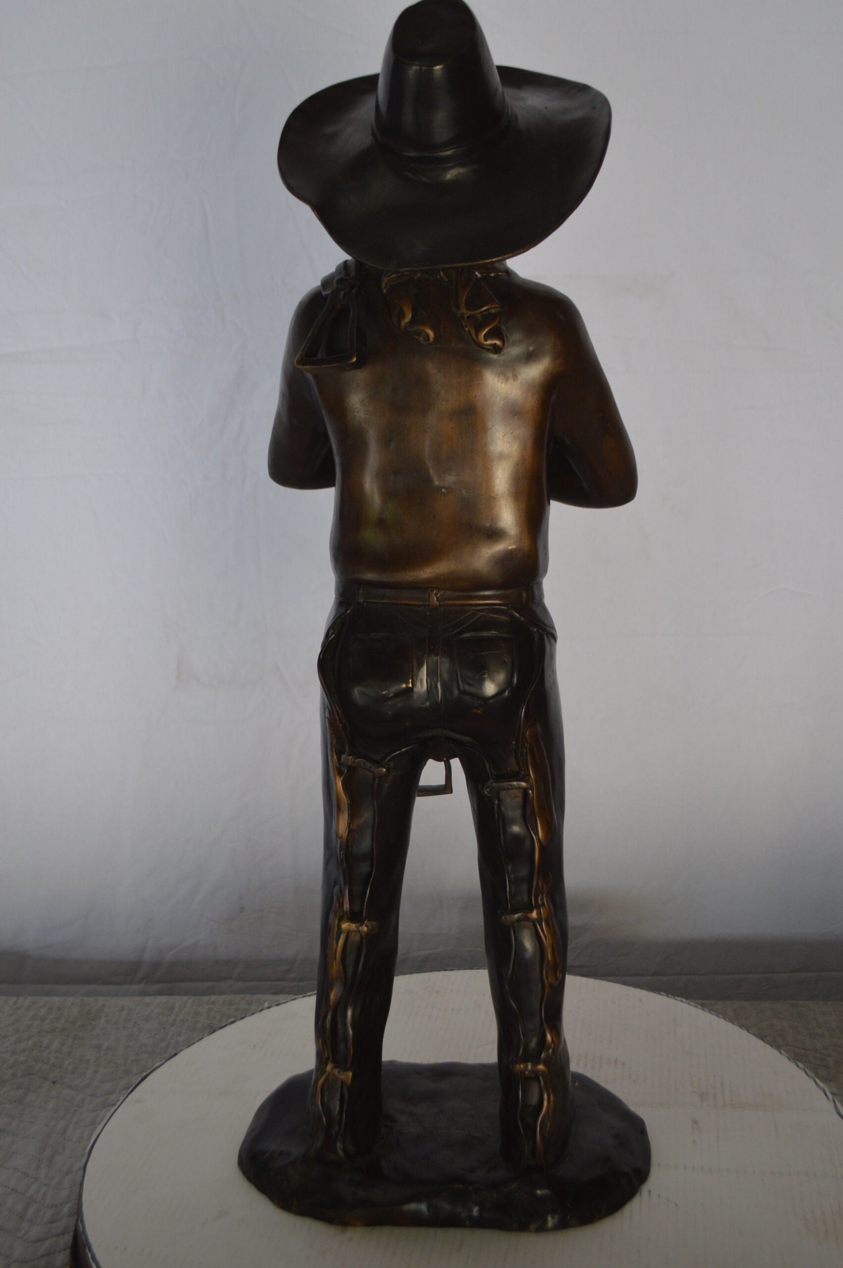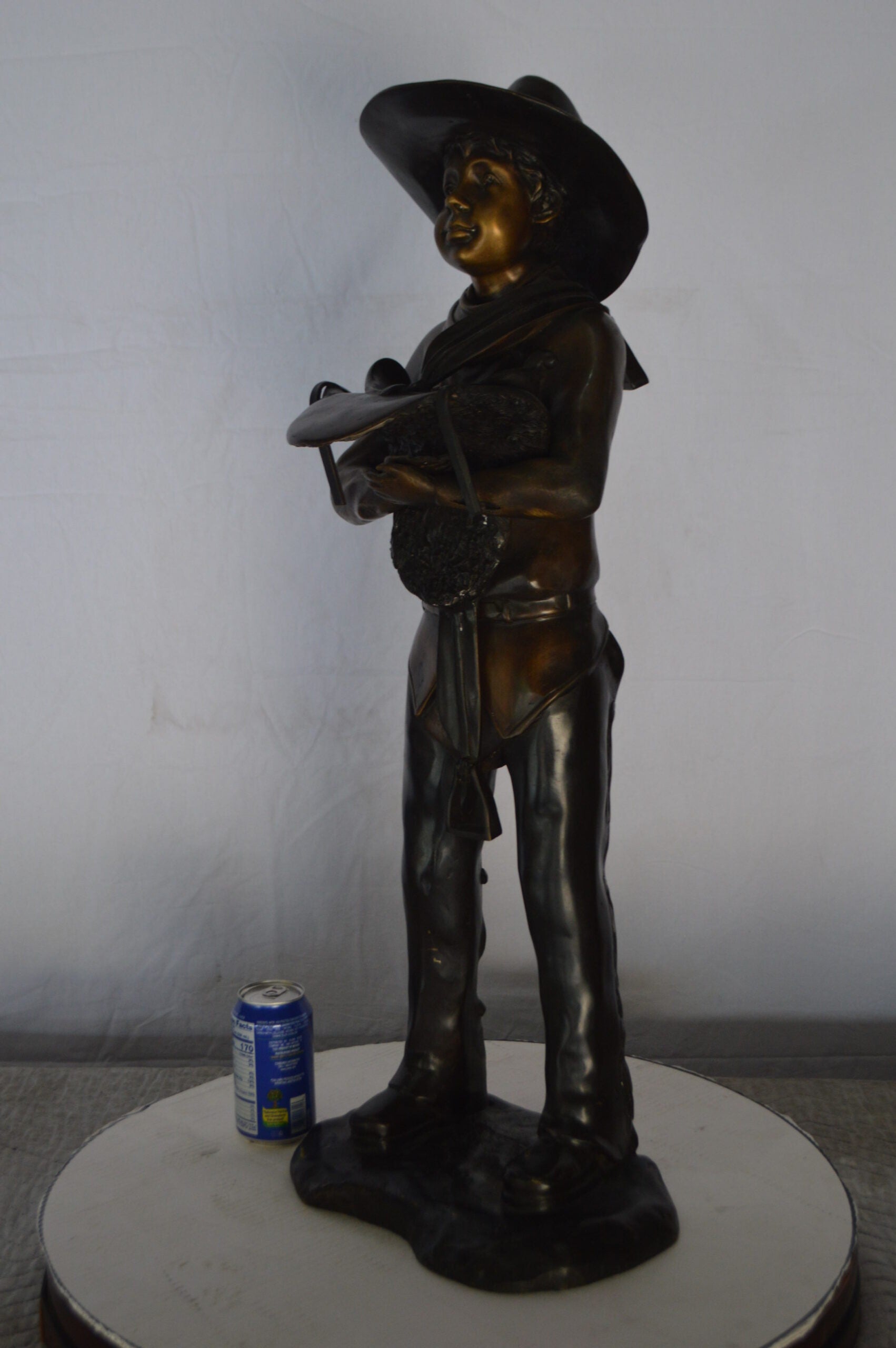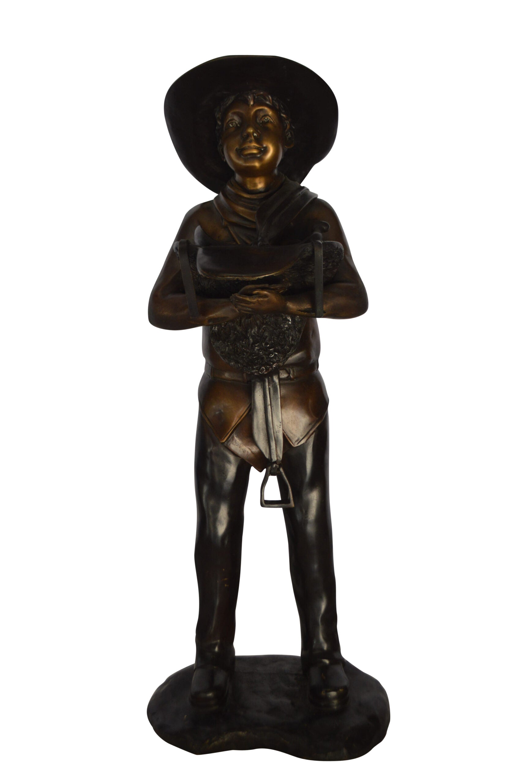 This statue depicts a multi-toned bronze statue mounted on a bronze base of a young Cowboy Holding a Saddle. The statue’s detailed face and body is finished with the traditional, hand-rubbed bronze finish truly bring this beautiful bronze statue to life. This bronze statue is cast in the traditional lost-wax method, which highlights the exceptionally fine detail and guarantees lasting heirloom beauty. Size: 12"L x 11"W x 32"H. Weight is: 30Lb