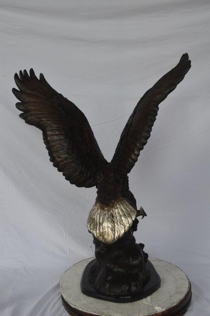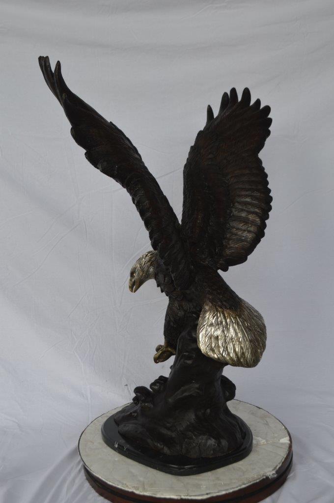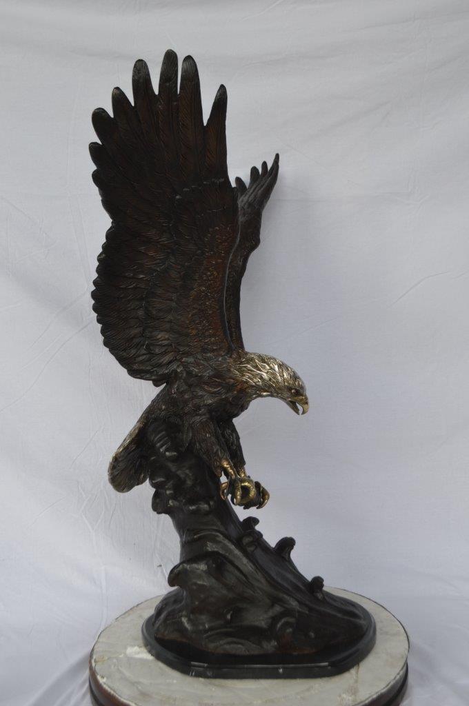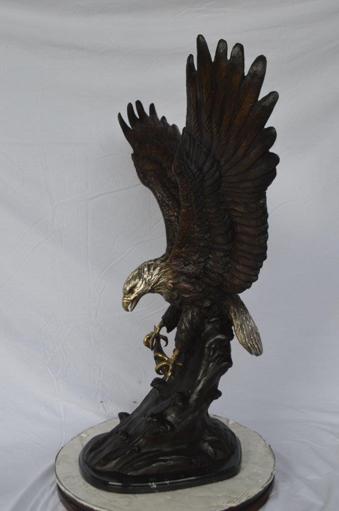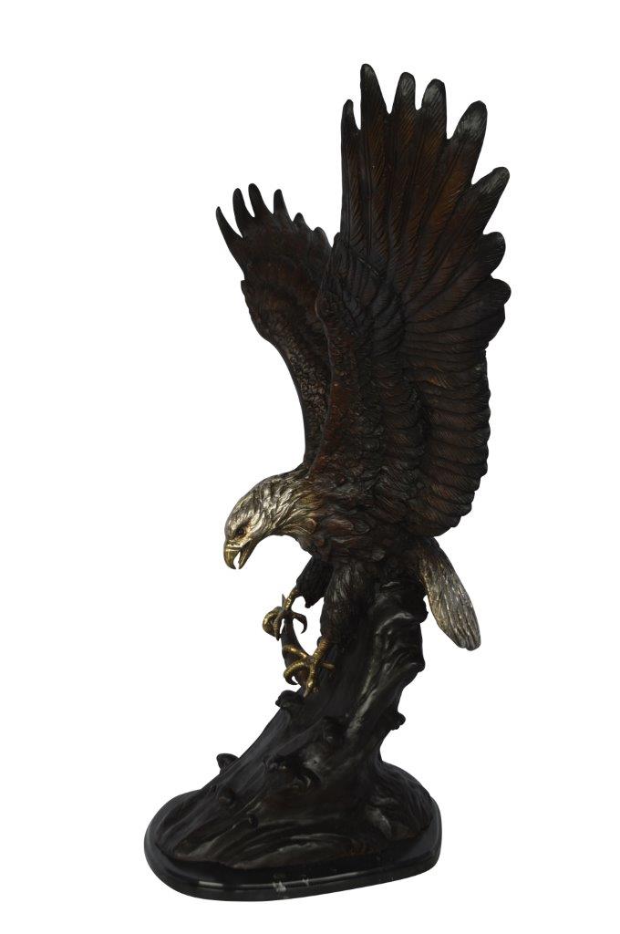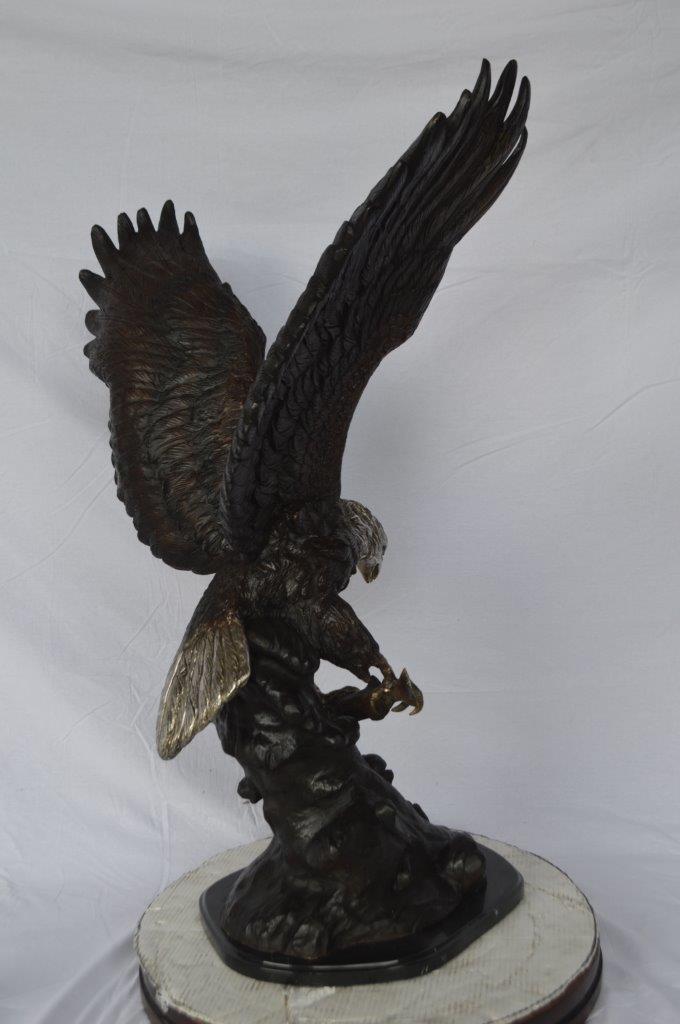 This charming medium size bronze statue depicts the American bald eagle. The eagle head captures the essence of the majestic bird of prey. The eagle's very large hooked beak (coated in a gold patina) is used for tearing flesh from their unfortunate prey. The extremely keen eyesight of the eagle stares out spotting a potential prey from a very long distance. Through the ages and different cultures, the eagle has represented spiritual protection, carrier of prayers, strength, courage, wisdom, illumination of spirit, healing. Size: 28"L x 18"W x 41"H. Weight is: 89Lb